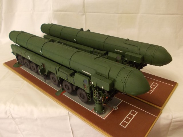 Представленная на фото модель - Тополь-Т. Краткая предистория: До 1985 года у нас был комплекс "Пионер", 15П645 - средней дальности. Пусковая установка шестиосная. С 1985 года на дежурство начали ставить комплексы межконтинентальной дальности 15П158.1 ("Тополь с точкой", "Тополь-Т"