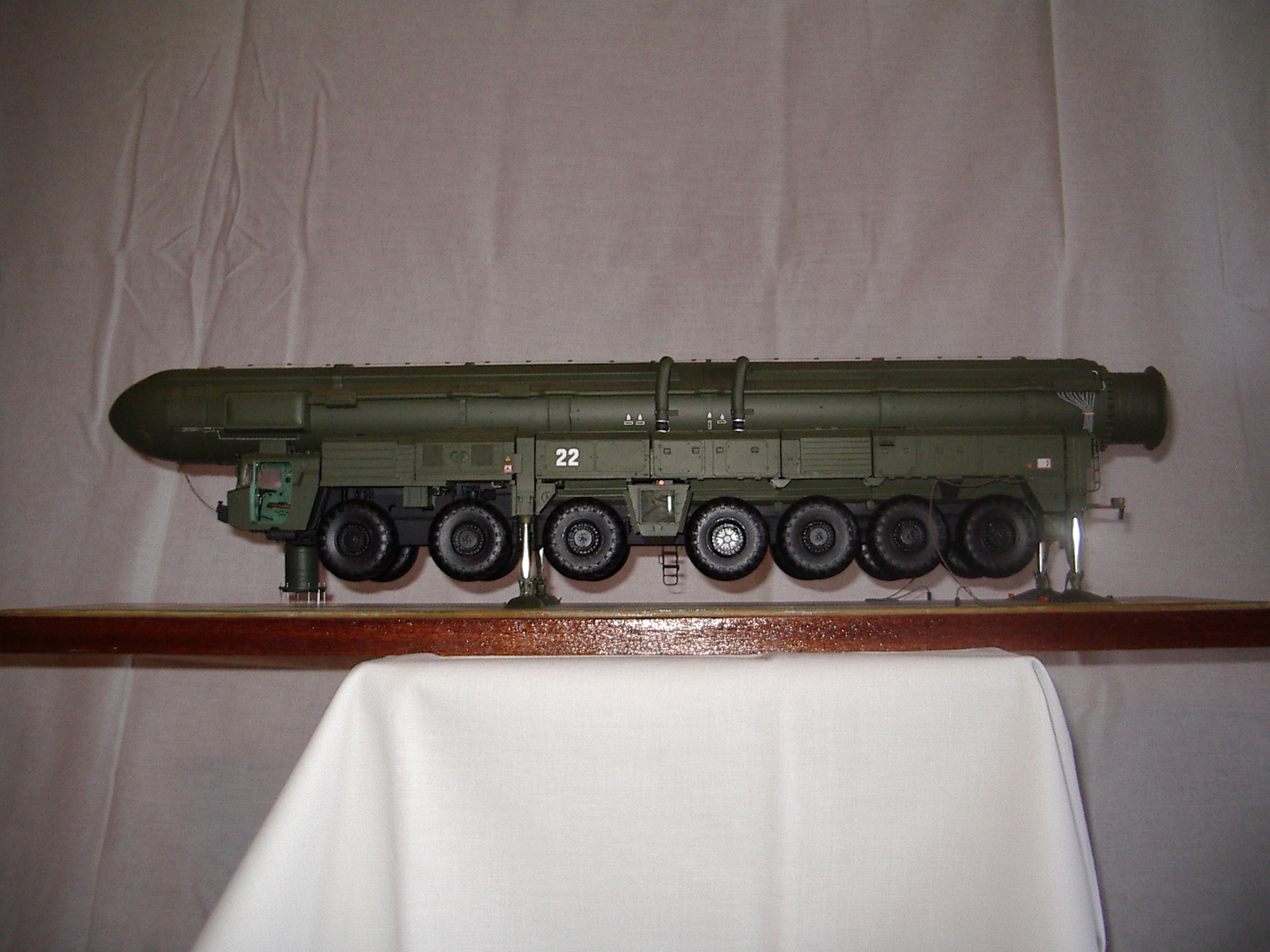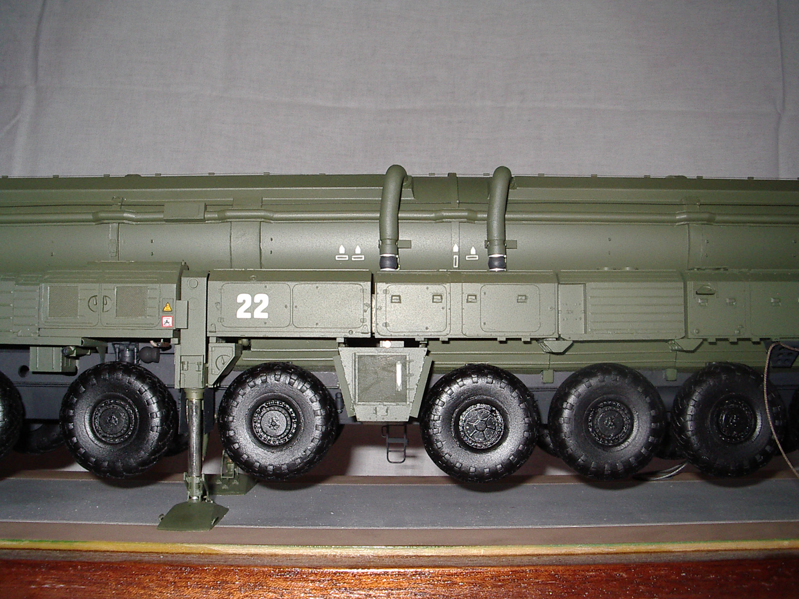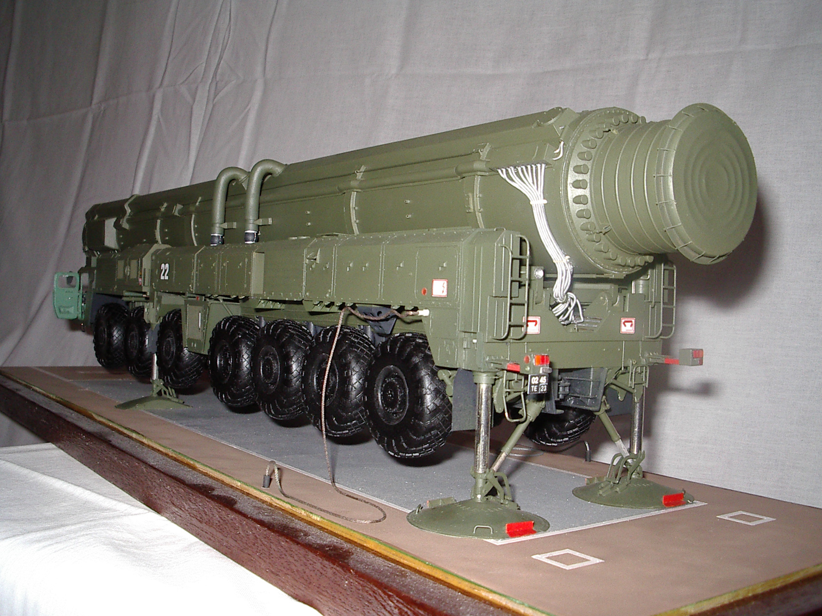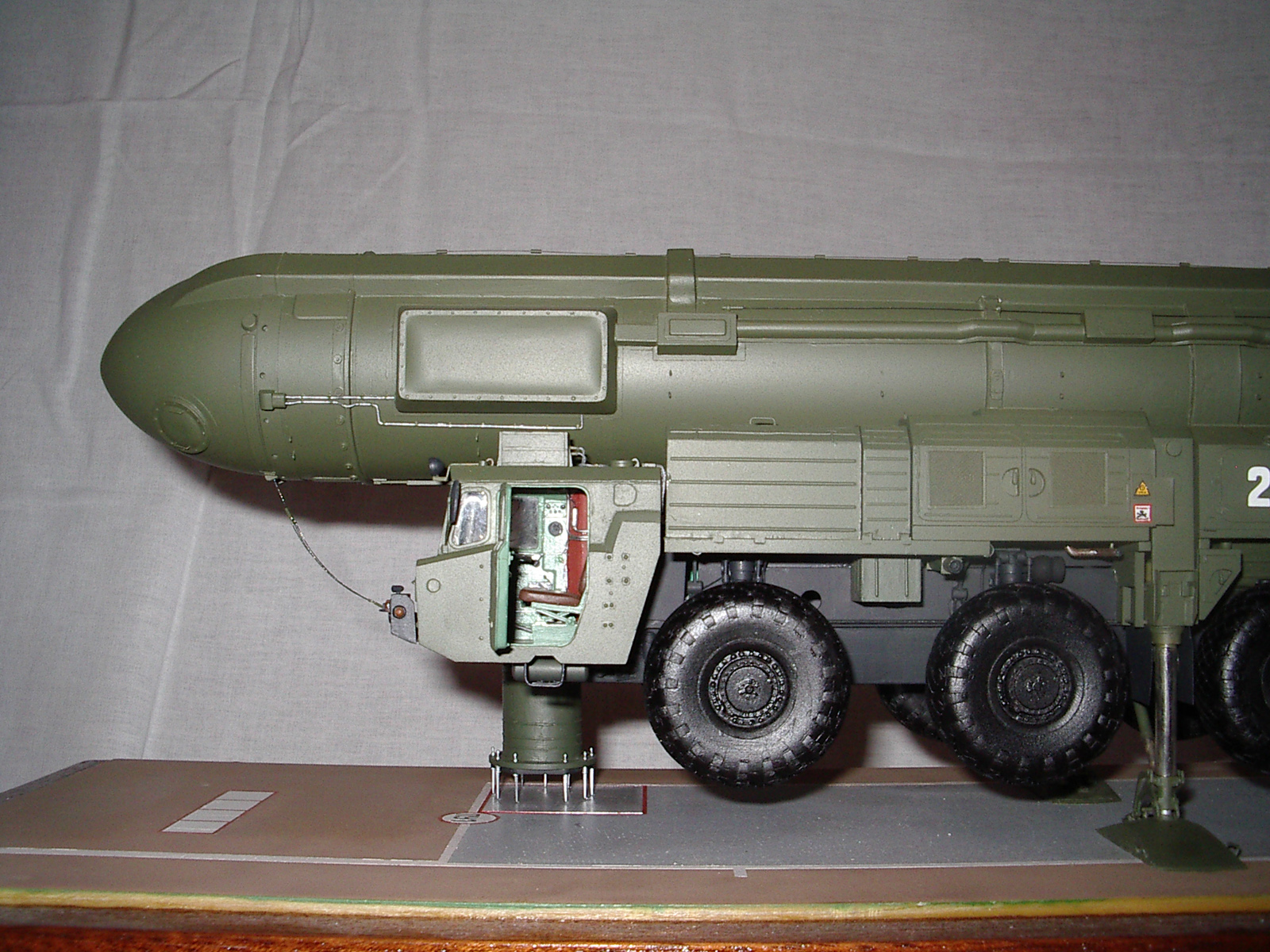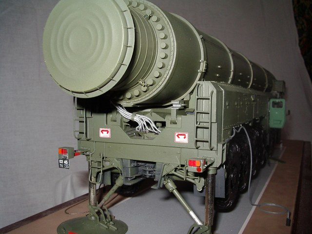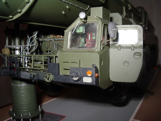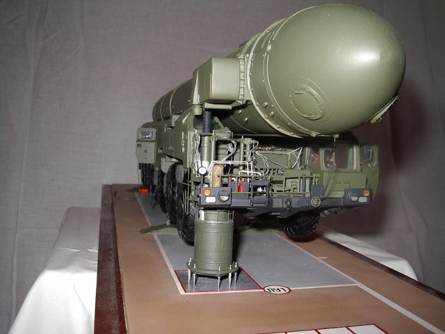 . Переходный вариант к "чистому" Тополю. Пусковая установка семиосная. Внешние отличия от "чистого" Тополя - кабина водителя одноместная от "Пионера", АГК перед кабиной командира, в середине агрегата с правой стороны бункер оператора. Именно эта модель и представлена на фото. С середины 90-х (точно не знаю) начали поступать в войска "чистые" Тополя - кабина водителя двухместная, позади водителя - место оператора, АГК позади кабины командира. Эту модель выпускает "Звезда" в 72 масштабе, Эти агрегаты были на параде в Москве (До Тополя-М). У Тополя-М пусковая установка восьмиосная, Опорные плиты домкратов складываются из двух частей и в свернутом состоянии смотрятся более компактно. Эту модель я и делаю в настоящее время.