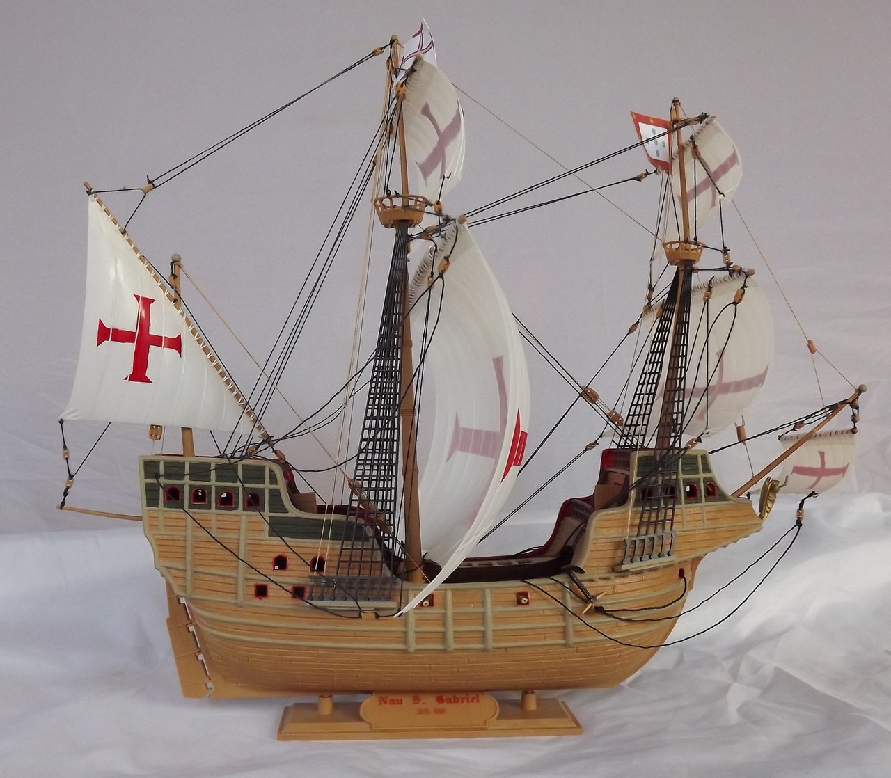 Модель собирал около двух месяцев. Окраска кистью акриловыми красками Tamiya. Такелаж согласно инструкции по сборке. Нитки заменены. Есть один косяк: потерян с помощью дочери и кота один якорь. Кресты на парусах пытался нарисовать через трафарет краской, но потом сделал из самоклеящейся бумаги.