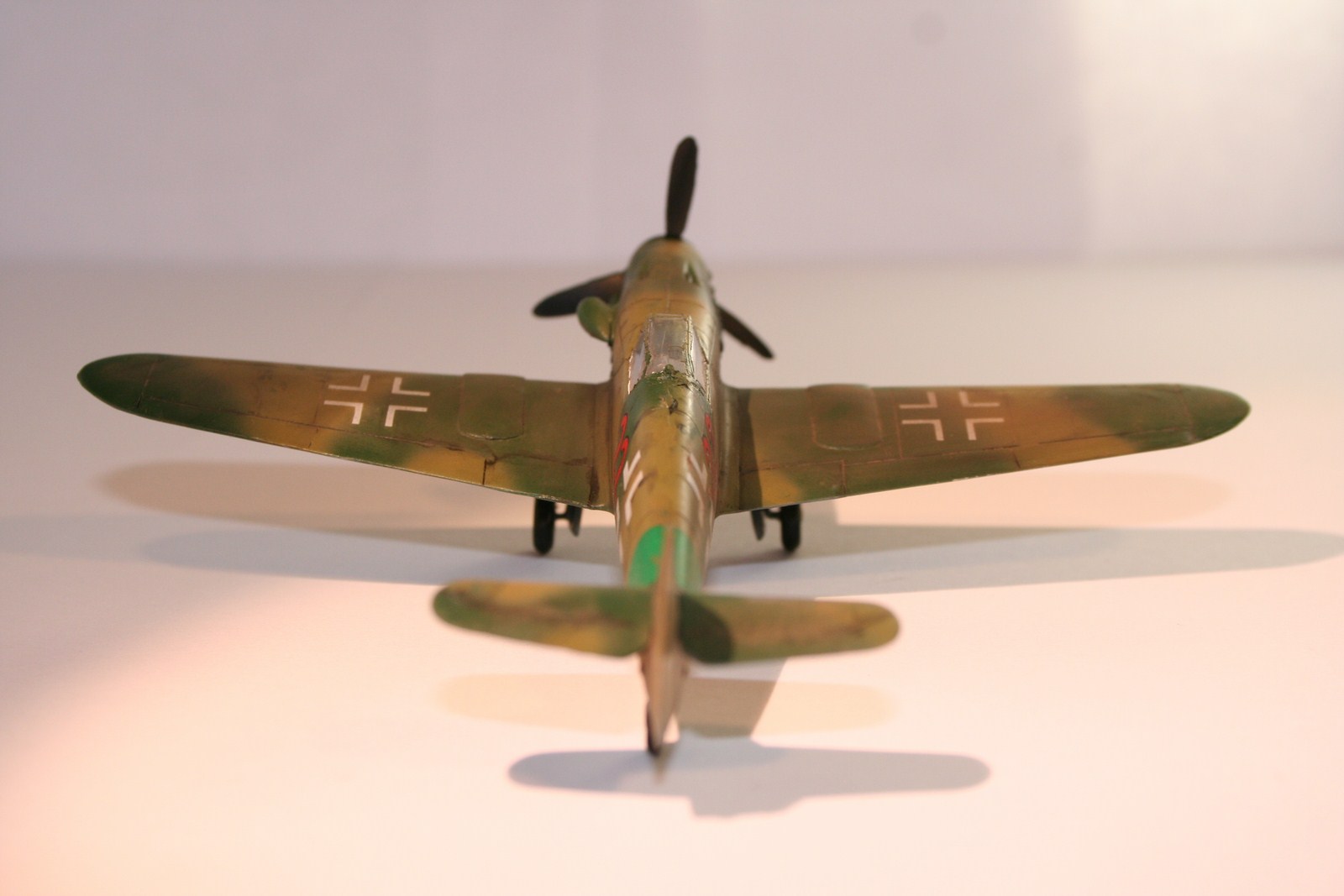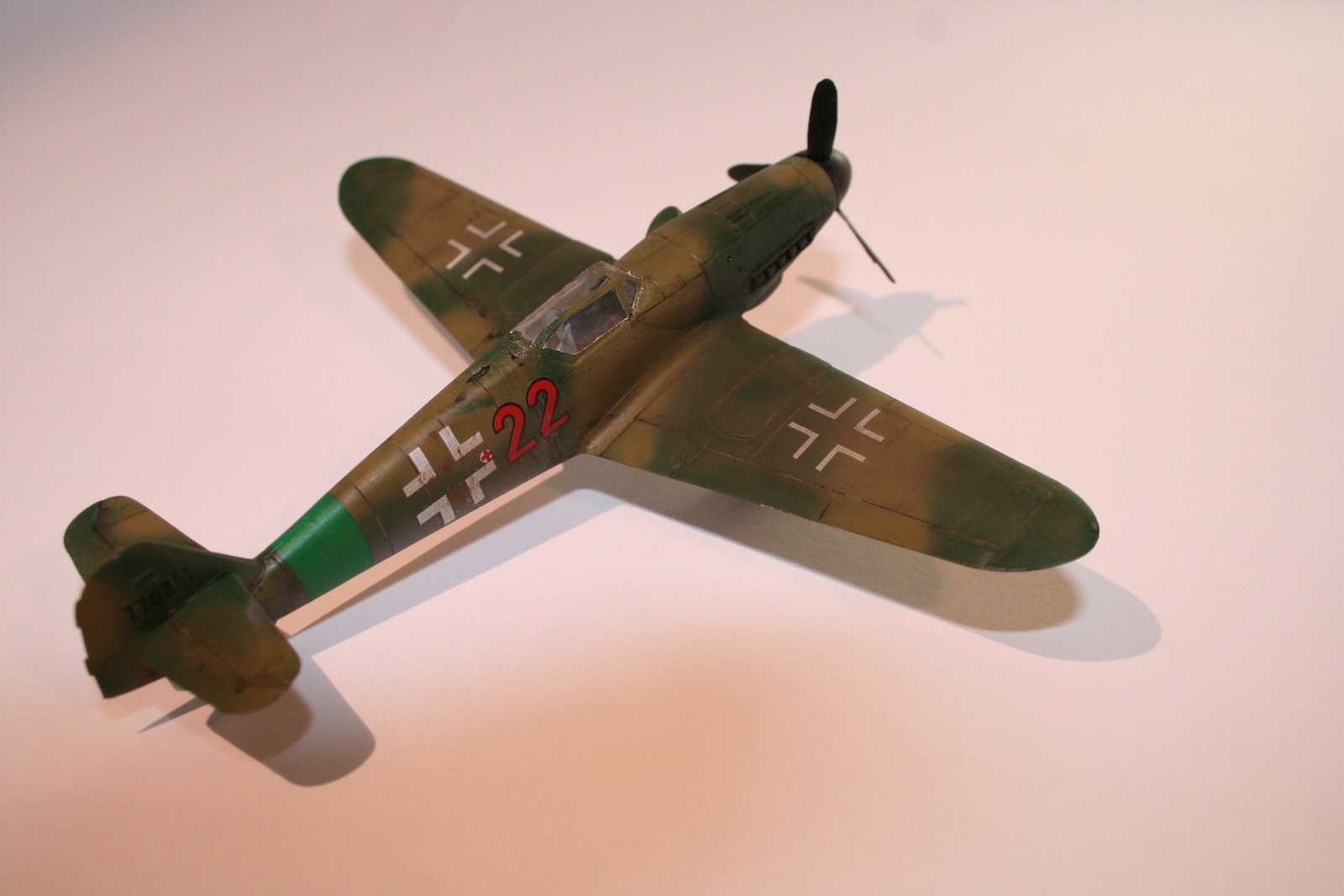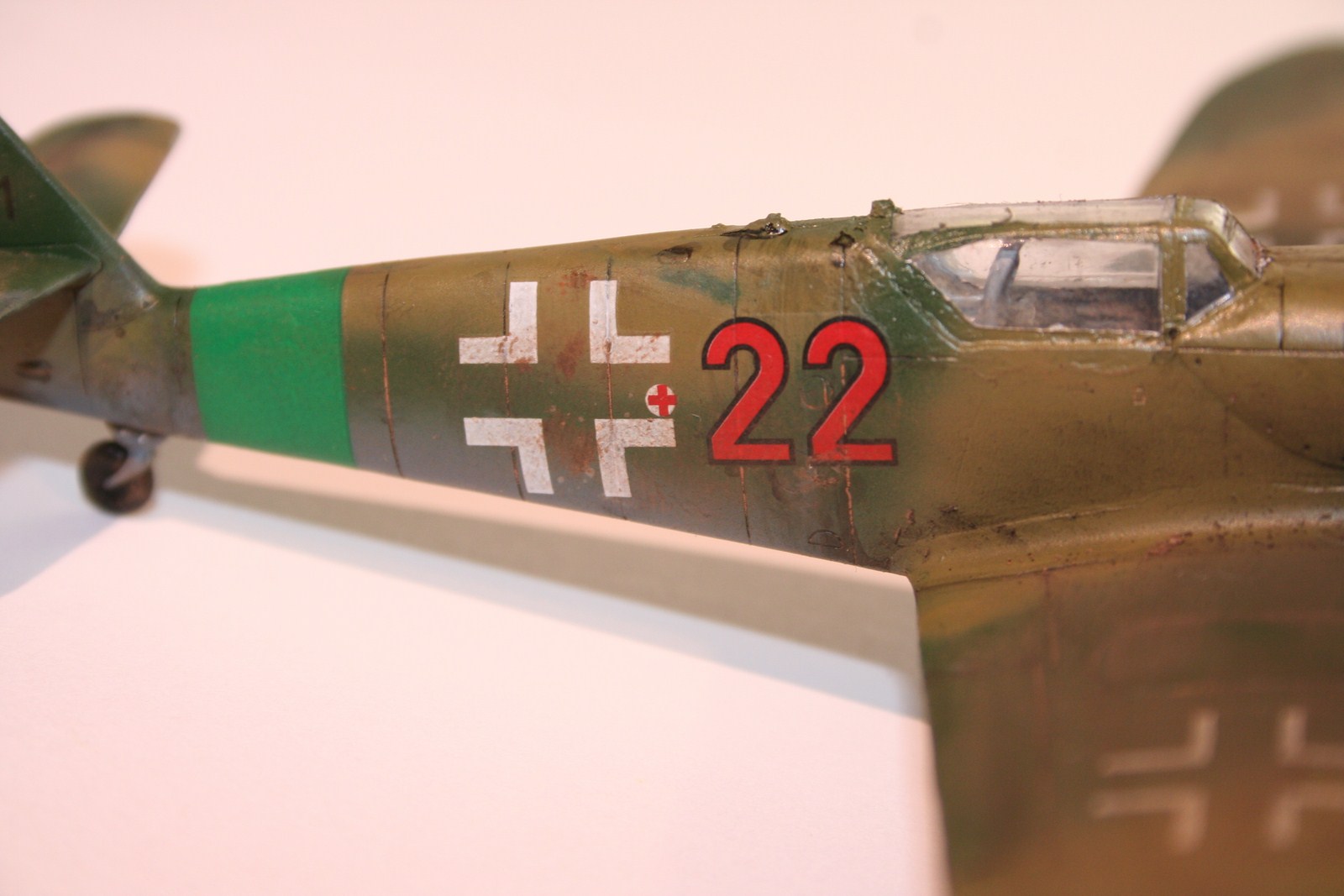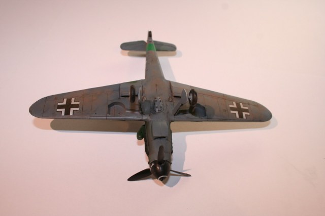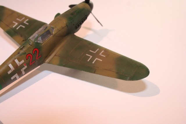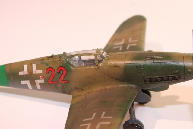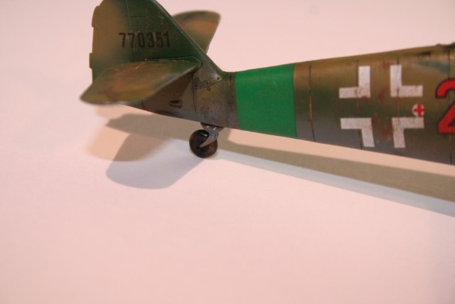 По основным параметрам оценивания моделей: по технике исполнения (лишние швы, разрывы в обшивке, отломаная антена, непонятные "лепешки" за нею, наклон стоек шасси и колеса удаленные от стоек в масштабе примерно на 0,3 метра...), по качеству окраски (с неравномерными слоями краски, особенно под кабиной, выходом краски за переплет...), по матчасти (тут полный "0" - цвета абсолютно не соответствуют RLM как по общему камуфляжу, так и по отдельным элементам (винт, стойки шасси, ниши, диски...)). Попытка использовать смывку, действительно оказалась неудачной. В общем оценивать пока нечего.