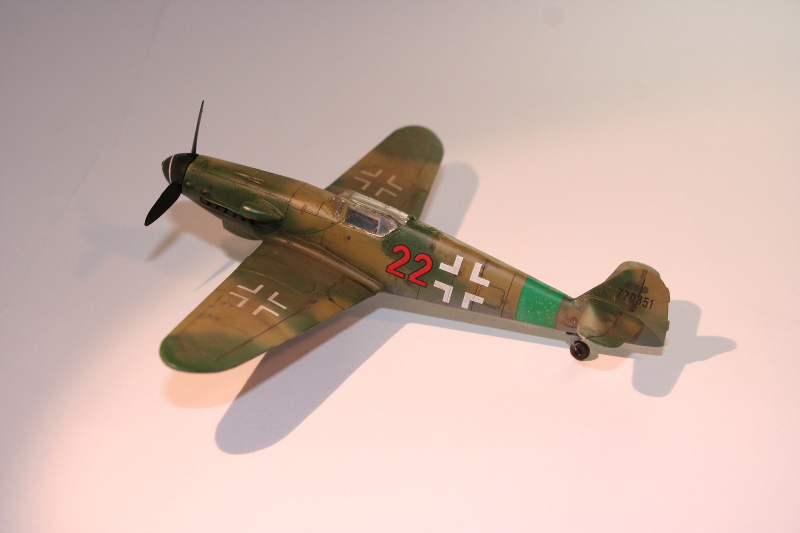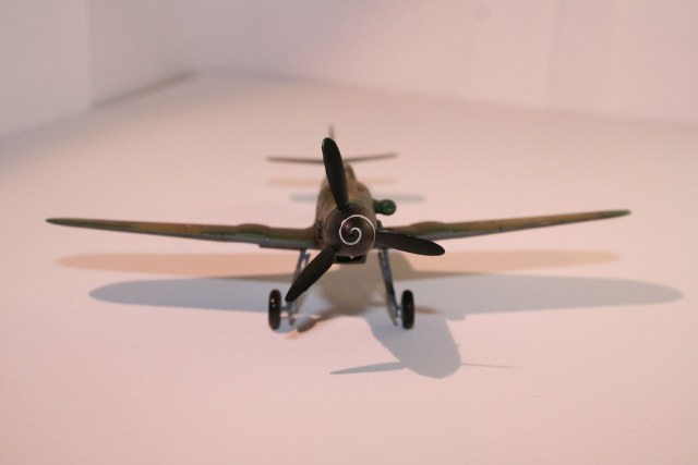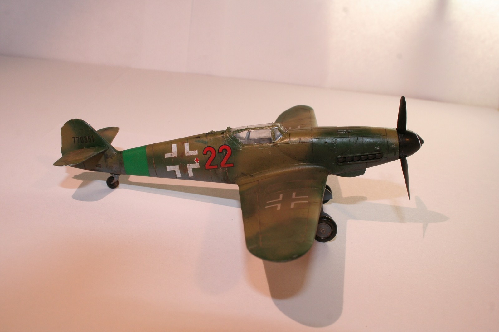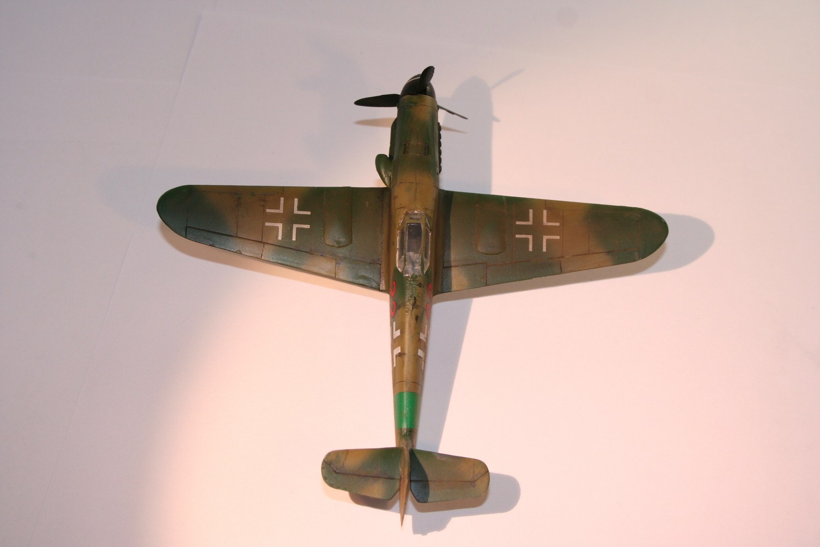 По основным параметрам оценивания моделей: по технике исполнения (лишние швы, разрывы в обшивке, отломаная антена, непонятные "лепешки" за нею, наклон стоек шасси и колеса удаленные от стоек в масштабе примерно на 0,3 метра...), по качеству окраски (с неравномерными слоями краски, особенно под кабиной, выходом краски за переплет...), по матчасти (тут полный "0" - цвета абсолютно не соответствуют RLM как по общему камуфляжу, так и по отдельным элементам (винт, стойки шасси, ниши, диски...)). Попытка использовать смывку, действительно оказалась неудачной. В общем оценивать пока нечего.