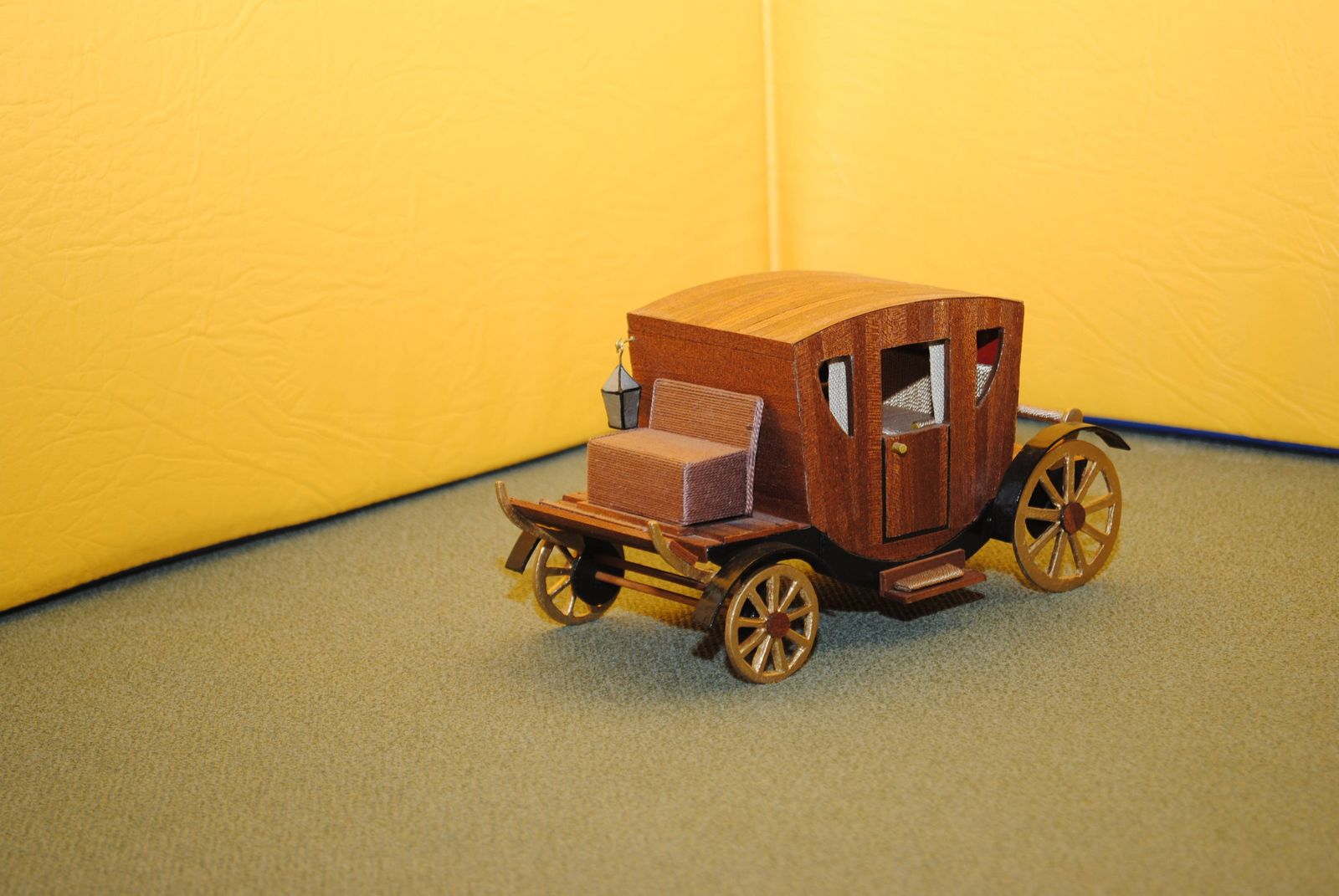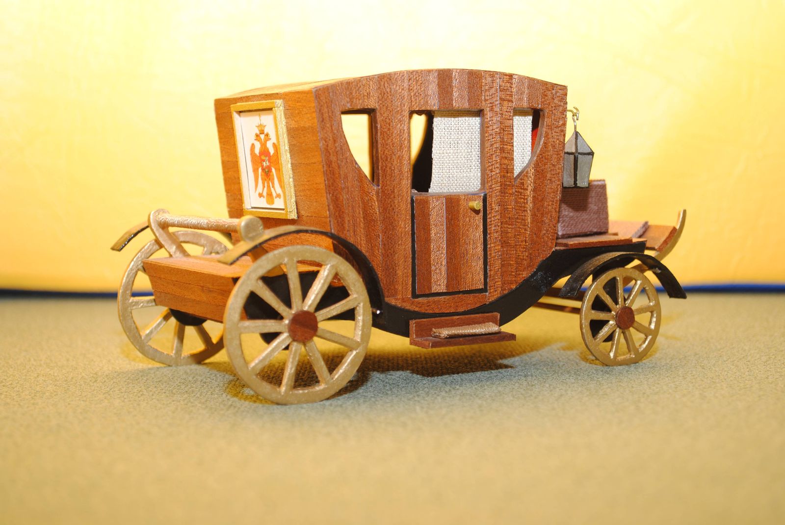С национальным гербом могли едить только цари....надо доделать малость....из черной матовой бумаги набить обода на колеса....придумать как изобразить шляпки гвоздей....застеклитить салон....