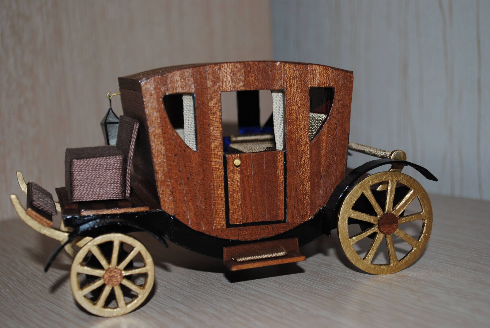 Это моя первая модель, которую я размещаю на Вашем сайте. Карету сделала из картона, потом подсмотрела что можно обклеить рейками сапели. Купила журнал с дополнениями, там оказалось 20 реек, так раз хватило). Краска «невская палитра». Салон обклеен синей и красной пленкой. Внутри салона шпага, крест, диван. Жалко не видно)