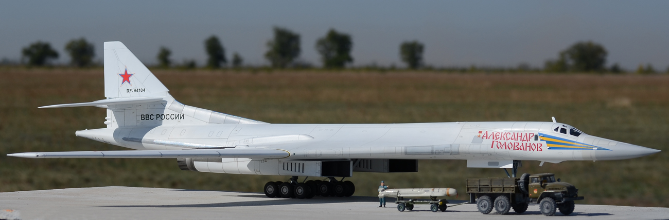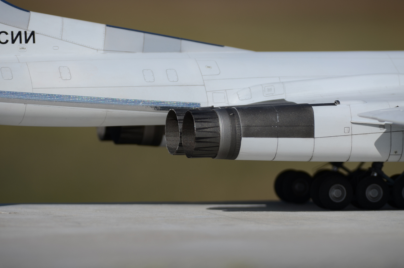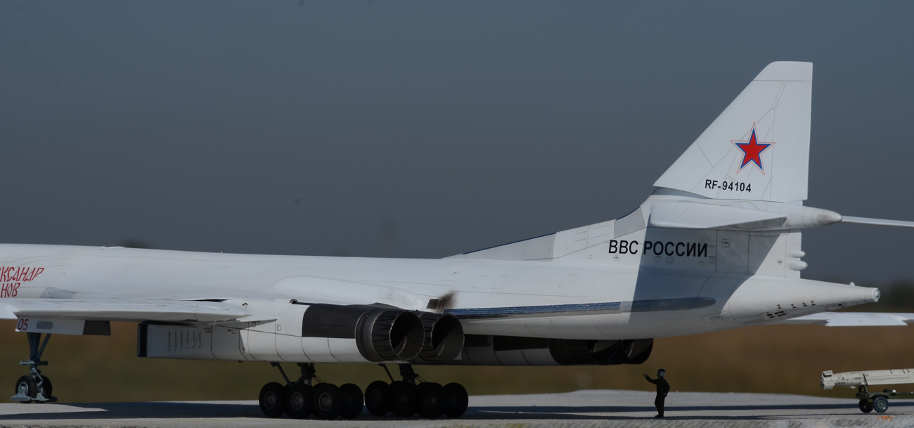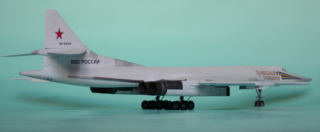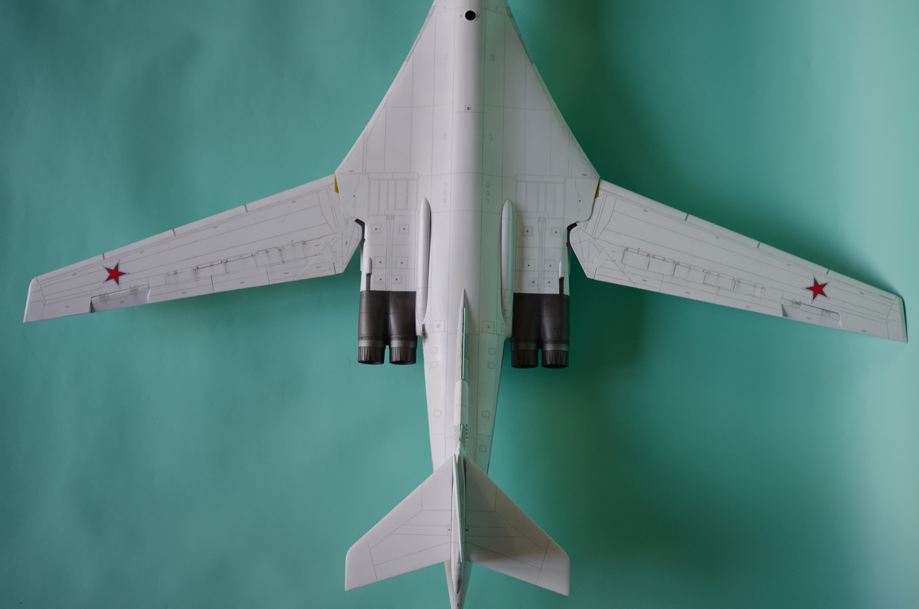 Привет, любителям моделей! Вот доделал модель для знакомого военного, который служит на энгельсской авиабазе. Сначала договорились, что просто красим и все, но я все-таки выпендрился и сделал некоторые доработки: сопла из жестянки, огни БАНО, трубки на стойках. К сожалению я забыл про зеркала возле аварийных люков штурманов. Я их конечно доделаю, но фотогра-ть на природу уже не поеду. Работа длилась долго, много-чего переделывал. Например, эксперимент с нов. краской из баллона закончился печально- пластик сильно "съело". Когда выбрали борт №5, он был чистый и аккуратный, а в наст. время он изрядно потрепан (прикрепил фото наст. борта, сделанное 16 сентября).Из-за того, что у меня объектив 55-200мм, сложно было сфотать самолет (вид сверху и вид снизу) целиком, поэтому пришлось частями.