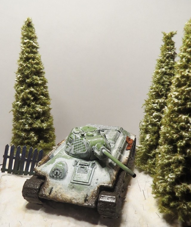 Снег на ёлках уже почти сошёл, да и под гусеницами танка видны грязные проталины.... а это значит, что снег уже просевший и очень липкий. В этом случае на гусеницах и на катках должны оставаться большие и довольно грязноватые комки.