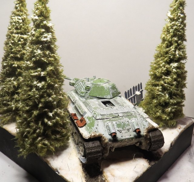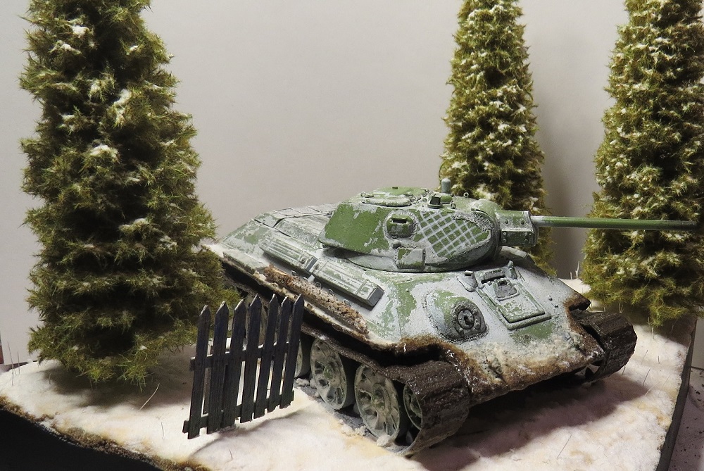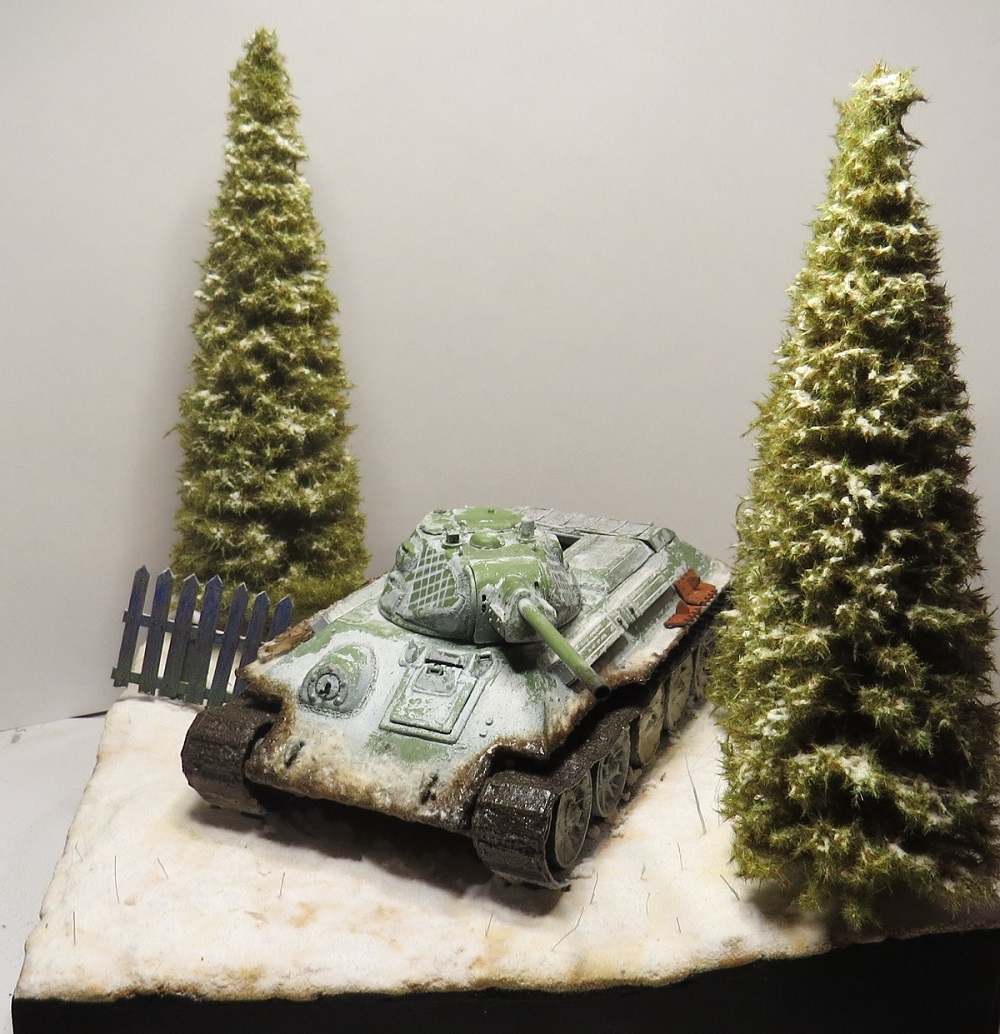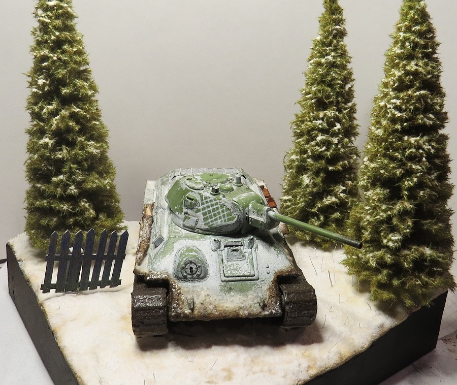 Люк на МТО потеряли? Думаю это вряд ли могло быть. Трак бросается ржавчиной по отношению ко всему,а гусянку обмазали шоколадом?Если грязь, то где следы, судя по снегу давно уже зима. Опять же забор не к месту, вроде лес, судя по елкам... А с другой стороны, работа проделана не малая. Может чуток не хватило сопряжения танка и основания. Лично я диораму пока не осиливаю.