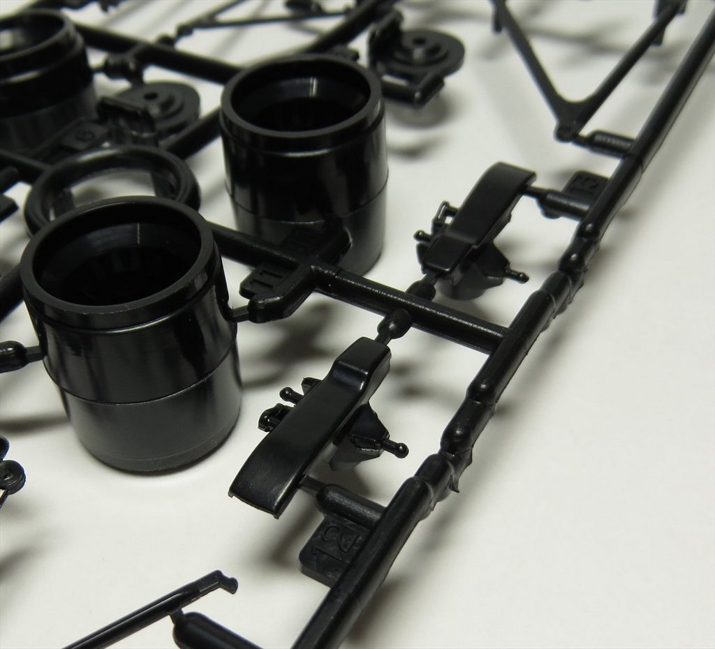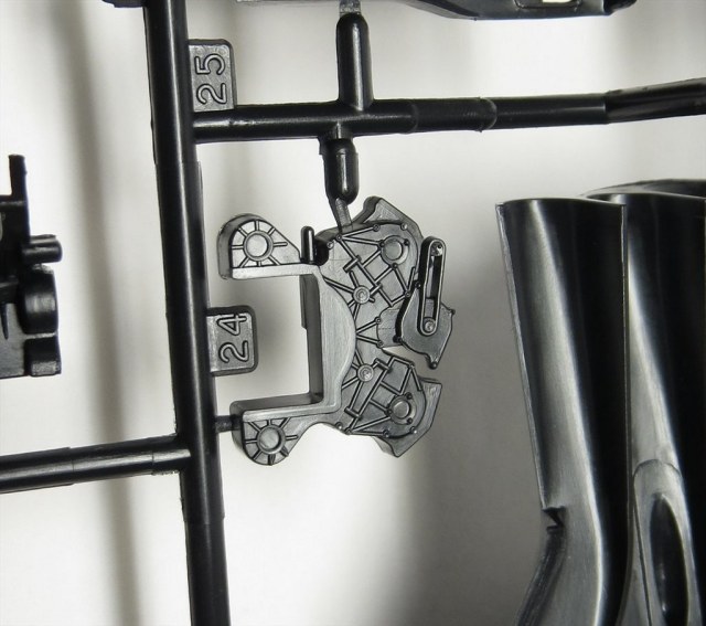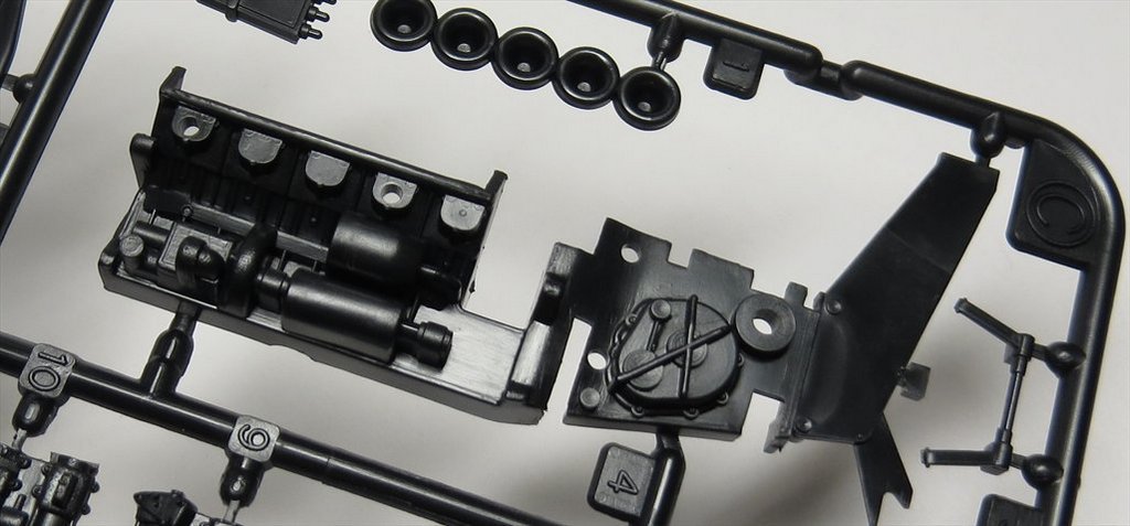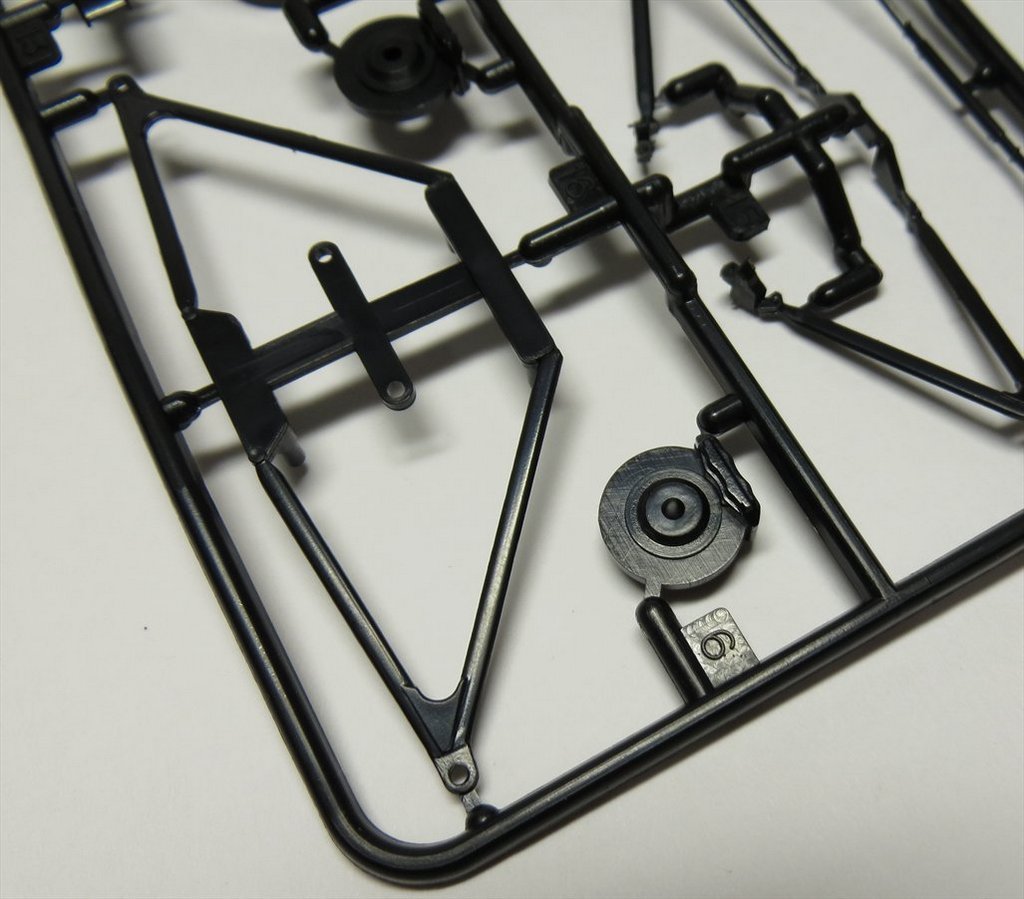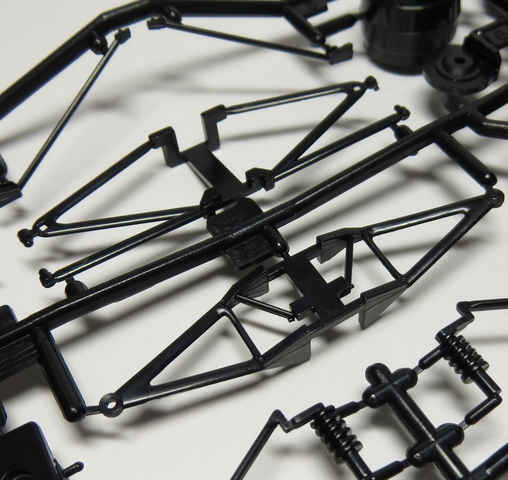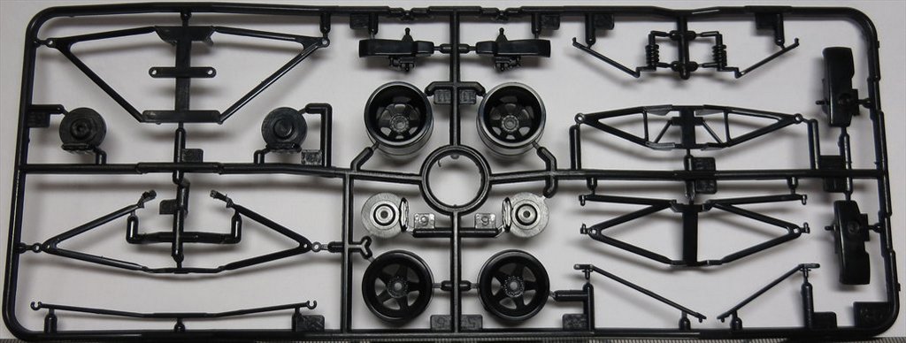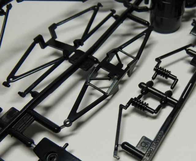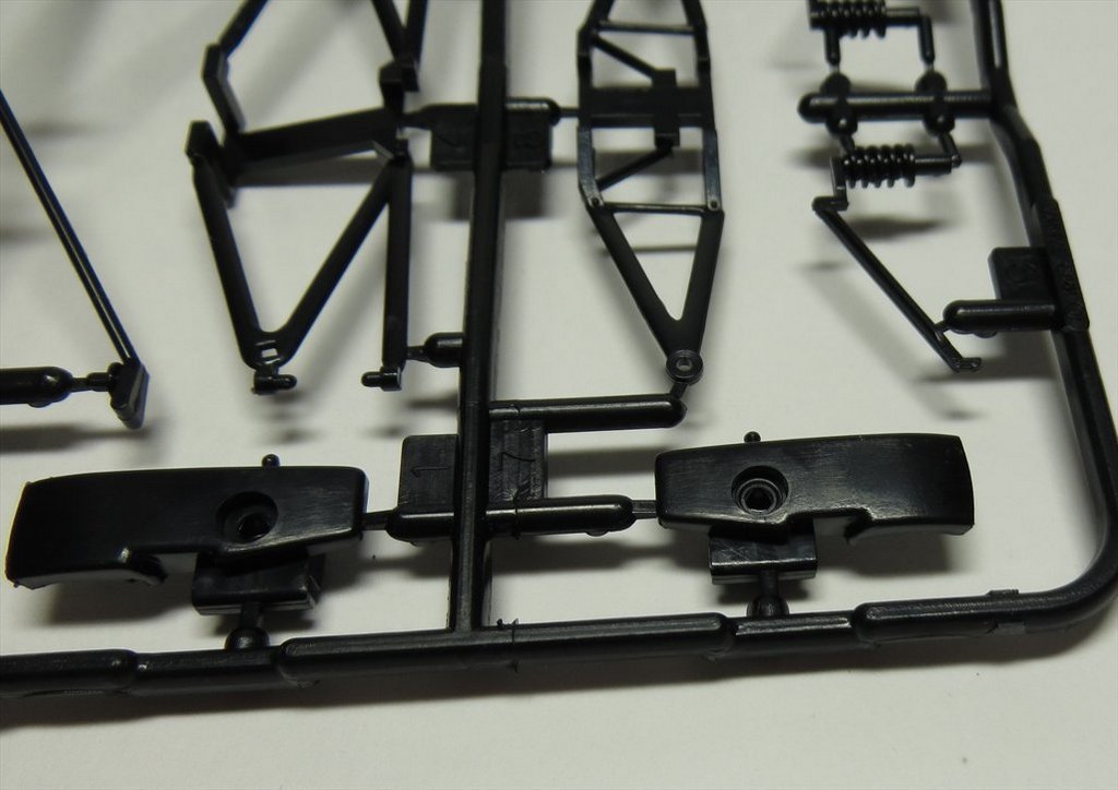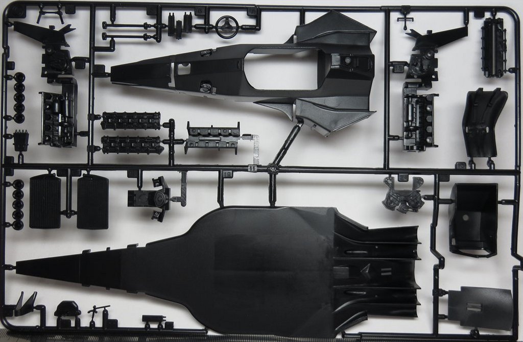 - 2 литника чёрного пластика, тут интереснее ( Один литник содержит в себе сам монокок гонщика, днище, сиденье гонщика, бензобак, элементы двигателя, радиаторы и немного мелочёвки. Второй литник с элементами подвески, тормозными дисками, колёсными дисками и воздухозаборниками для охлаждения тормозных механизмов ).
