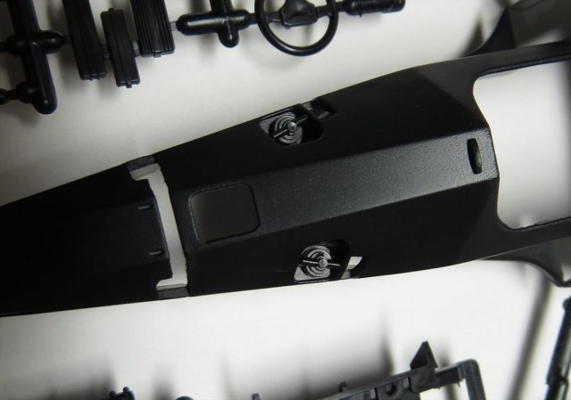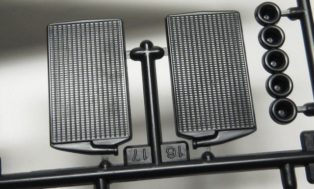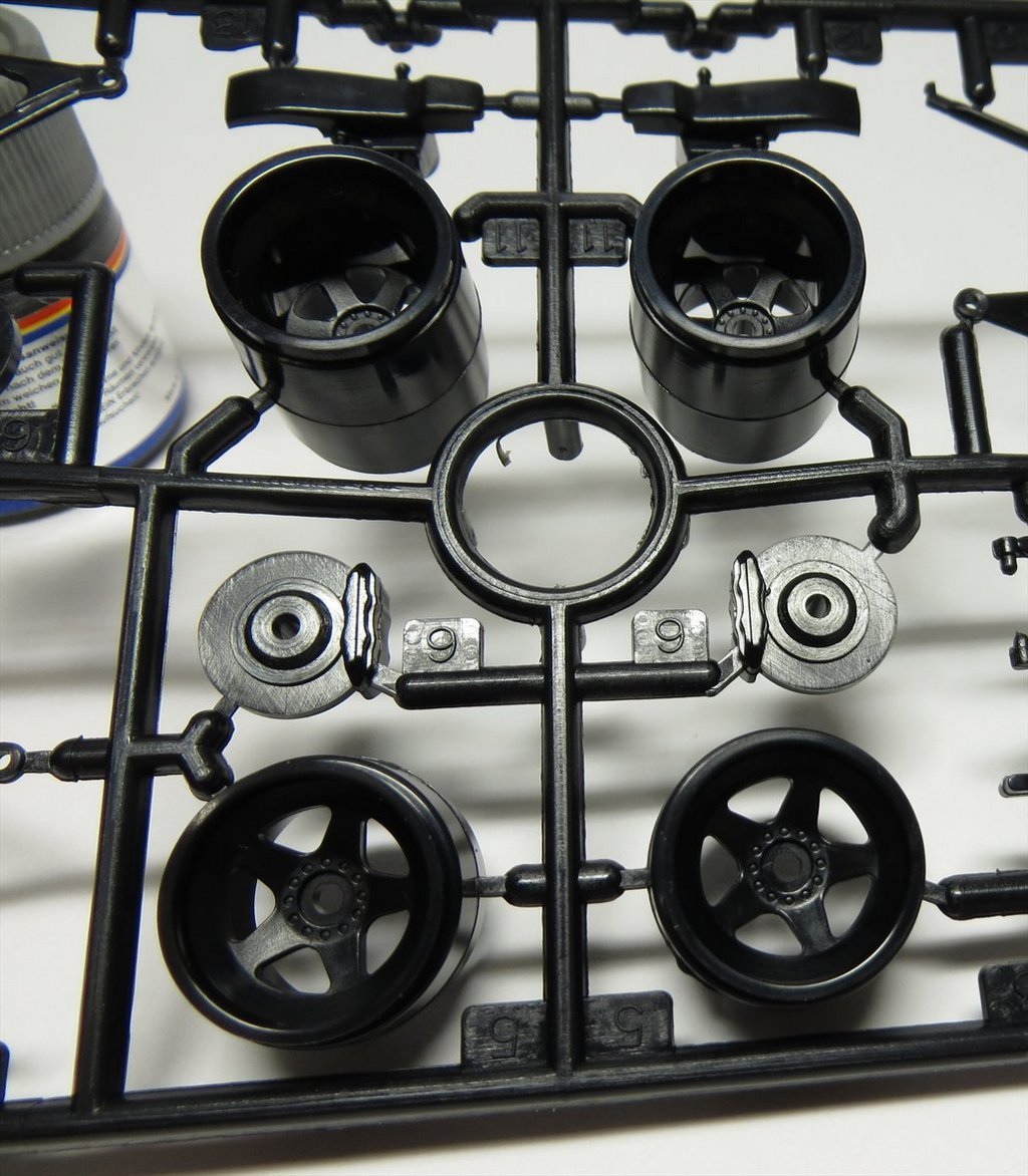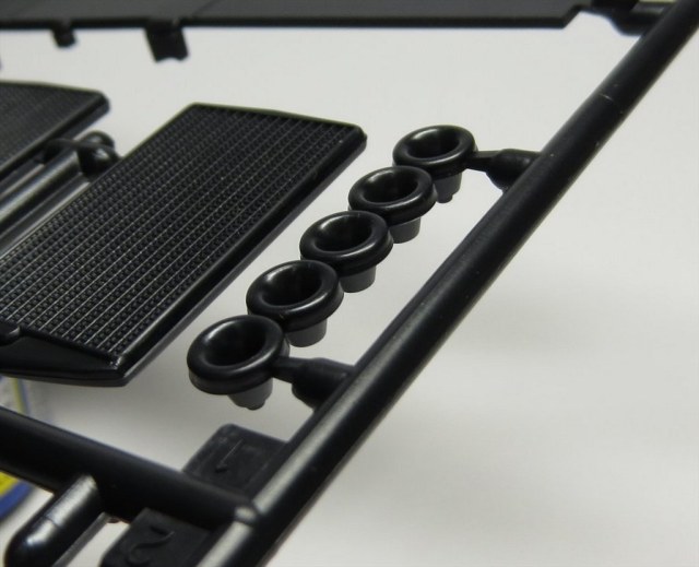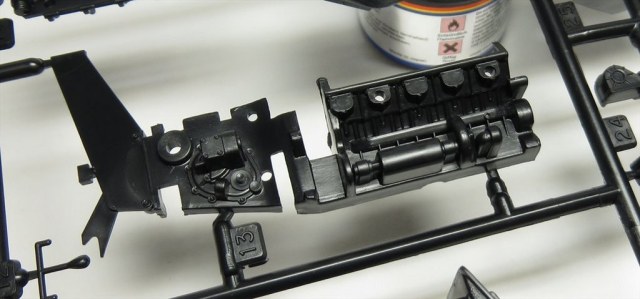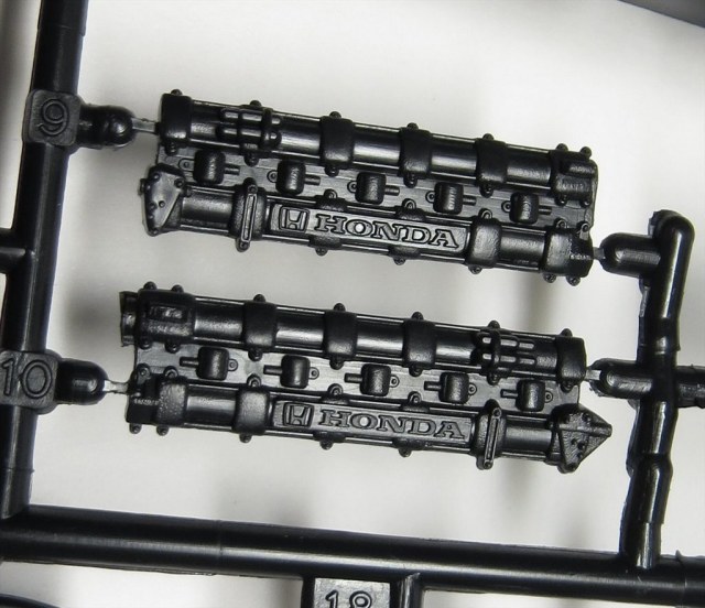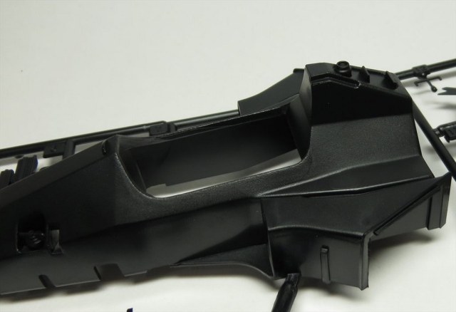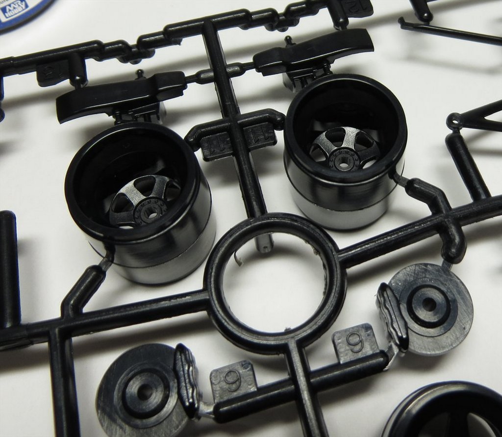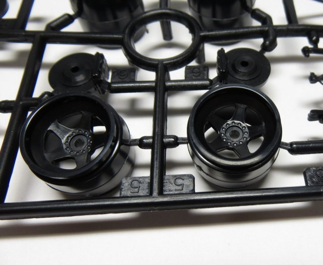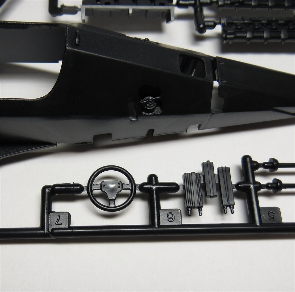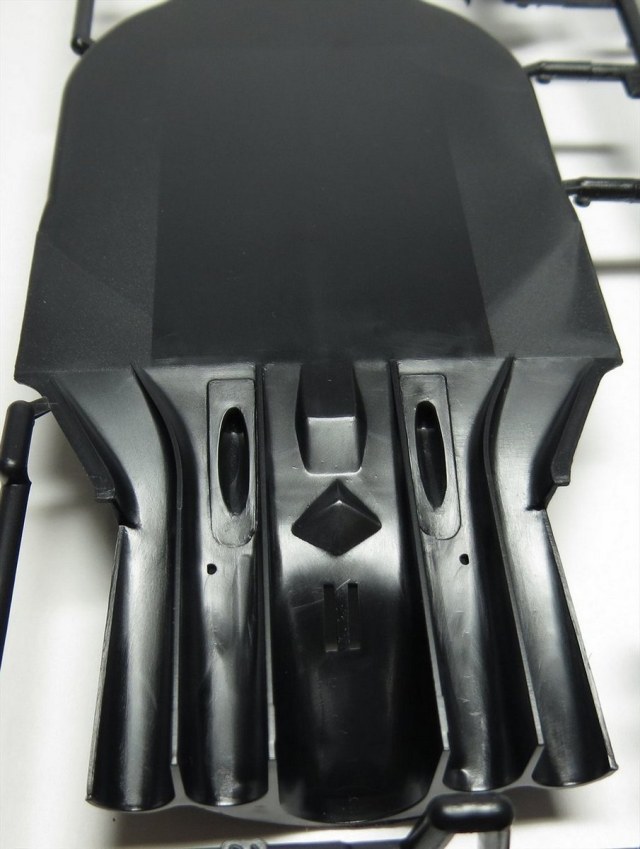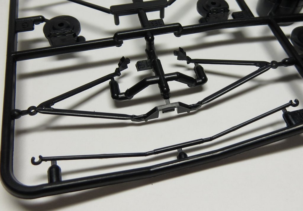 - 2 литника чёрного пластика, тут интереснее ( Один литник содержит в себе сам монокок гонщика, днище, сиденье гонщика, бензобак, элементы двигателя, радиаторы и немного мелочёвки. Второй литник с элементами подвески, тормозными дисками, колёсными дисками и воздухозаборниками для охлаждения тормозных механизмов ).