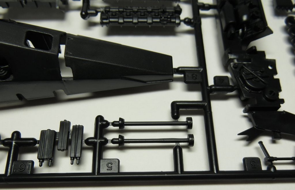 По качеству, набор меня не особо порадовал, видимо наборчик давнишний, его просто запихали в новую коробочку и вложили туда свежую декаль. Формы видимо уже заезженные, отсюда и небольшой облой, присутствуют неровности на поверхности некоторых деталей, собственно всё можно посмотреть на фото. Белый литник сфотографировал как смог, фотографировать что-то белое одно мучение, вот с чёрным совсем другое дело.