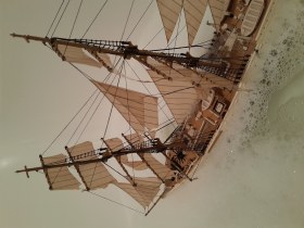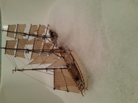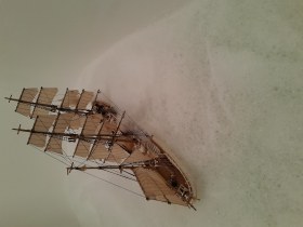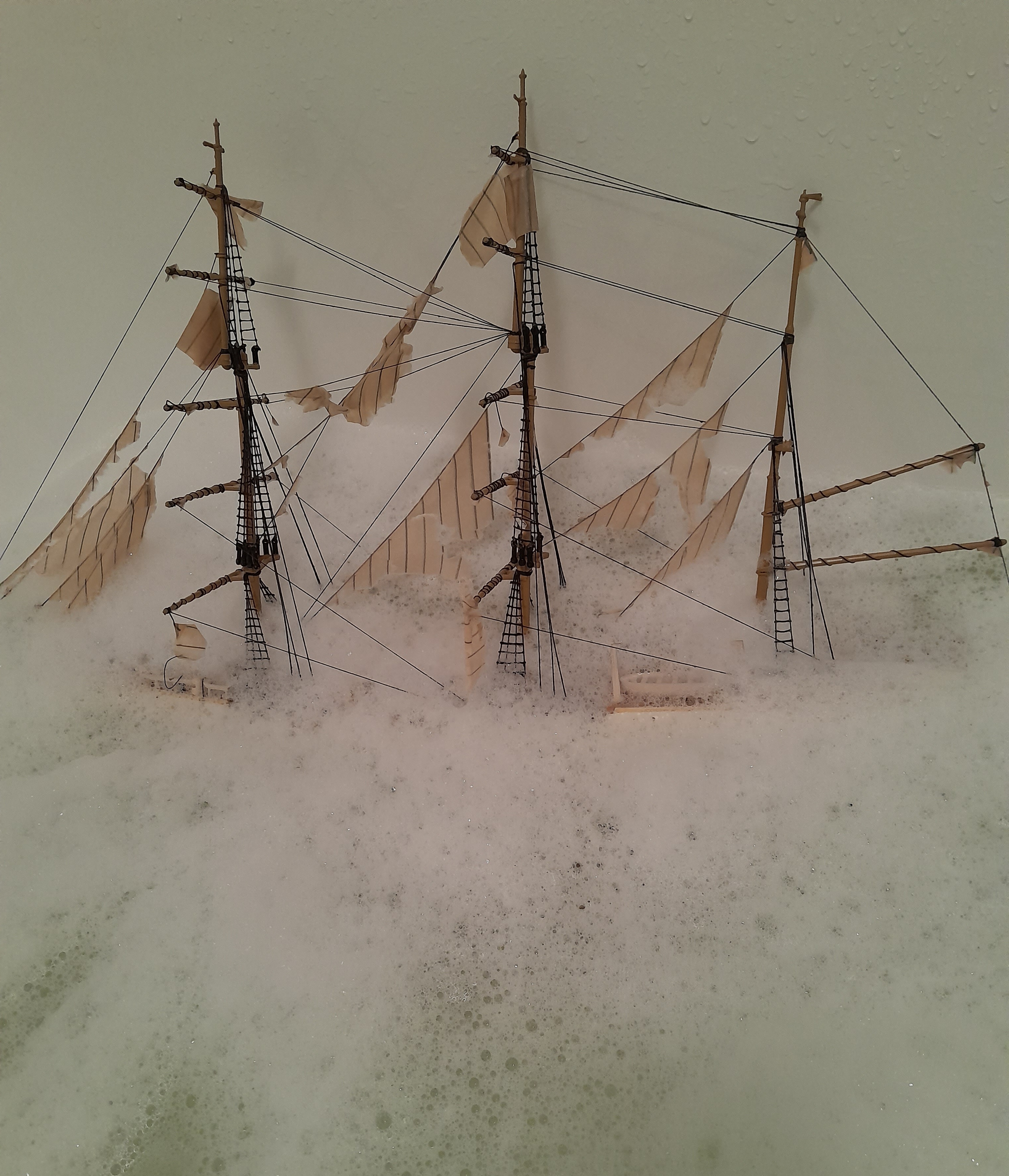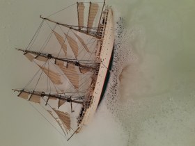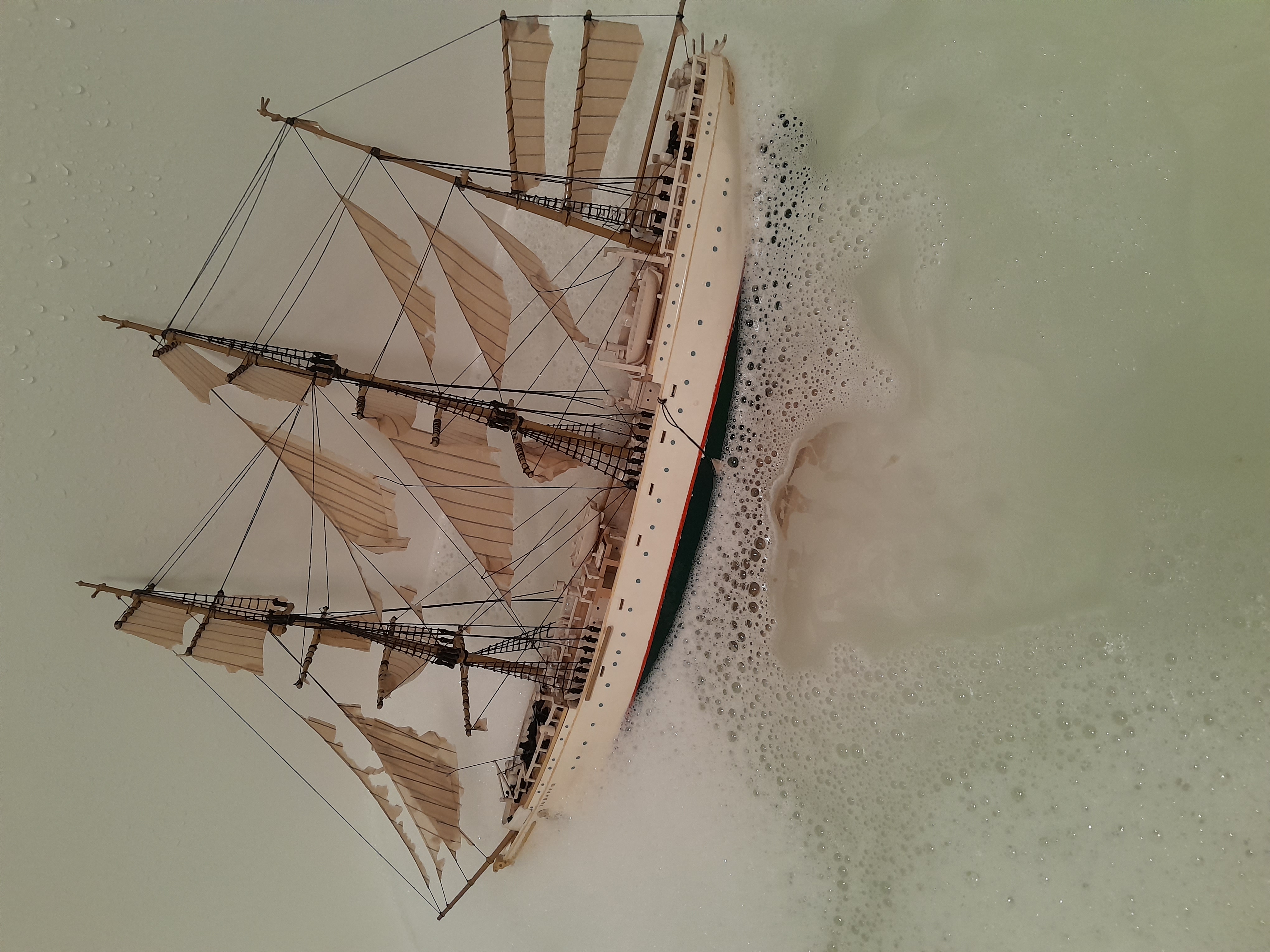 Помню, собирал такой в детстве, правда до парусов дело не дошло. Какое то время, так и стоял с голыми мачтами, пока не был ритуально взорван в большой луже.