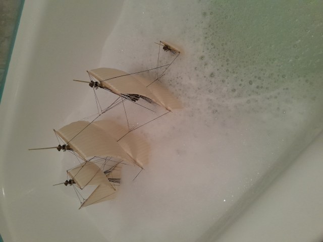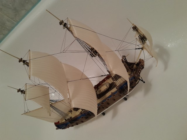 Модель « вылёживалась» перед сборкой не менее пяти лет, а то и больше. Пока « … наши желания совпали с нашими возможностями…» (С). Руководством к сборке, покраске и проводке такелажа послужил «Моделист- конструктор». Флаги нарисованы цветными карандашами. Бегучий такелаж сделал из лавсановой нити, самой тонкой оказавшейся в моём распоряжении. Старался подобрать цвет соответствующий новому джутовому тросу. Не удачно. На модели смотрится слишком ярко. Сборку закончил приблизительно в 1998 году. Хранение, если это можно так назвать, на открытой полке.