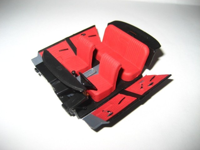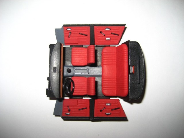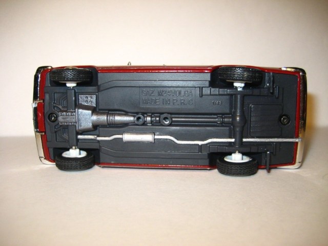 Салон вишневый, самый распространенный; немного исправлены колесные диски/колпаки; решетка радиатора тонирована; прорисованы резинки на бамперах; номера "пробные" ранней серии; на крыльях сточены дублеры поворотников; травление шильдиков Игоря Новикова; восстановлены все молдинги, водостоки и уплотнители стекол; антенка из жесткой одежной щетки; фонари раскрашены; на донышке обозначены агрегаты.