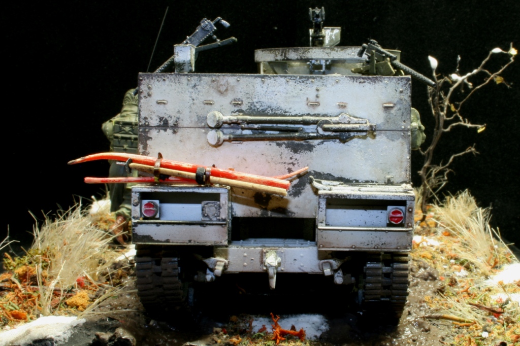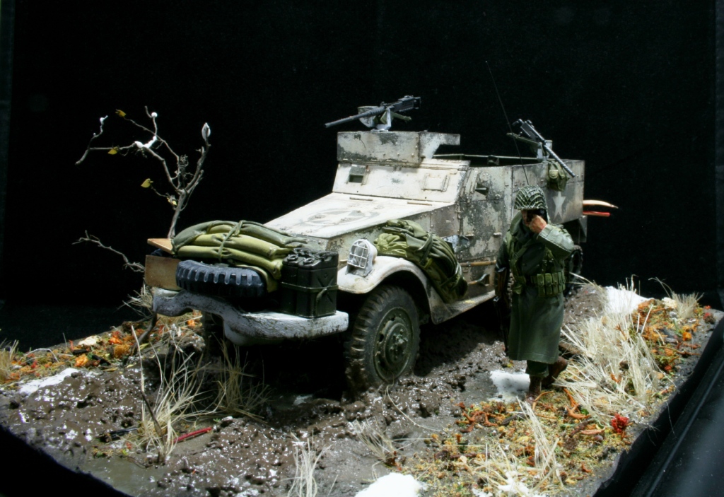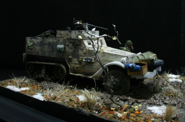 Борис, ощущение распутицы и холода передать удалось. Пару замечаний оп работе позволю сделать. На мой взгляд не хватает еще одной фигуры, у Вас тот кто рацию несет тот по ней и говорит. Офицеры вряд ли носили на себе радиостанцию,для этого есть радист или можно было разместить радиостанцию на броне. И на мой не просвещенный взгляд на бронетранспортере из под белой краски на американской технике должен проступать цвет "olive drab", а не серый.
