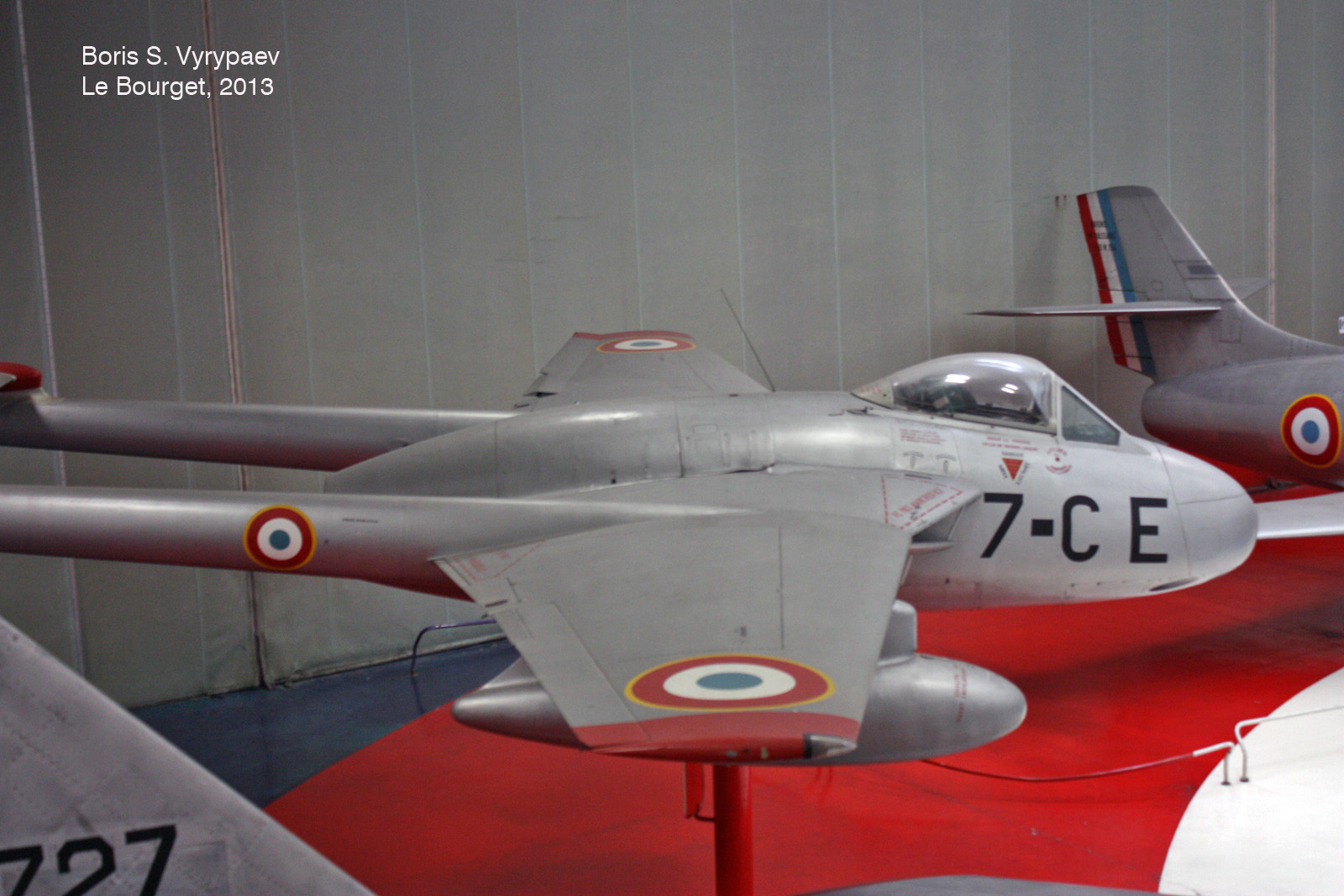 Во французском варианте "Вампира" были использованы крыло, фюзеляж и многие агрегаты аппарата Vampire Mk.5, но он имел герметичную кабину пилота, модифицированные воздухозаборники для новой силовой установки и катапультируемое кресло. Максимальная скорость возросла до 925 км/час против 852 км/час самолета FB.5. Опытный образец поднялся в воздух 1 апреля 1951г., после чего был поставлен на обсуждение начальный заказ на 2500 машин, но это количество было позднее резко сокращено . "Мистраль" принимал участие в военном конфликте на территории Алжира.