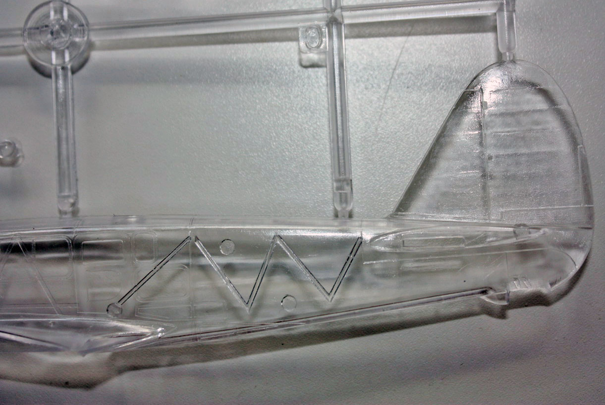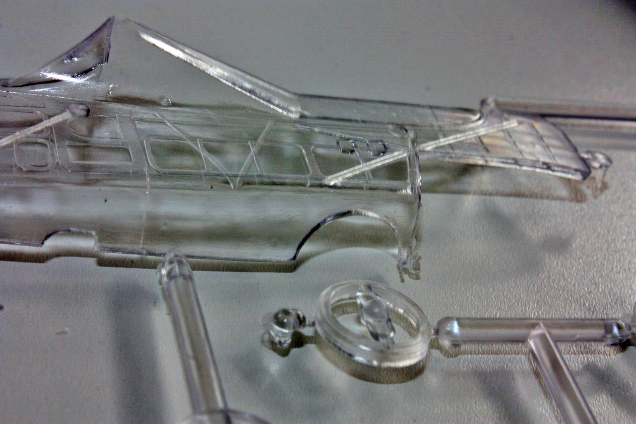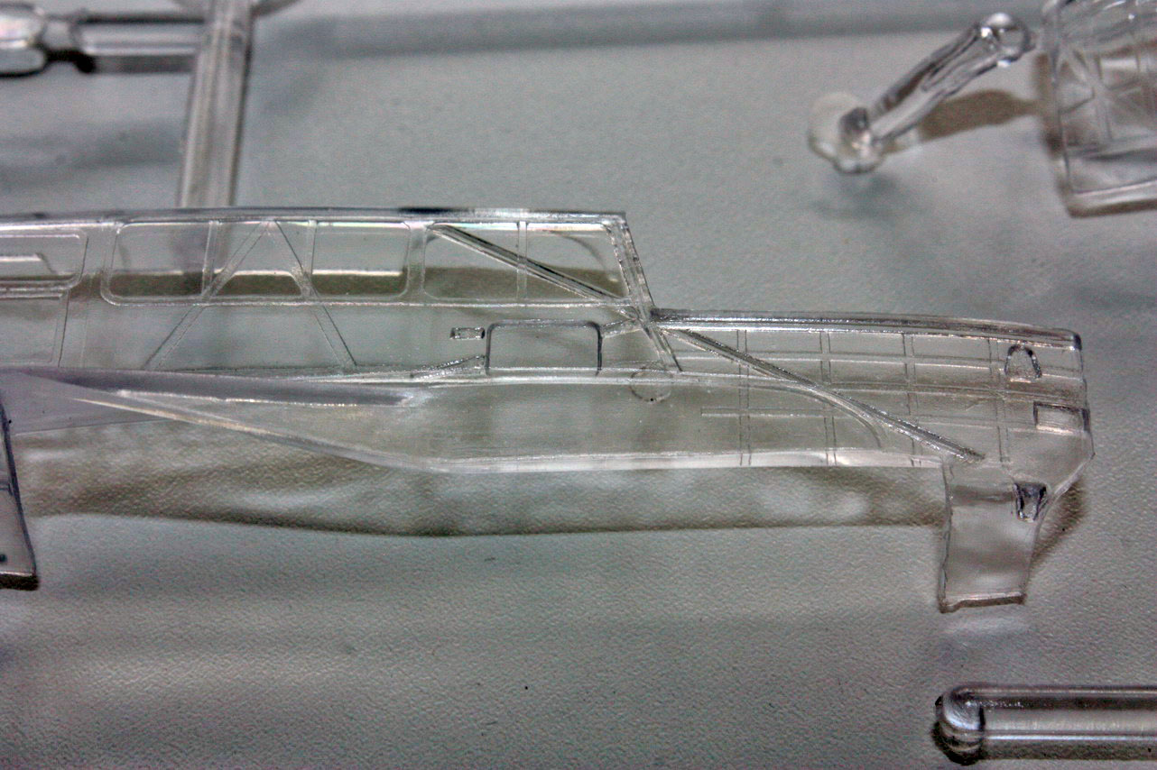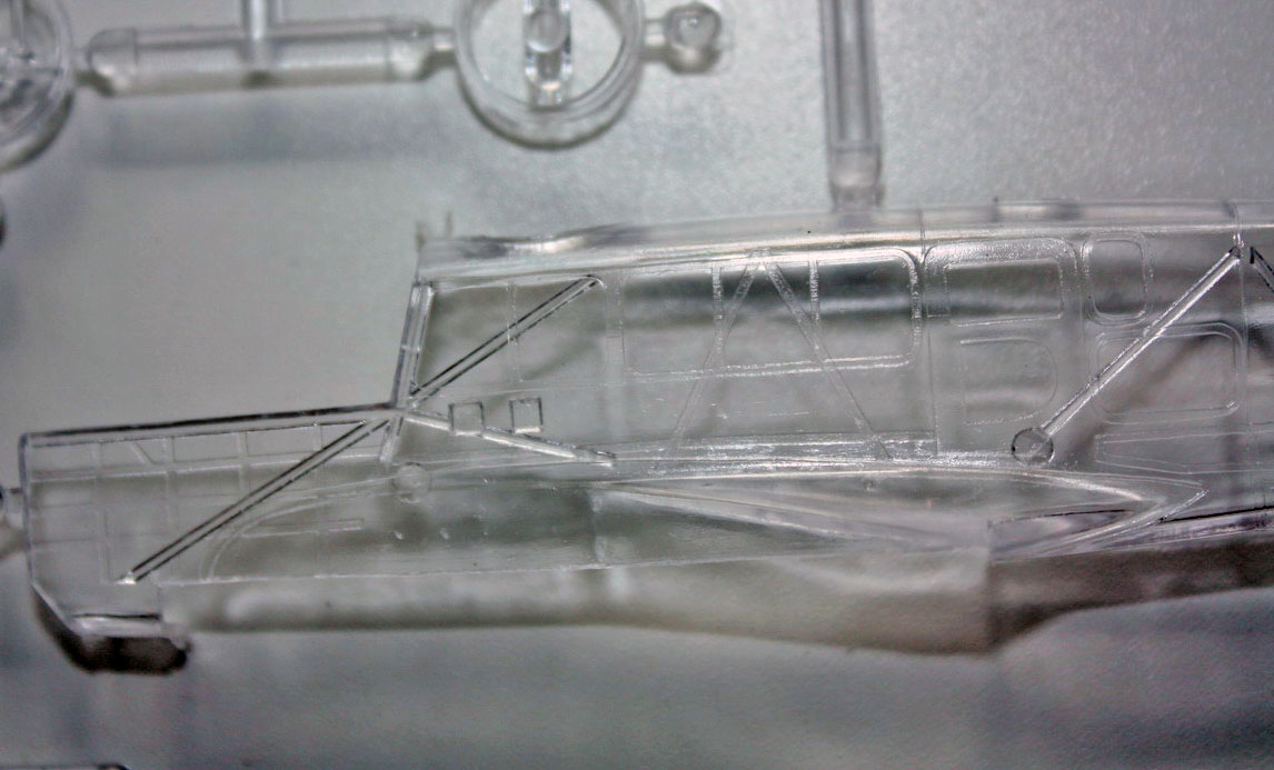 Проблема большой площади остекления - применено хоть и не оригинальное, но редко встречающееся решение. Фюзеляж целиком из прозрачного пластика, при этом в набор входят маски как на внутреннюю, так и на внешнюю сторону.