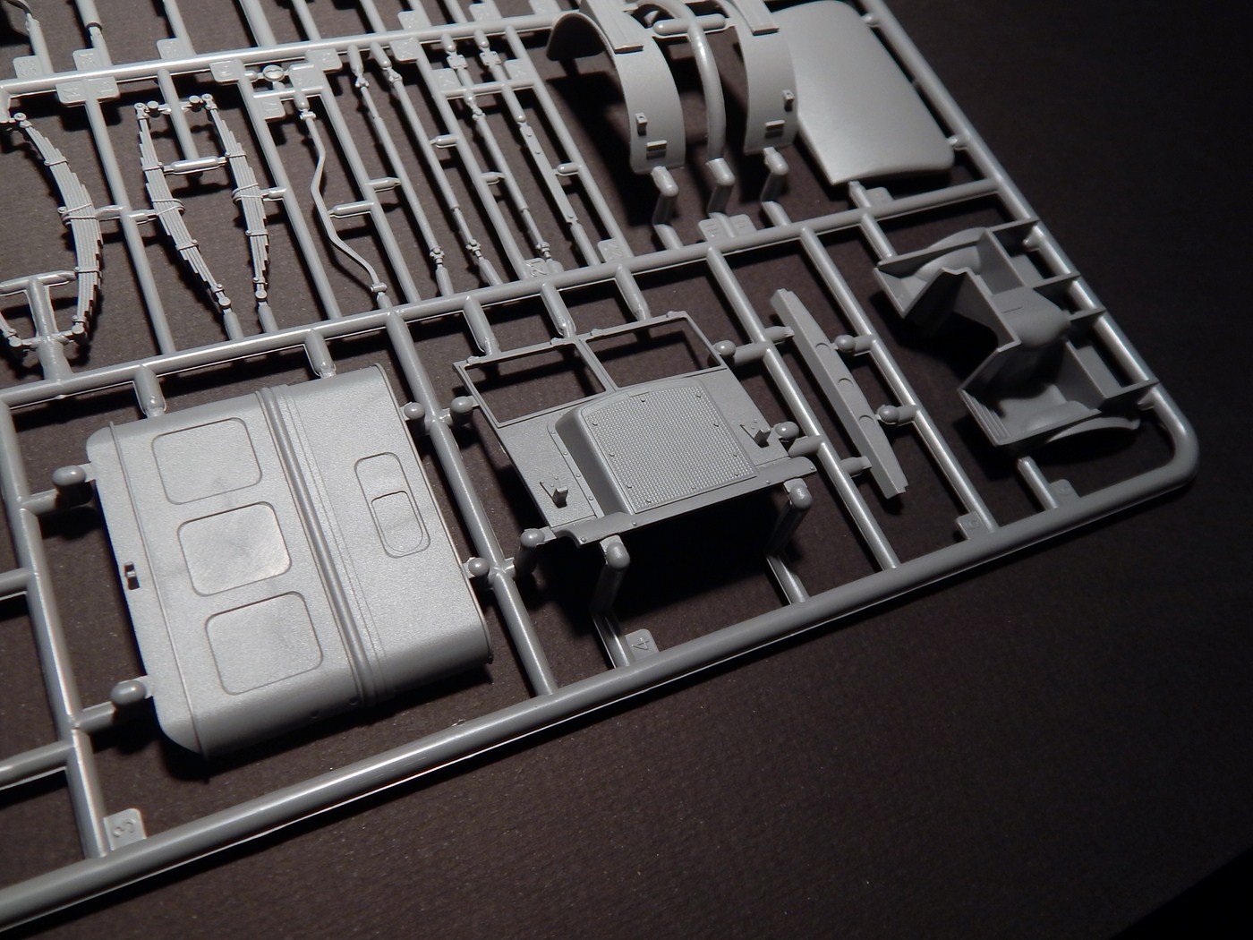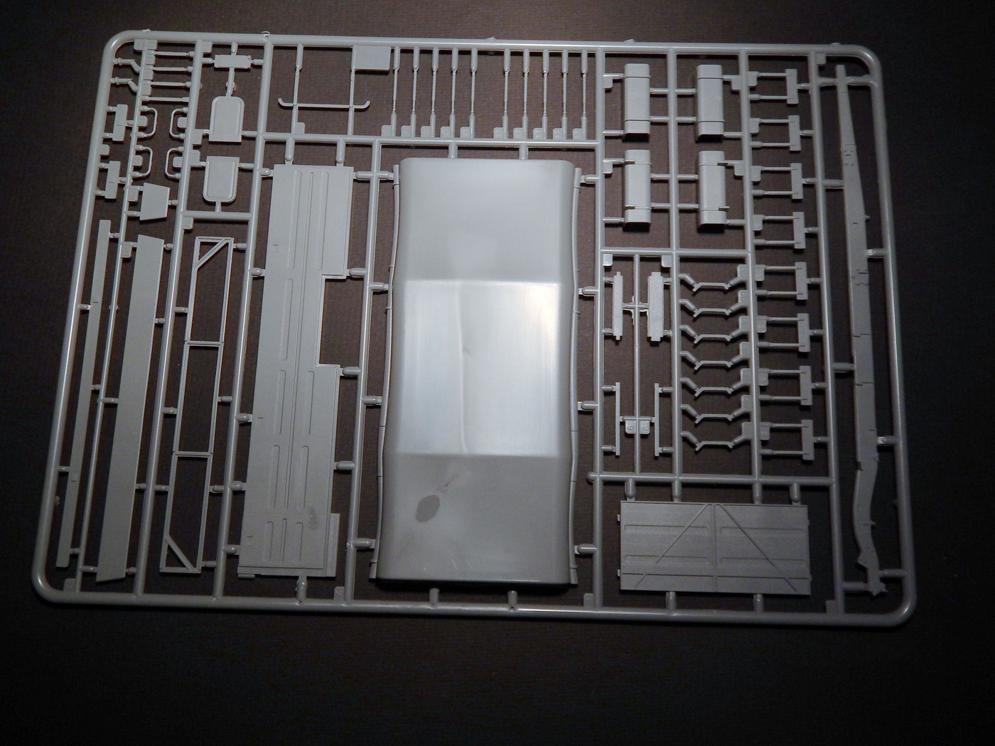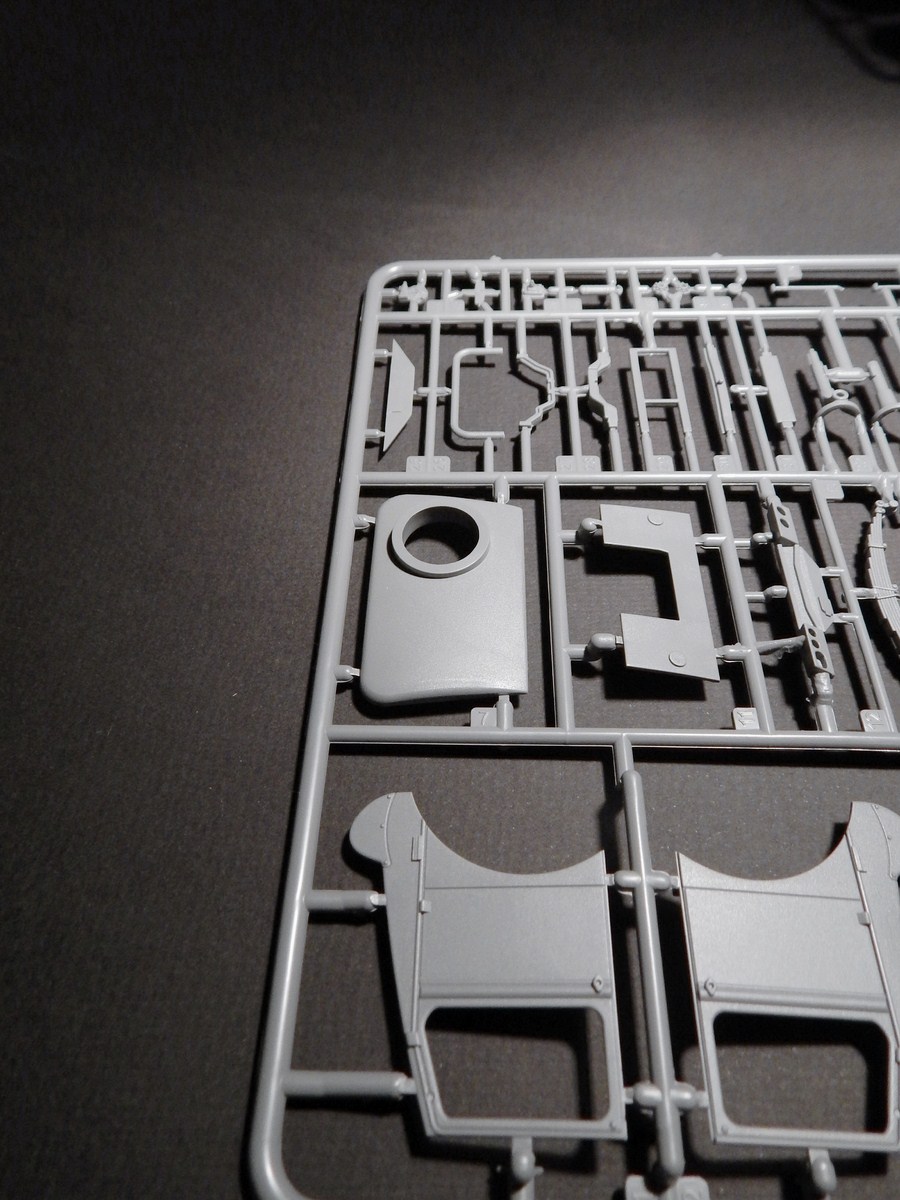 Колеса из половинок, протектор четкий, на покрышках видны четкие надписи. Два варианта крыши - с люком и сплошная(мне это было важно). Пол кузова имеет фактуру, но так с одинаковым успехом может выглядеть как металл, так и дерево. Из мелочей, что я отметил - странно искривился литник с прозрачными деталями и странная клякса(не утяжина!) на крыше тента. По идее, после покраски она будет не видна.
