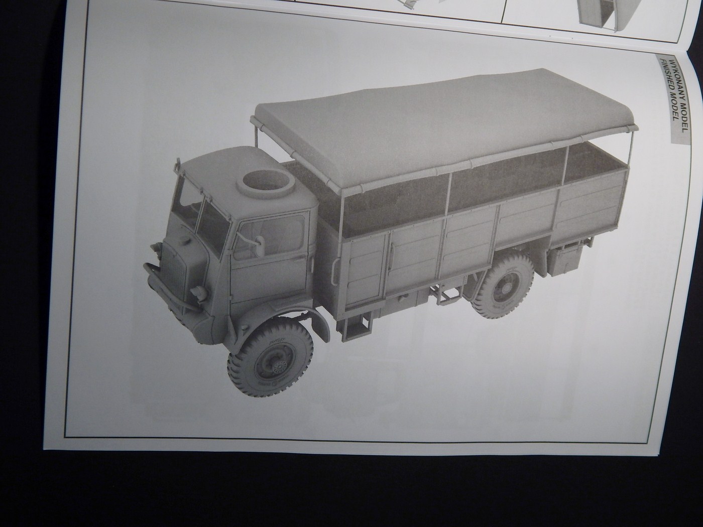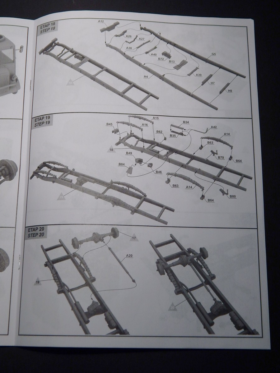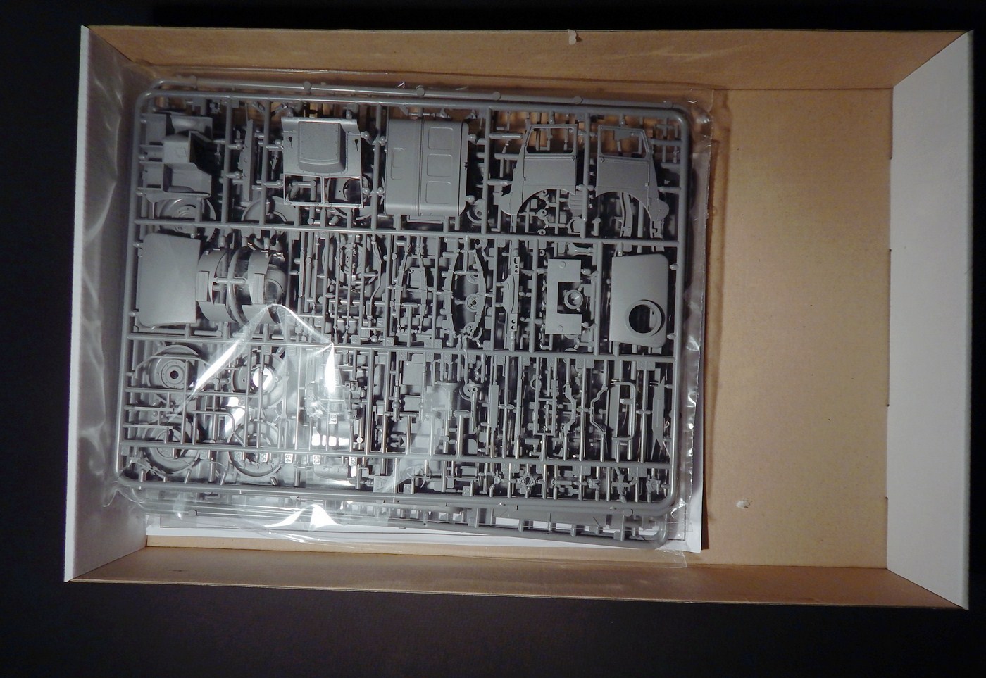Колеса из половинок, протектор четкий, на покрышках видны четкие надписи. Два варианта крыши - с люком и сплошная(мне это было важно). Пол кузова имеет фактуру, но так с одинаковым успехом может выглядеть как металл, так и дерево. Из мелочей, что я отметил - странно искривился литник с прозрачными деталями и странная клякса(не утяжина!) на крыше тента. По идее, после покраски она будет не видна.