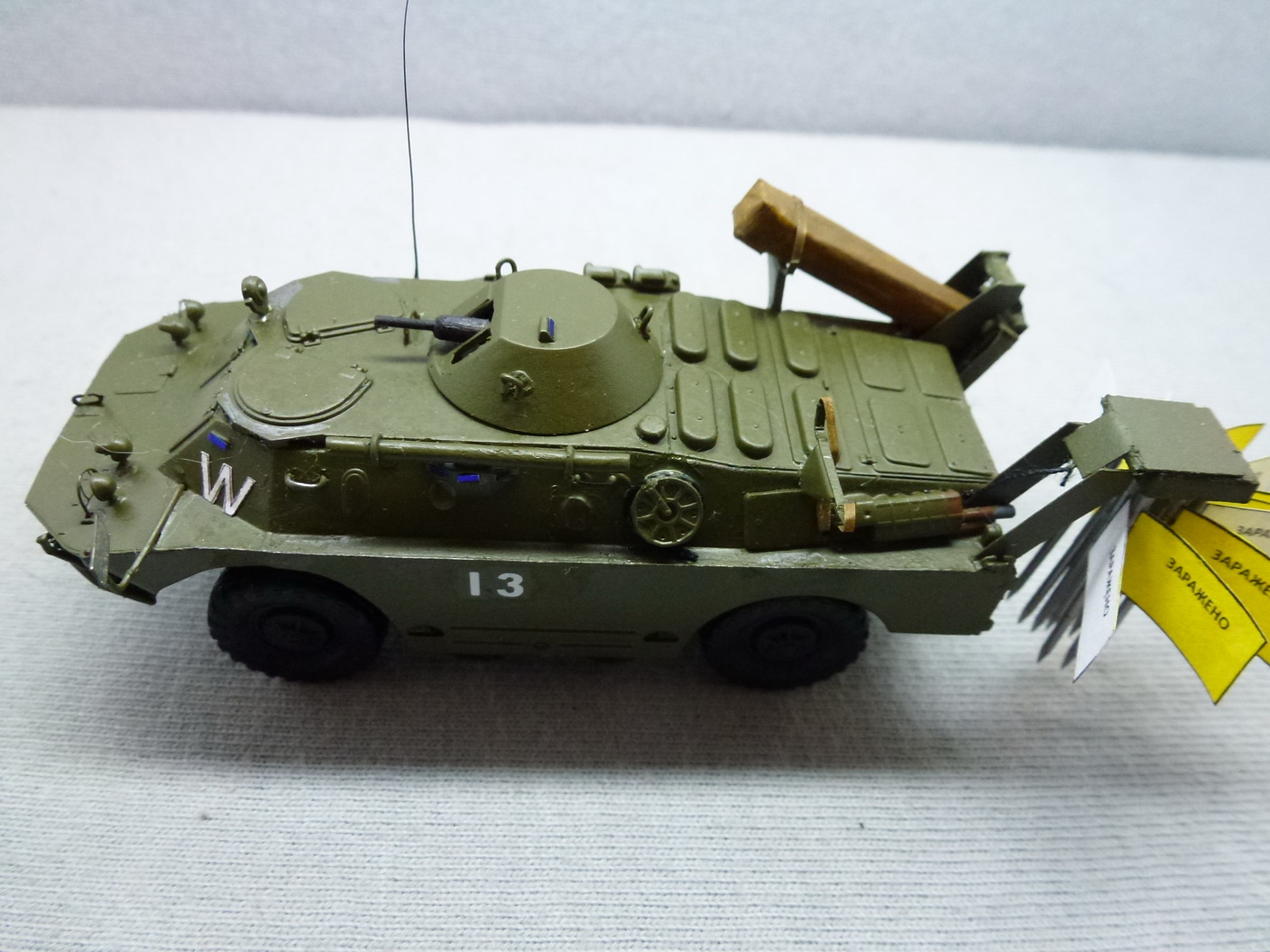 Что сделано - из литников выступы на броне, кожухи глушителей смещены вперед, изготовлены рамы для подвески Комплекта знаков ограждения КЗО-2(вообщн то они ажконые, но я нашел фото упрощенных - пластинами), вооружение - ПКТ, остеклил все....