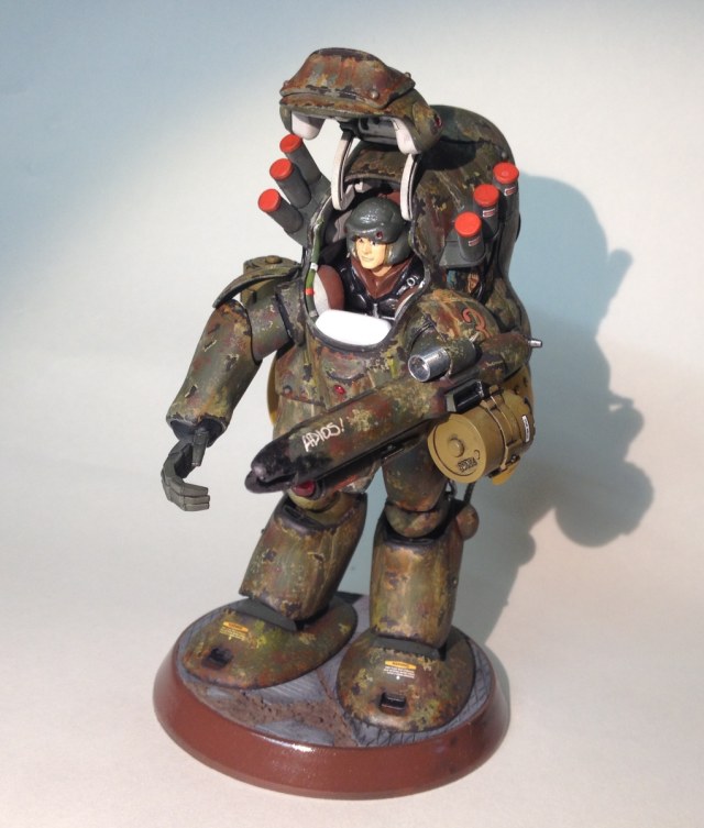 Сьют после мелкого ремонта из-за боевых действий в агрессивной атмосфере)) Новинка этого лета во вселенной Ма.К от Хасегавы. В наборе два сьюта, один с фиксированным оружием вместо левой руки, второй держит его в руках. Стыковка хорошая, набор богатый, кроме люка корпус располовинивается, есть доступ как к пилоту, так и к двигателю. Декалей много и красивые, но как клеются не понравились. Взяли с другом кит на двоих, мне достался со встроенным. Из-за благополучно испорченного камуфляжа пришлось убить в хлам. Краска и лак Тамия, немножко Звезды, художественные масляные краски.