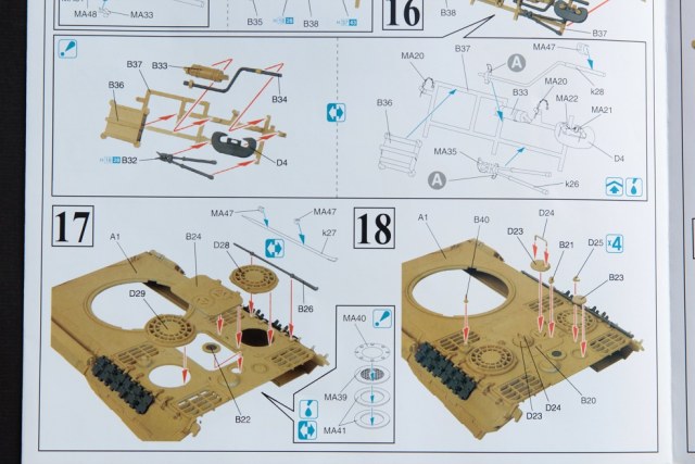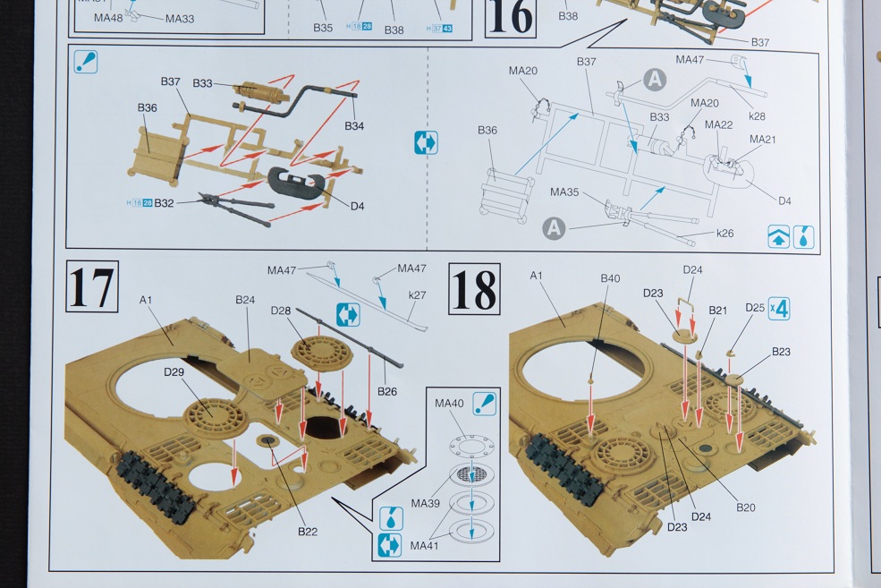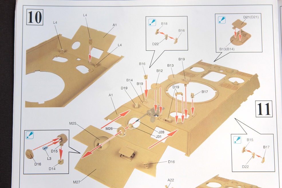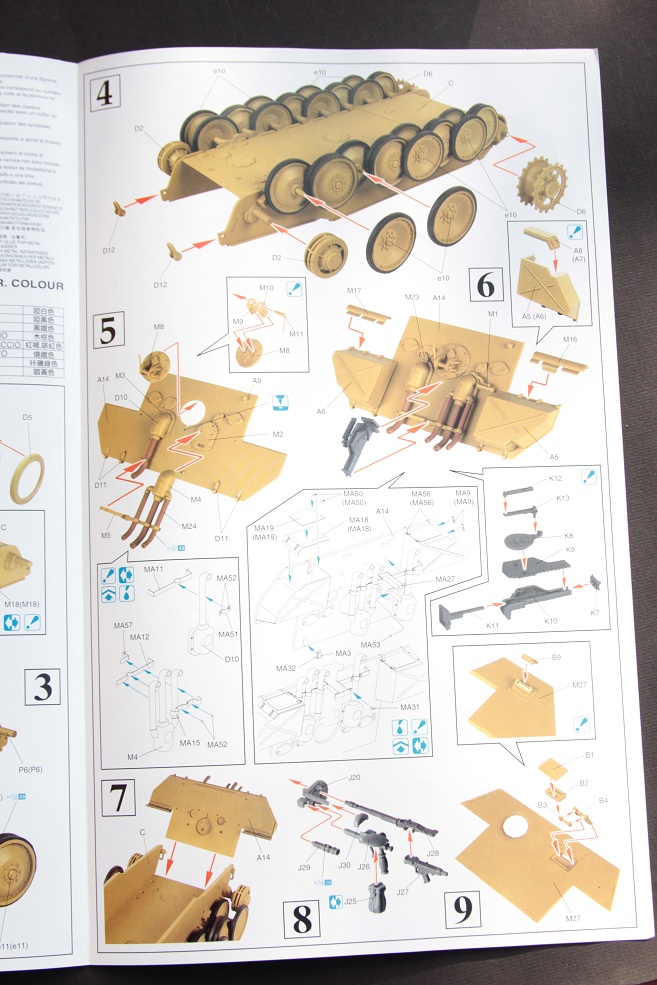 Сам набор довольно хороший в коробке лежит аж 18 литников, плюс большая плата фототравления. Начнем, пожалуй, с инструкции она выполнена на хорошей глянцевой бумаге и, причем цветная этапы сборки на ней довольно понятны и трудностей не возникнет с её прочтением. Качество пластика у дракона как всегда на высоте ни утяжин ни облоя даже поведенных деталей нет. Набор богат на излишки в виде трех домкратов, трех стволов один из них состоит из двух половинок , второй цельно пластиковый а третий металлический. Торсионная подвеска дана в двух вариантах рабочая и нет, хотя для данной ванны корпуса подходит только не рабочая. Траки наборные, хотя в последнее время это большая редкость у дракона, ещё в наборе две лобовых плиты как для модификации Д так и для А с набором инструмента дракон тоже не пожадничал. Травление в наборе довольно много плюс бортовые экраны даны металлические, декаль на 5 вариантов покраски есть из чего выбрать. Есть в наборе один большой минус , данная машина должна быть в циммерите и про это производитель наверно просто забыл т.к данной модификации дракон не выпускает циммериченной. Но мне повезло, набор достался мне с комплектом циммерита от Cavalier.