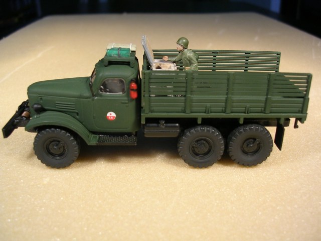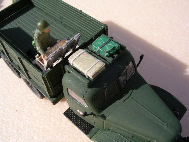 Небольшое сомнение вызывают медный цвет лебедки, черный цвет стоек зеркал (вроде красили в цвет кабины), накабинная решетка (вроде присутствовала только на автомобилях с кунгом), знак ограничения скорости на заднем крыле (обычно на заднем борту наблюдал), цвет тента, цвет ящиков для снарядов, цвет бочки ГСМ (у нас были зеленые разных оттенков, красные только у пожарного щита с водой).