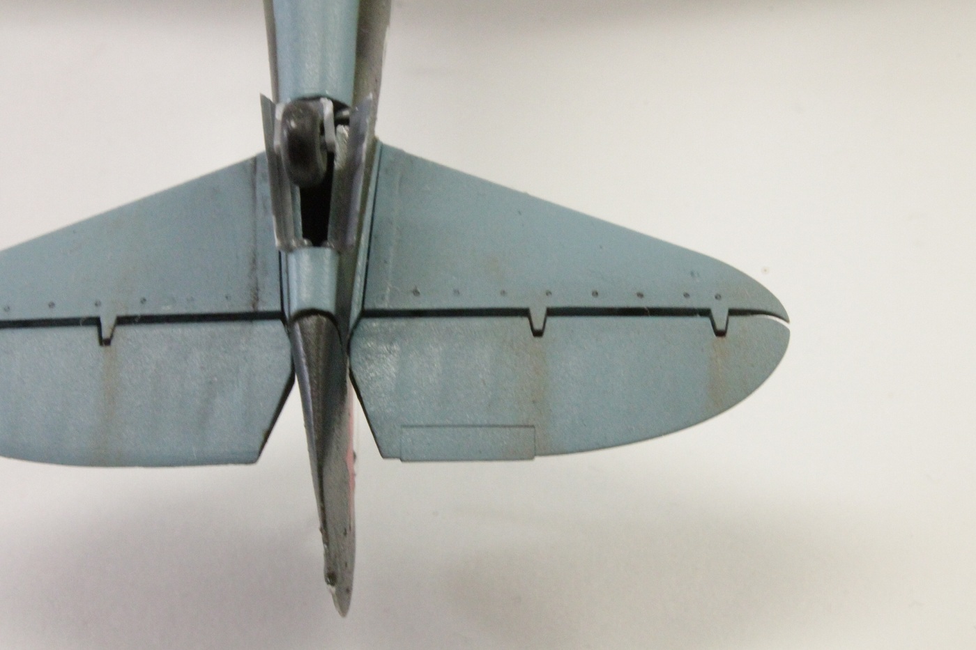 В части сколов на крыле у меня сомнения не сколько по передней кромке, столько по задней: такое впечатление, что до грунта краска снялась. Еще снизу не видны посадочные щитки, хотя элероны четко выделены.