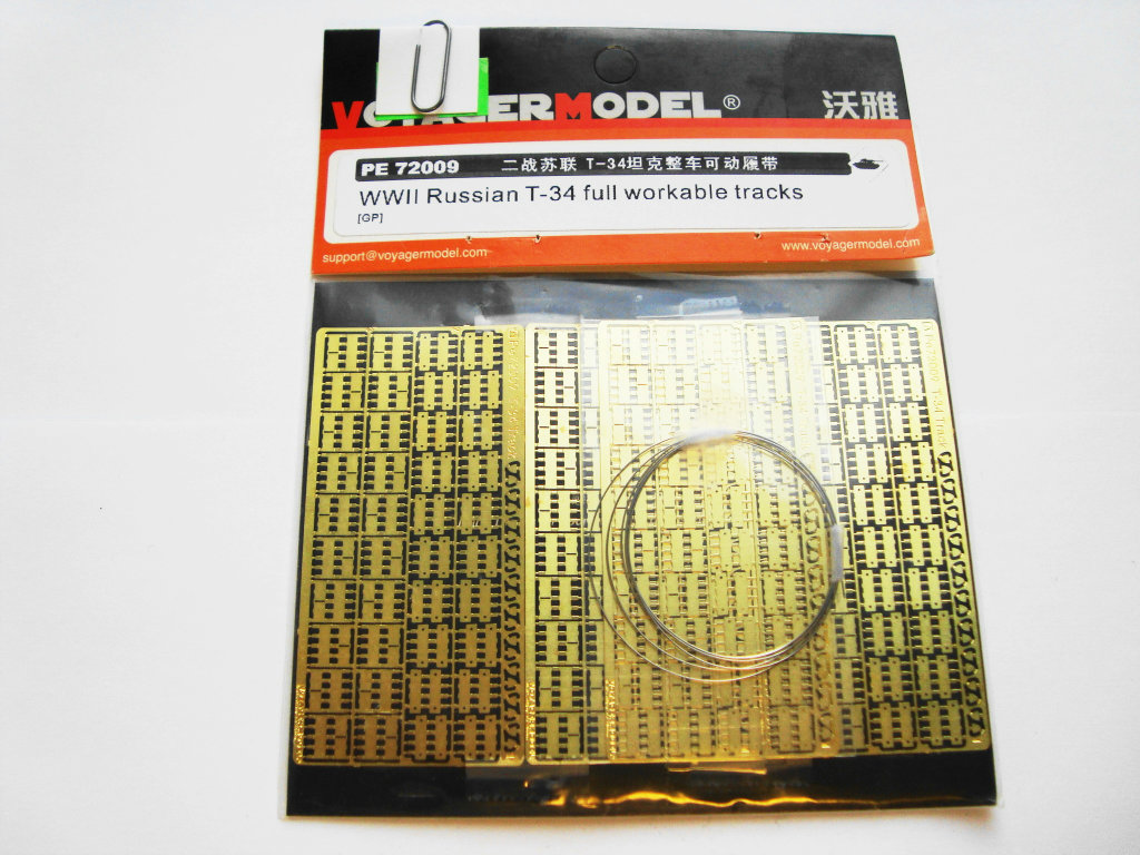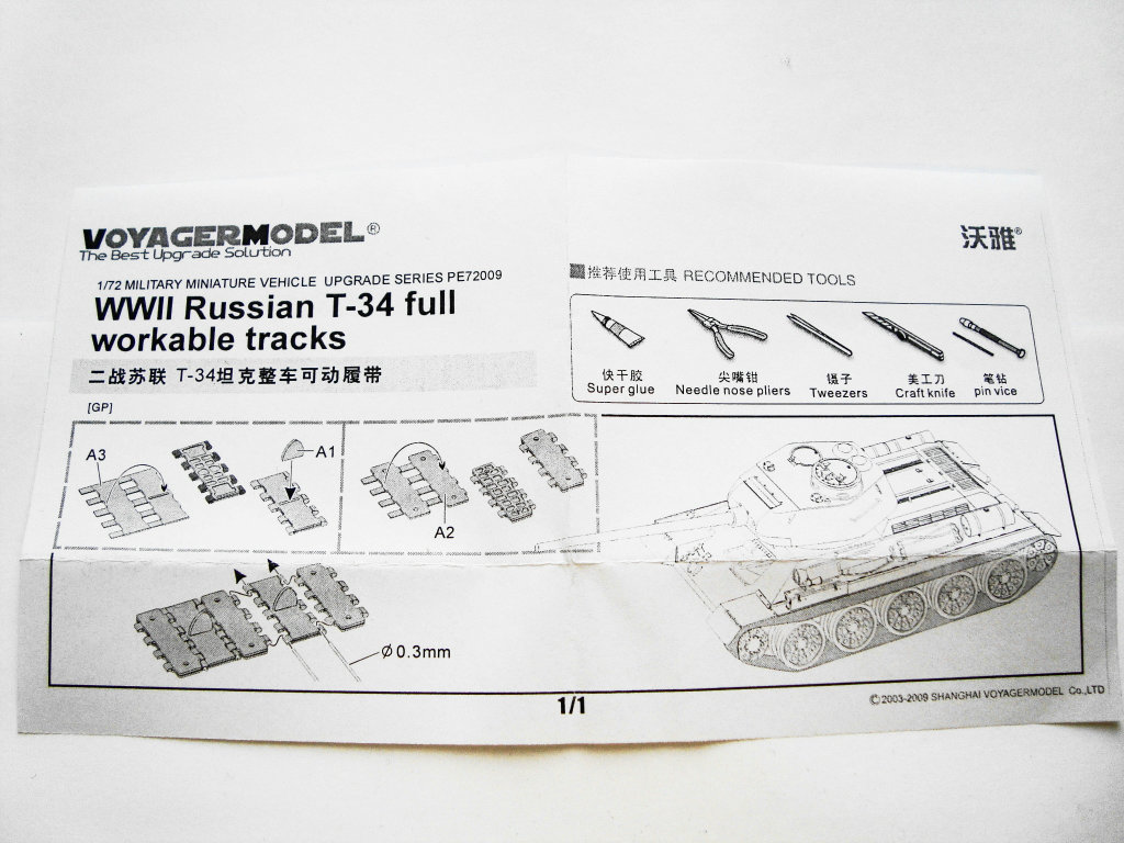 Здравствуйте! Решил "перепилить" Т-34/85 который собирал несколько лет назад. Так, как у" Dragonовской" модели гусеницы слабое место, приобрел травленые вафельные траки от Voyagermodel. Вообще я хотел взять траки от"АСЕ", потому- что уже пользовался ими и результатом был доволен, но в магазинах их не нашел. Поэтому взял Voyagermodel, который предлагает собрать весьма сложную конструкцию, состоящую из отдельных траков соединённых пальцами которые надо нарезать из имеющейся в наборе проволоки сечением 0,3 мм. Гребни к тракам даются отдельно т.е. их надо приклеивать, хорошо, что у Т- 34 они были не на каждом траке. В общем набор не для слабонервных.