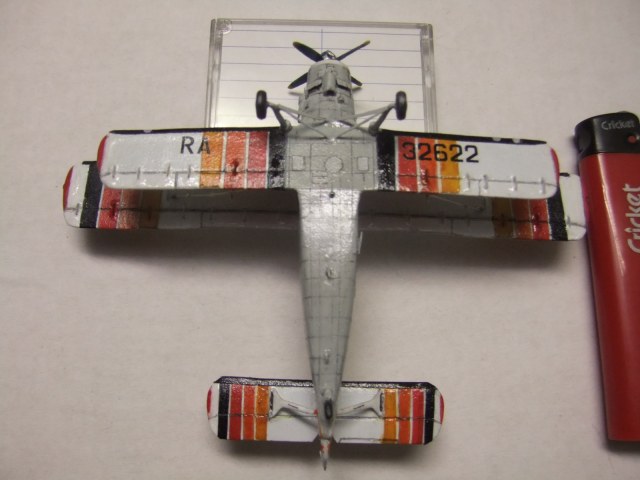 Надо бы тебе поменять технологию карамельной окраски. Даже при том, что модель очень малюсенькая и труда вложено немало, она опять вытаскивает на свет все твои любимые предыдущие ошибки в виде желания залить модель краской и лаком от всей души. Матовым лаком из баллона я бы тебе не советовал её закрывать - угробишь модель окончательно! Купи любой модельный матовый (Ревелл, Акан) и пройдись кистью, раз уж так хочется. По-крайней мере, не убьешь фонарь. Но в идеале самолёт должен быть полуматовым.
