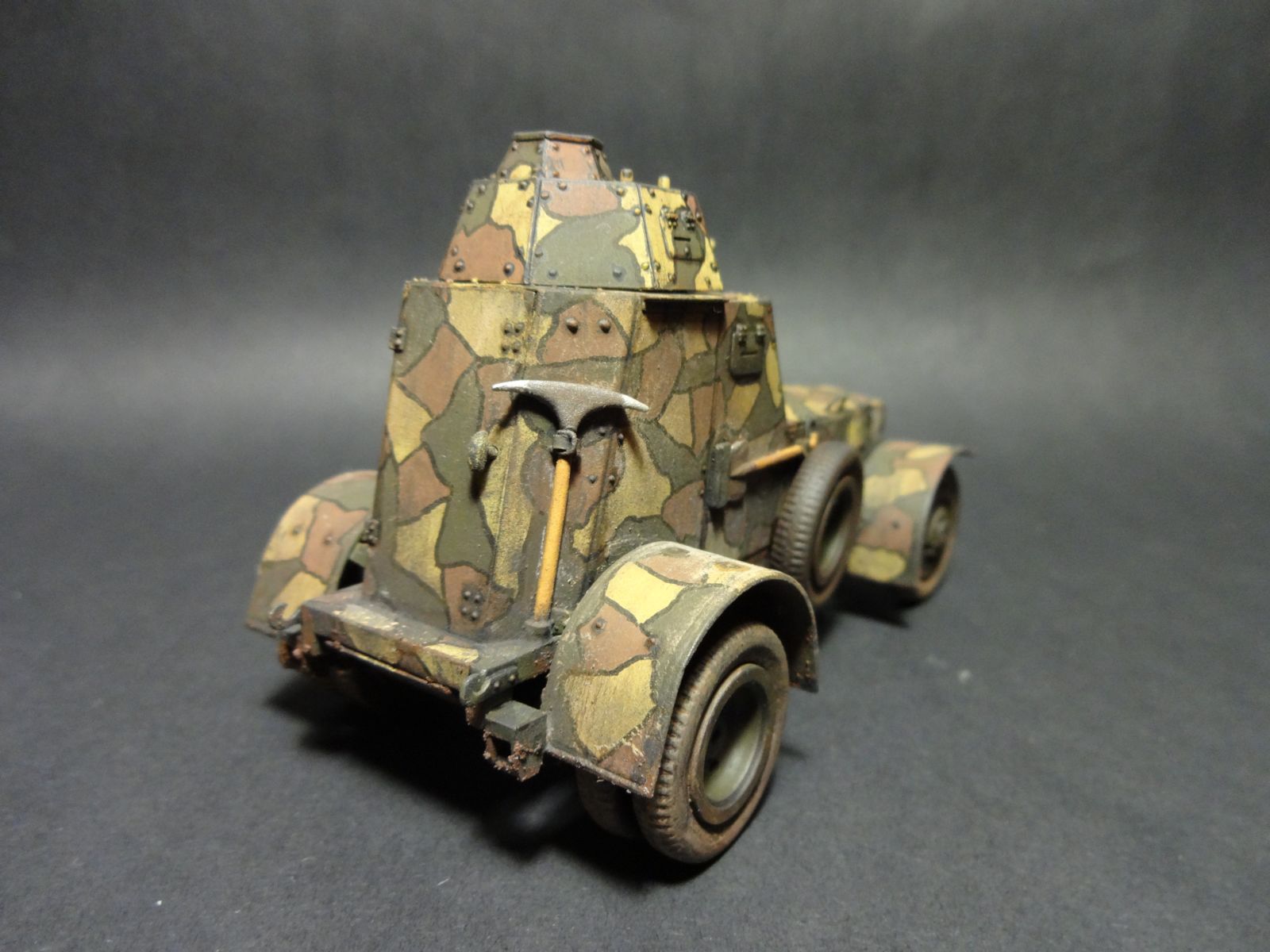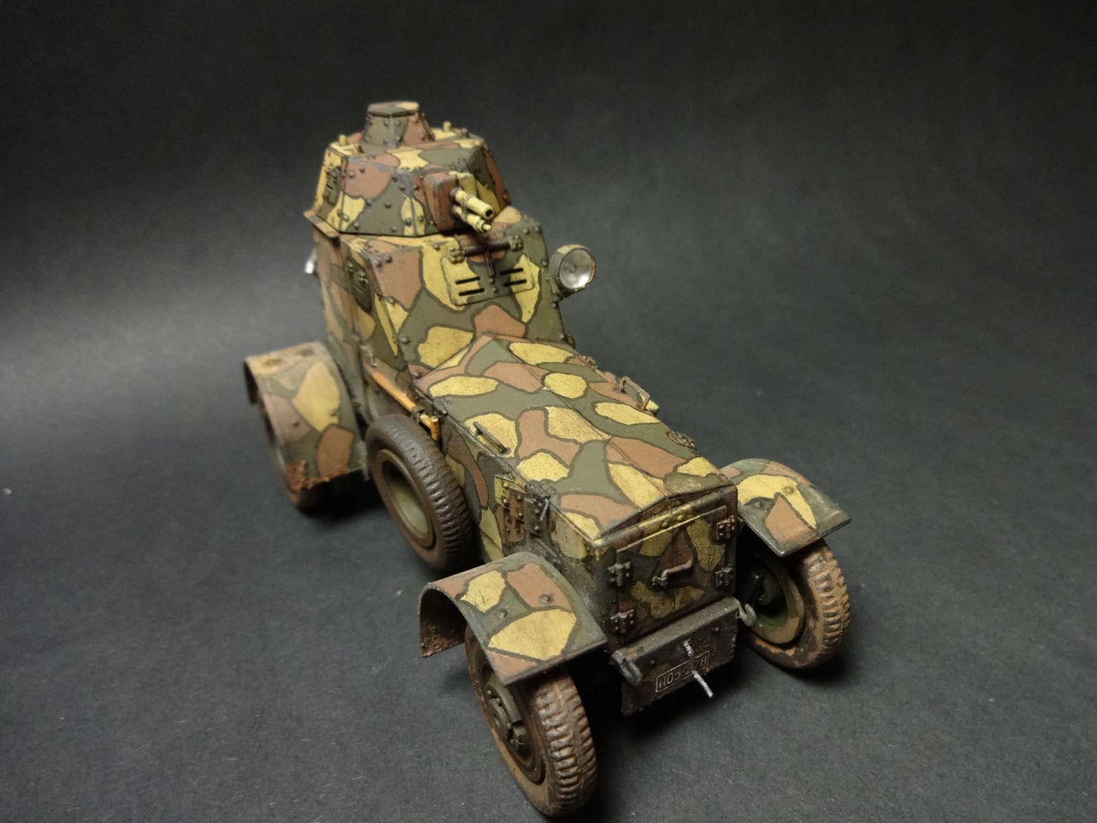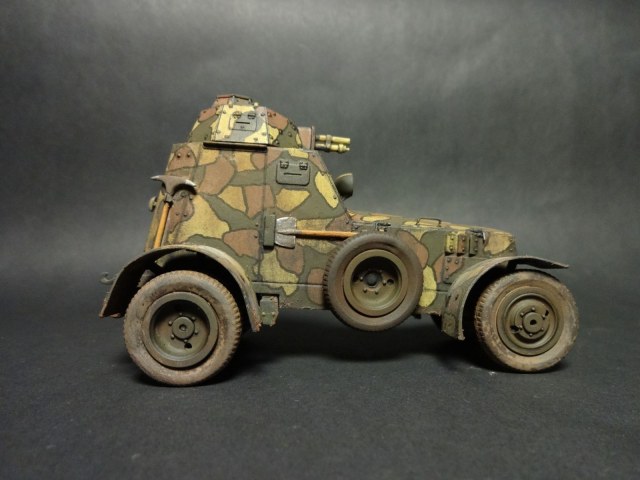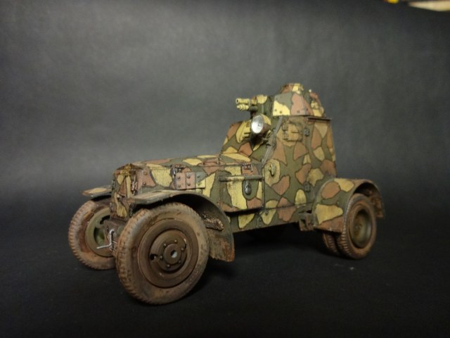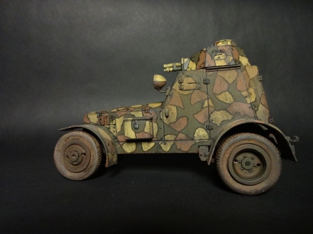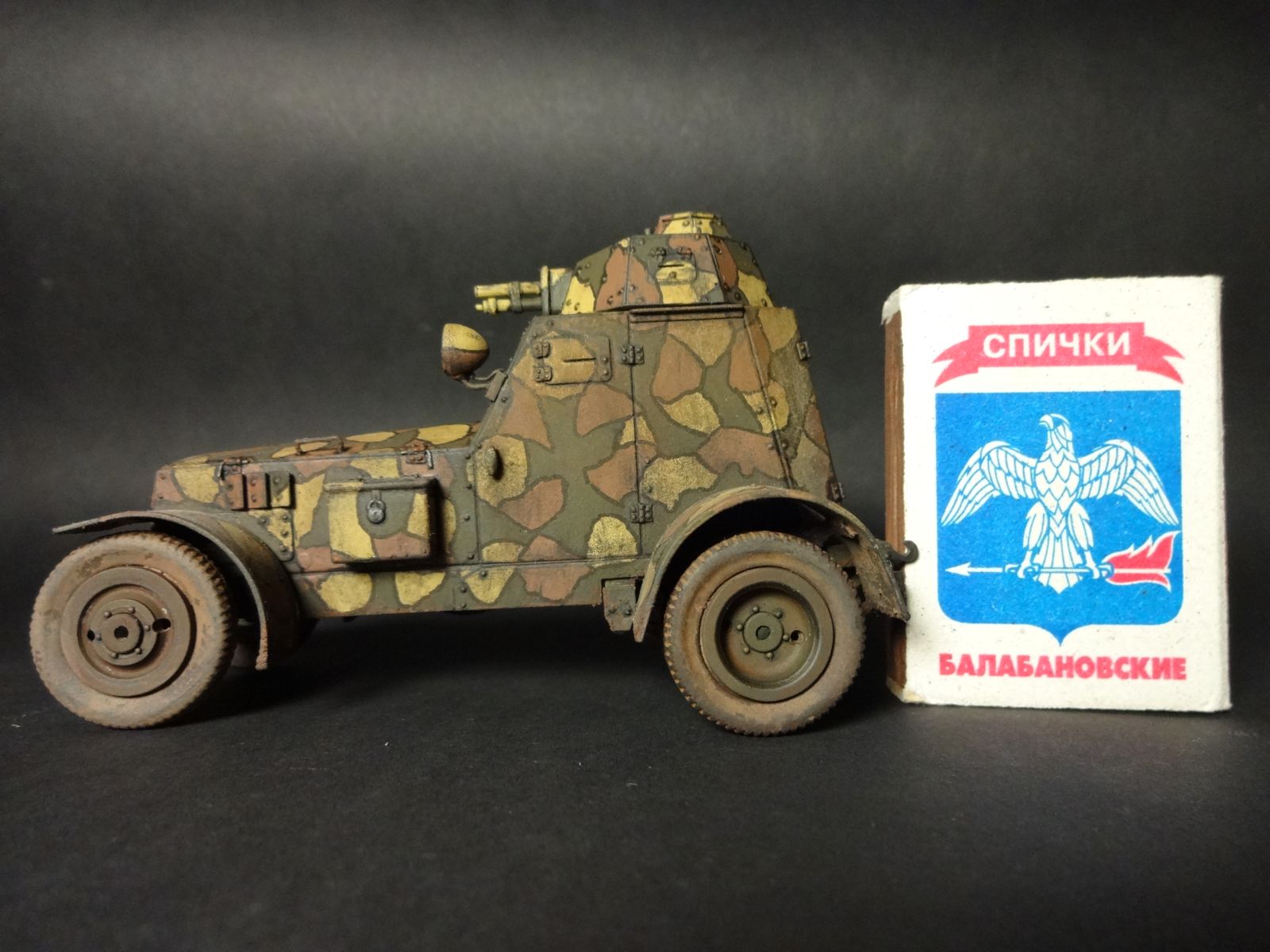 Польский броневоз от Miragehobby. Уже 3-я модель этой фирмы и опять редкостные дрова) Куплен под уговоры друга «ну давай, такая редкая и интересная машина»)) Пилить пришлось изрядно - все петли, половина заклепок, дверные ручки, кронштейн фары передние дверцы моторного отсека и т.д. сделаны заново. Полностью с нуля сделано орудие (то что лежало в коробке было вообще ни на что не похоже). Перестрадал с колесами - покрышки из очень мягкой «резины?» совершено не хотели избавляться от продольного шва. Но заменить их было нечем, так что - что выросло то выросло)) Фара от эльфа. Окраска: тамиевский акрил баз, черные полоски перманентный маркер, мелочь и сухая кисть - звезда, пигменты миг, смывка маслом на уайте. Нанести камуфляж оказалось достаточно сложно, получился он только со второй попытки.