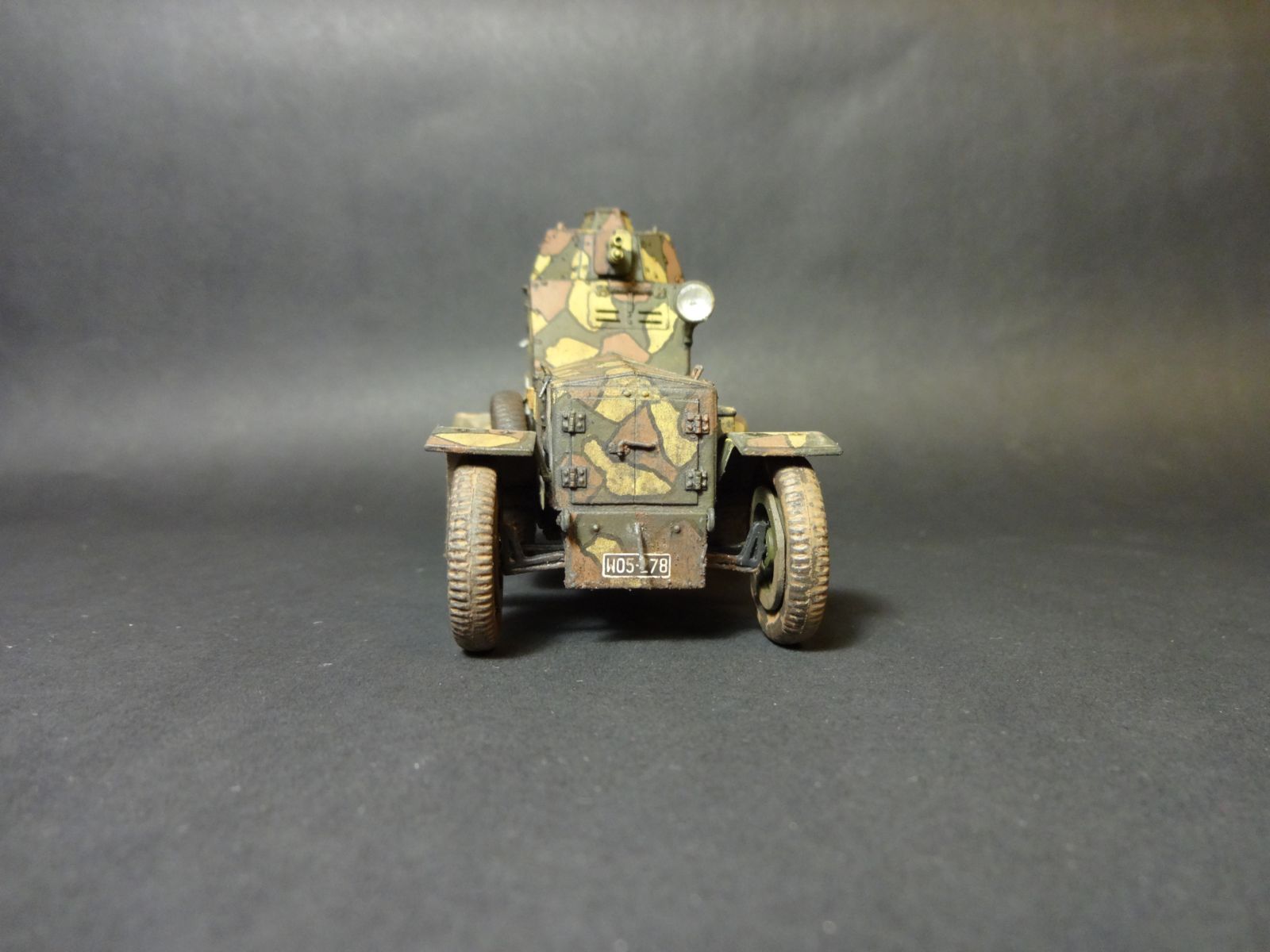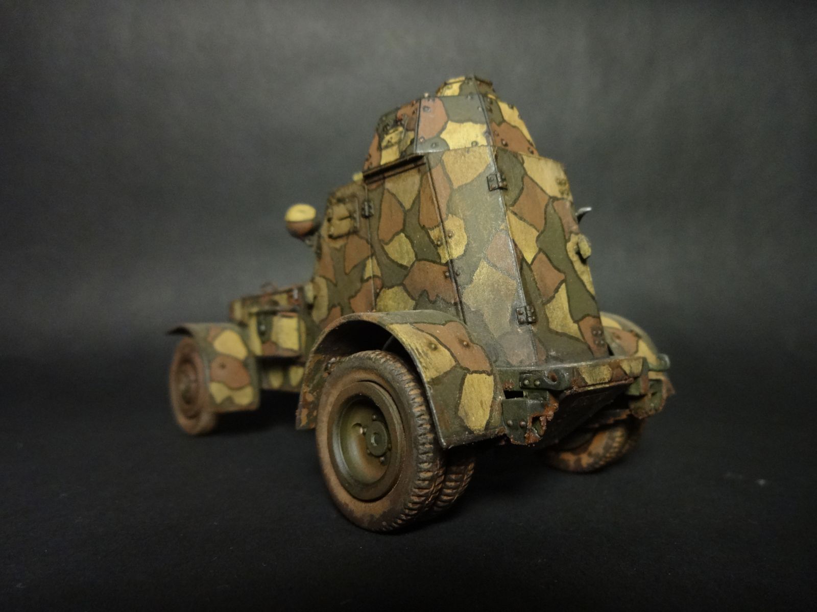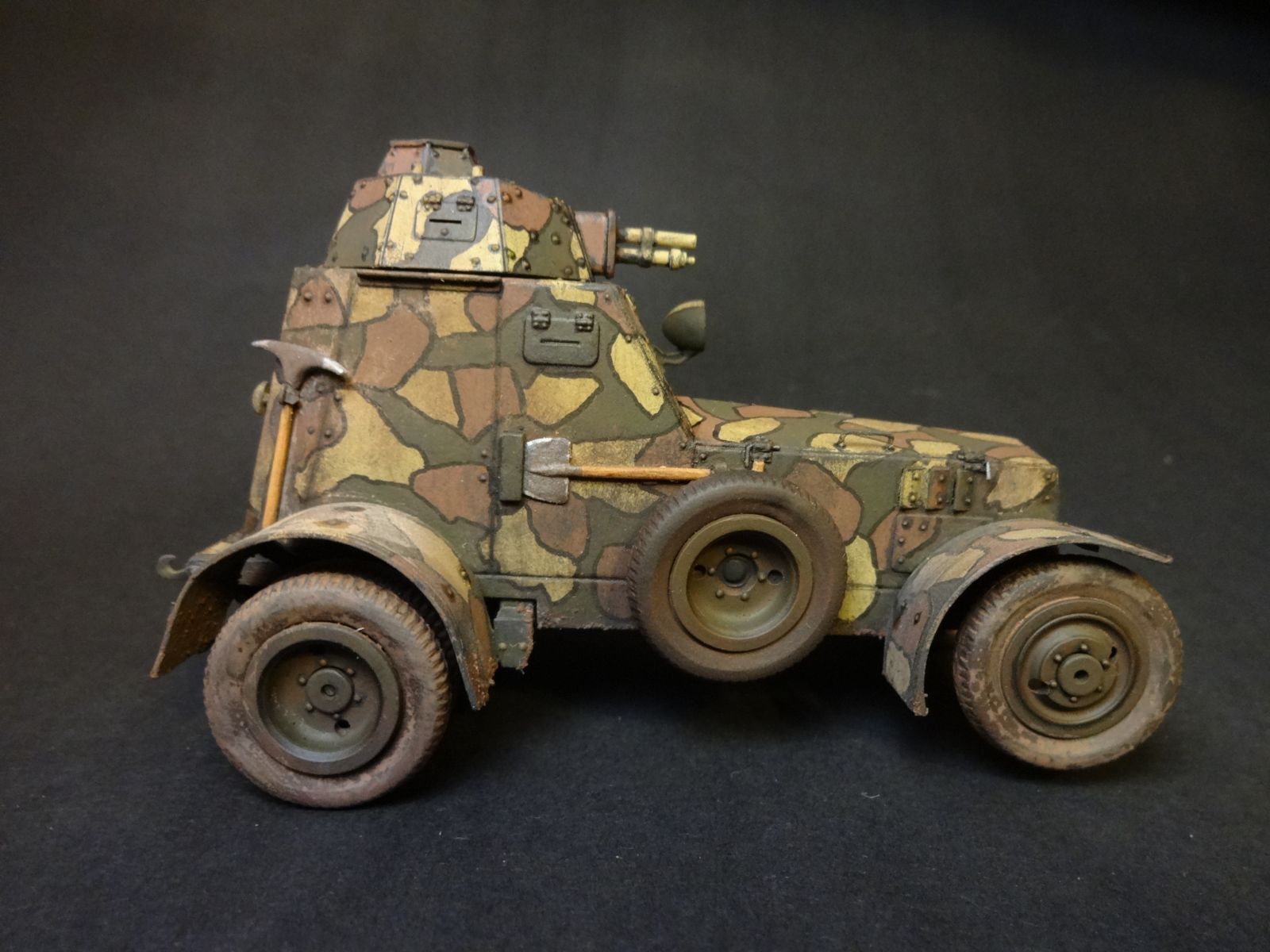 Польский броневоз от Miragehobby. Уже 3-я модель этой фирмы и опять редкостные дрова) Куплен под уговоры друга «ну давай, такая редкая и интересная машина»)) Пилить пришлось изрядно - все петли, половина заклепок, дверные ручки, кронштейн фары передние дверцы моторного отсека и т.д. сделаны заново. Полностью с нуля сделано орудие (то что лежало в коробке было вообще ни на что не похоже). Перестрадал с колесами - покрышки из очень мягкой «резины?» совершено не хотели избавляться от продольного шва. Но заменить их было нечем, так что - что выросло то выросло)) Фара от эльфа. Окраска: тамиевский акрил баз, черные полоски перманентный маркер, мелочь и сухая кисть - звезда, пигменты миг, смывка маслом на уайте. Нанести камуфляж оказалось достаточно сложно, получился он только со второй попытки.