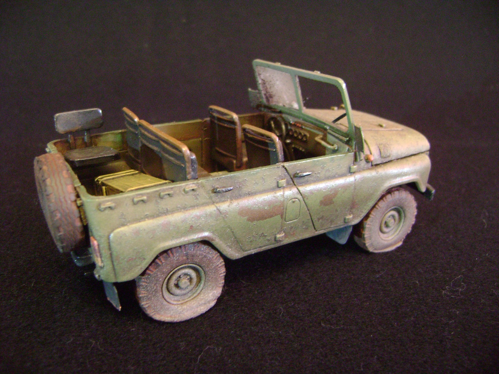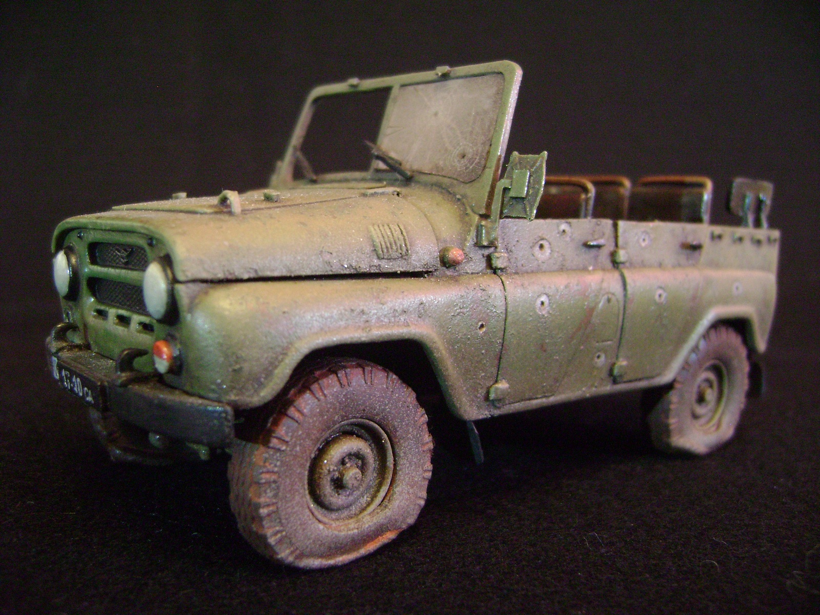 УАЗ 469 - чудовищные дрова, попали ко мне в собранном на 70% виде - дособирал, дополнил зеркалами, ящиками и пр... УАЗ по задумке должен выглядеть брошенным, и явно пережившим приключения - пулевые отверстия, старая кровь на лобовом...