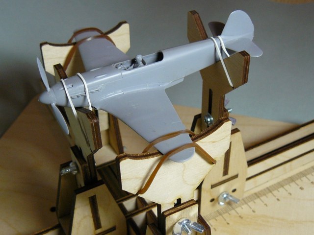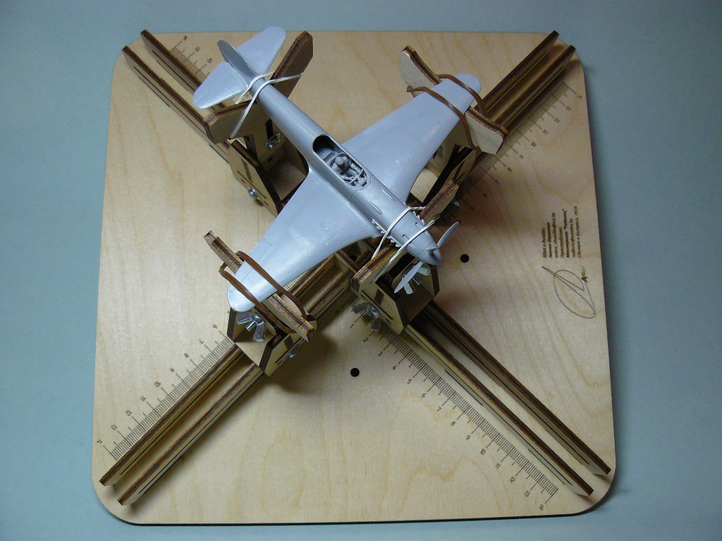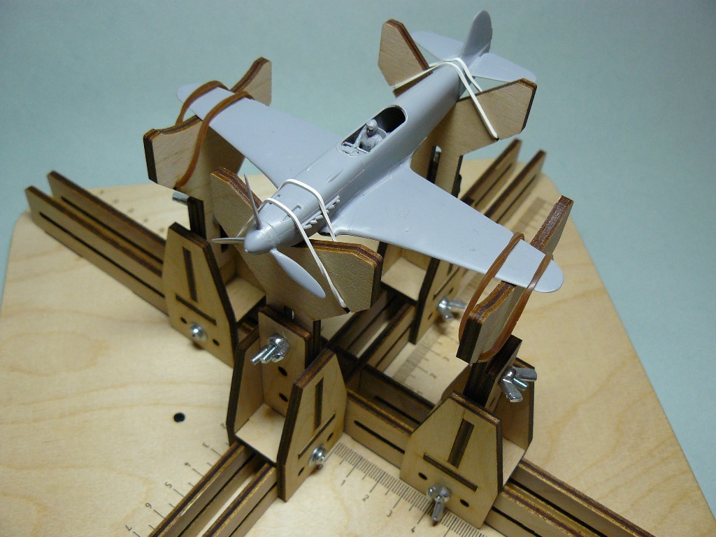 А я использую в работе куски обычного пенопласта, служащего заполнителем форм в коробках с бытовой техникой. Очень часто он имеет две стенки между которыми имеется паз. В него ,как правило, удобно вкладывается фюзеляж самолёта и никуда не сползает.