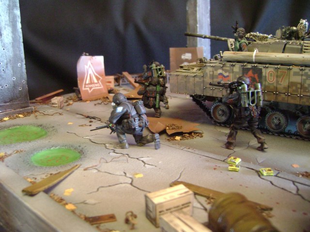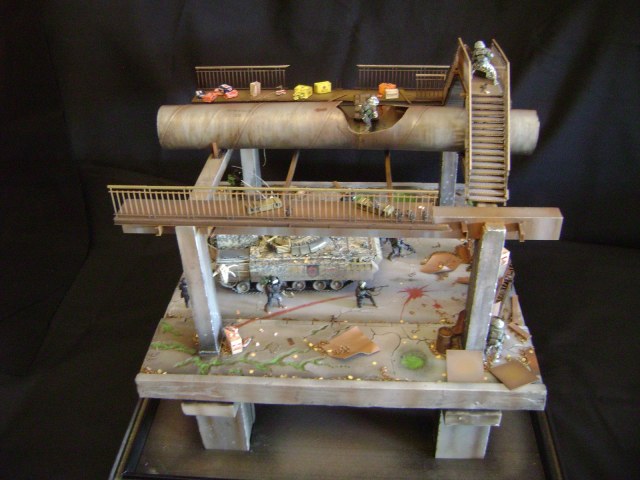 Диорама изображает фрагмент моста из игры "S.T.A.L.K.E.R. Зов Припяти". На мосту расположен пункт снабжения группировки Монолит, о чем свидетельствуют знаки на полотне моста и пиктограмма группировки на трубе. На зачистку отправлена 7ая штурмовая группа ОДОН "Пламя". Подробнее - http://karopka.ru/community/user/12866/?MODEL=309557 и http://karopka.ru/community/user/12866/?MODEL=301939. Прибыв на БМП-3 к месту назначения, бойцы десантируются и рассредотачиваются. Однако их ждет засада фанатиков-монолитовцев...