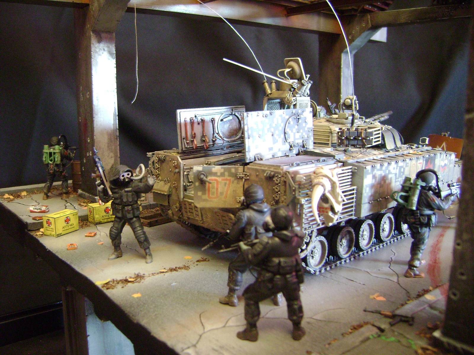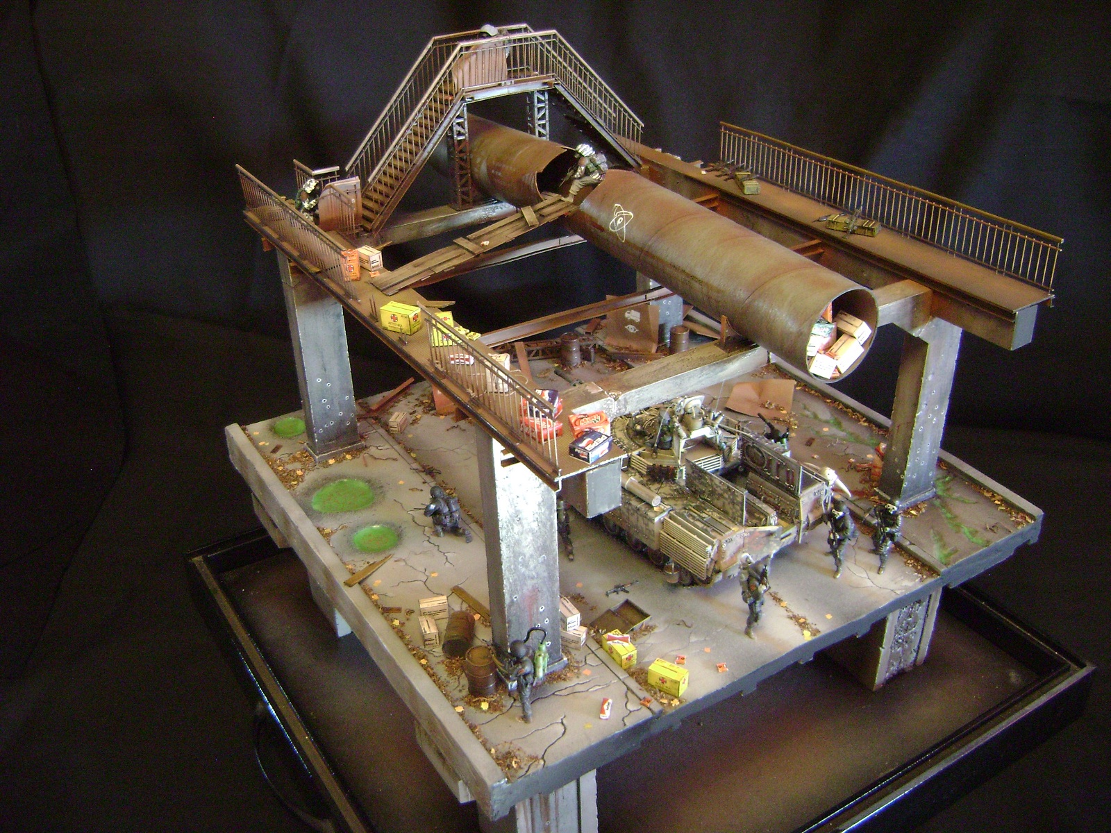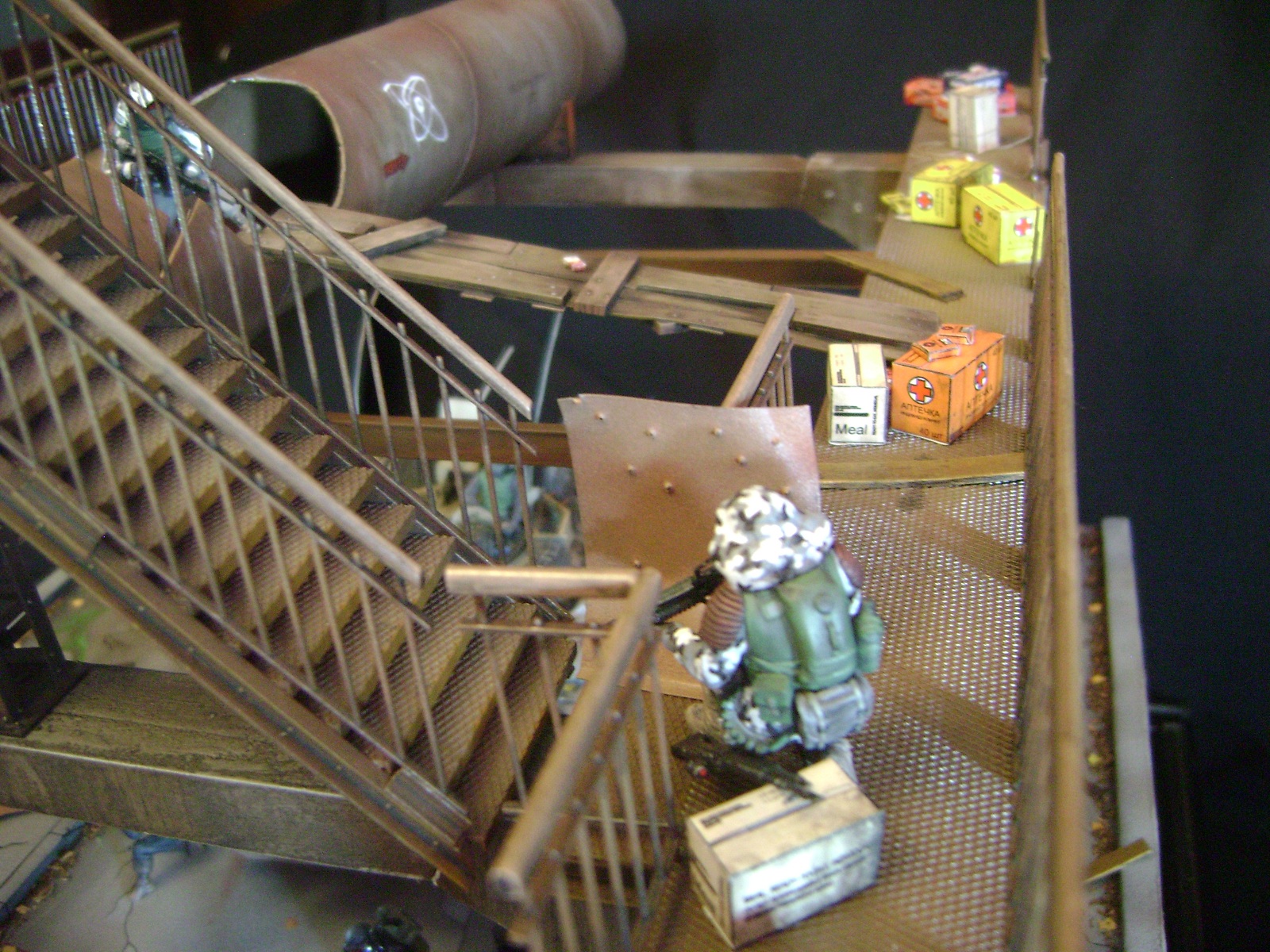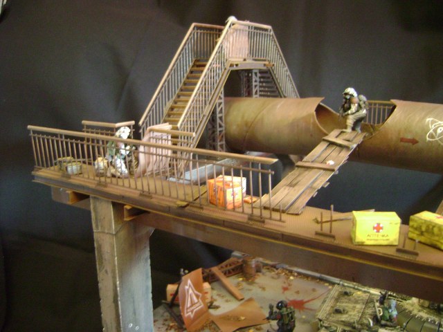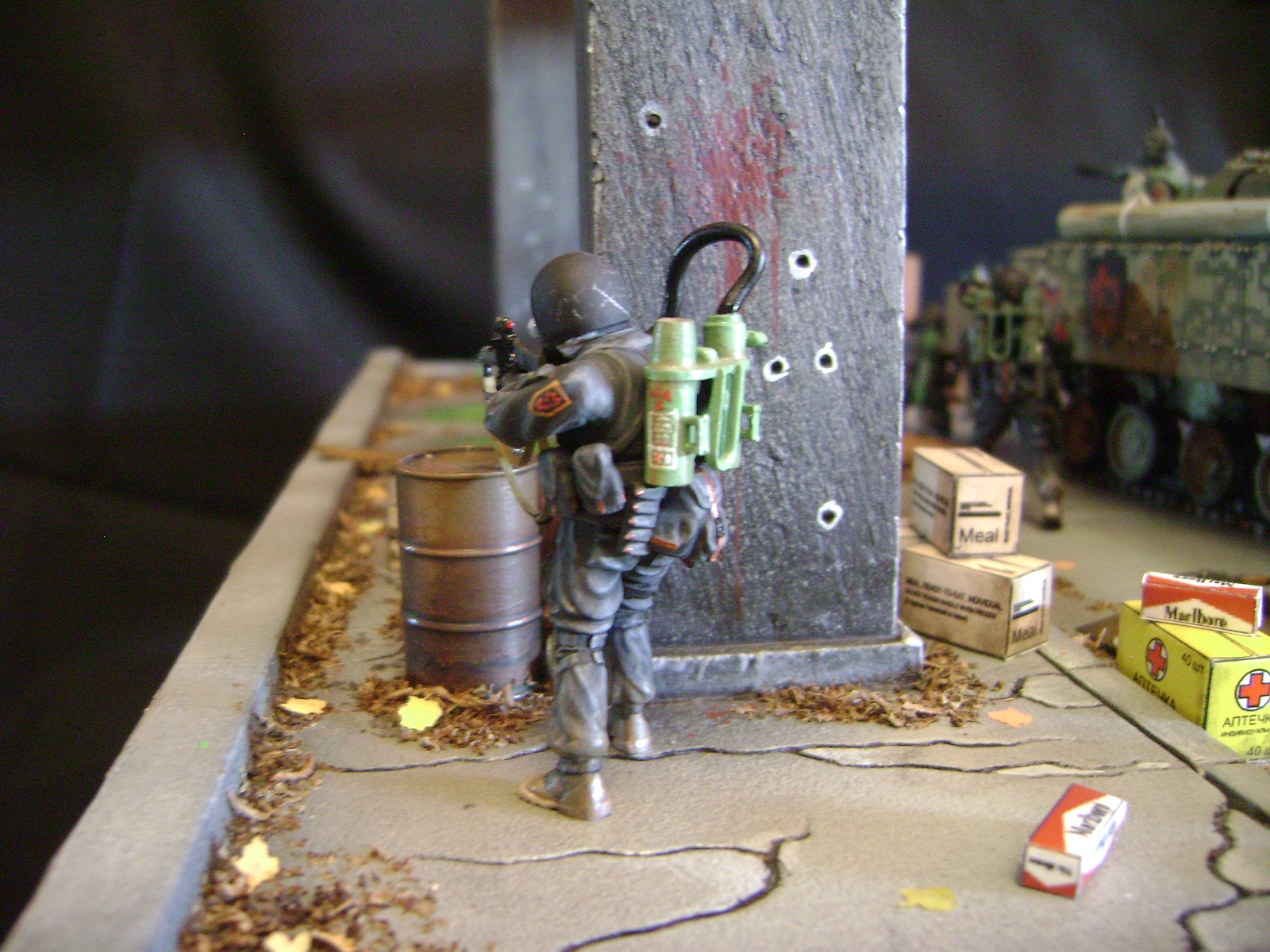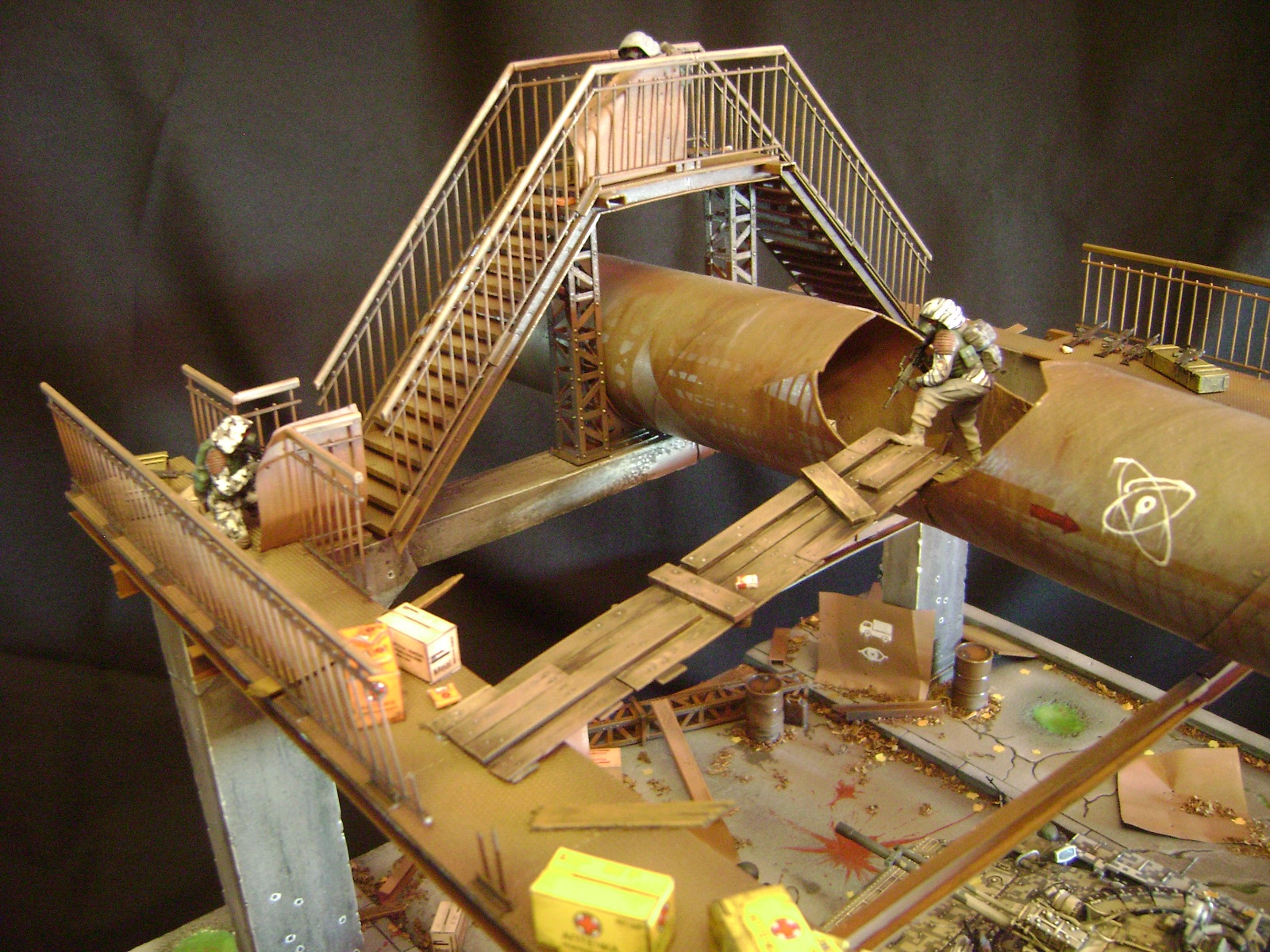 Спасибо огромное за отзывы))) По поводу аптечек - это паки... на мосту есть перевернутый пак, из которого выпали аптечки "нормального" размера))) Сделал как сделал, потому что на мосту мной изображен перевалочный пункт, место разгрузки и промежуточный склад (в трубе) логично заключил, что индивидуальные аптечки не перевозят по отдельности, а пакуют в картонные паки... По фигуркам - перепил фигур ф.Звезда и МастерБокс.