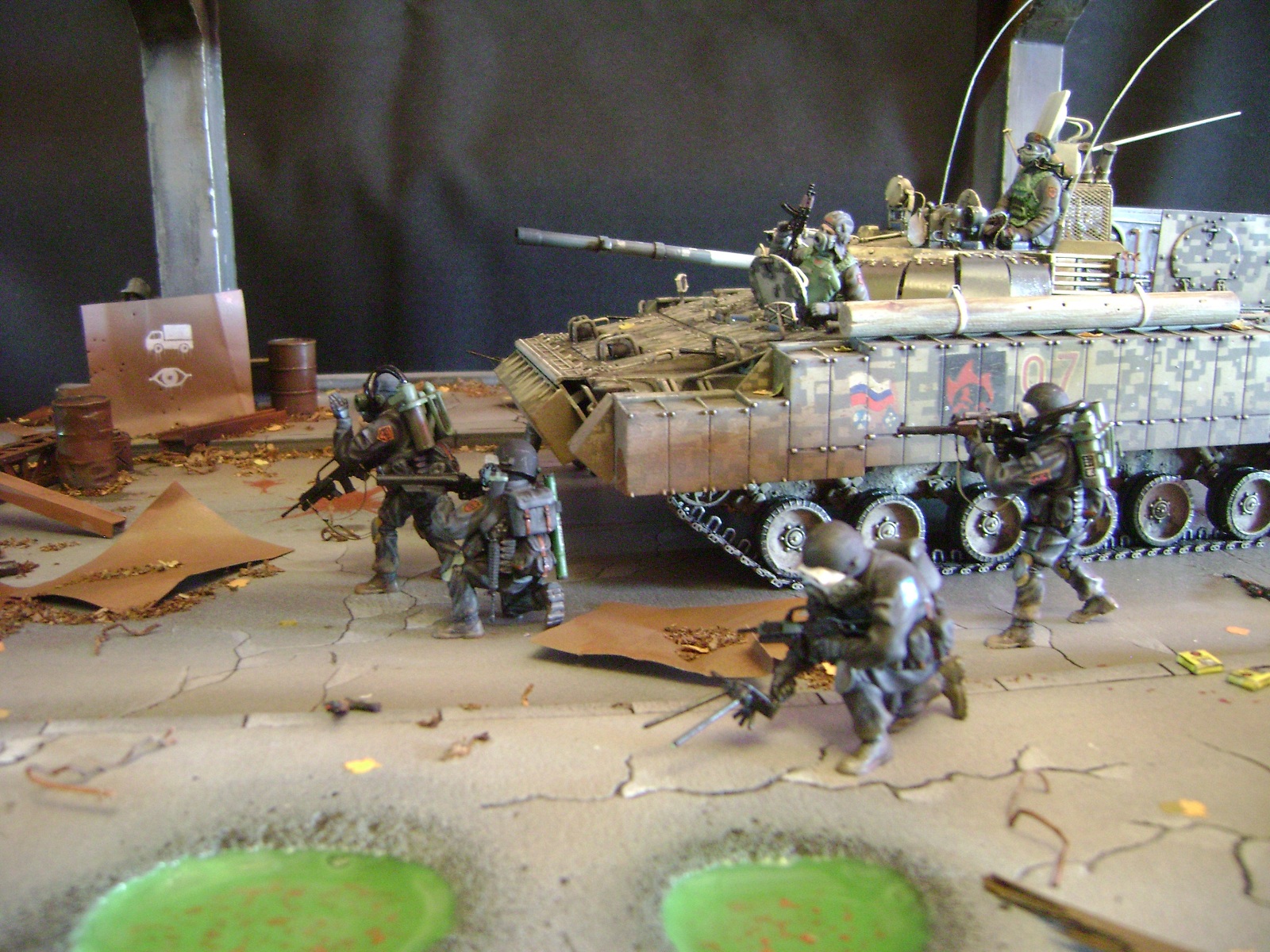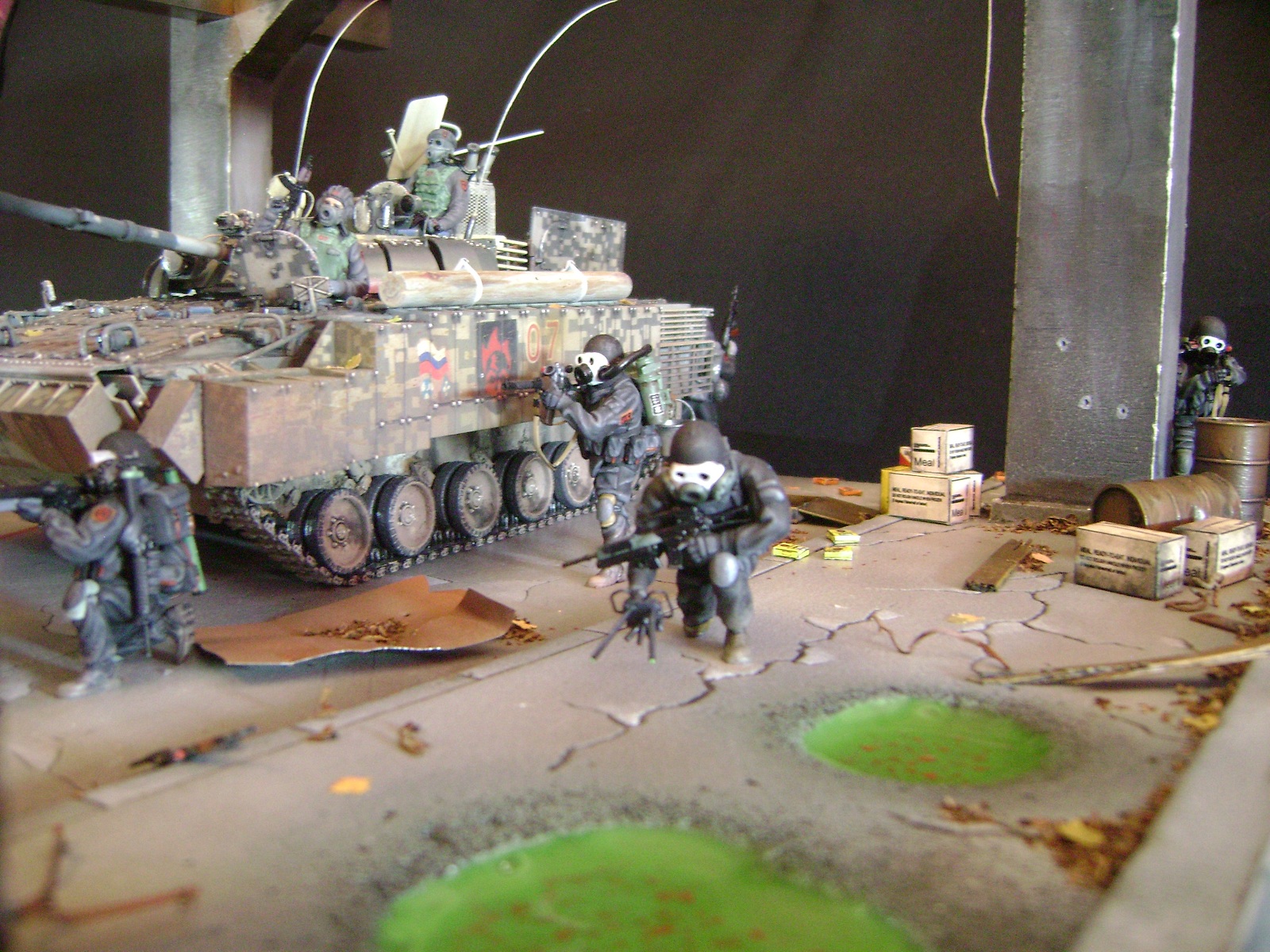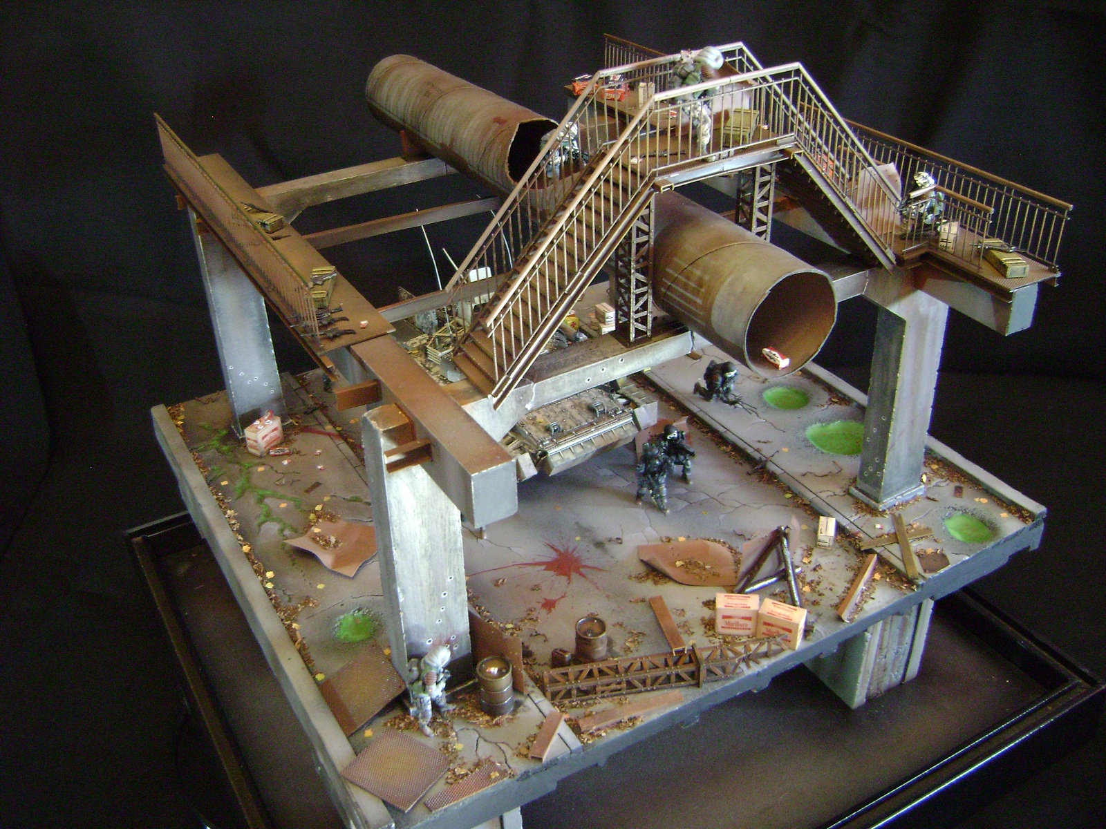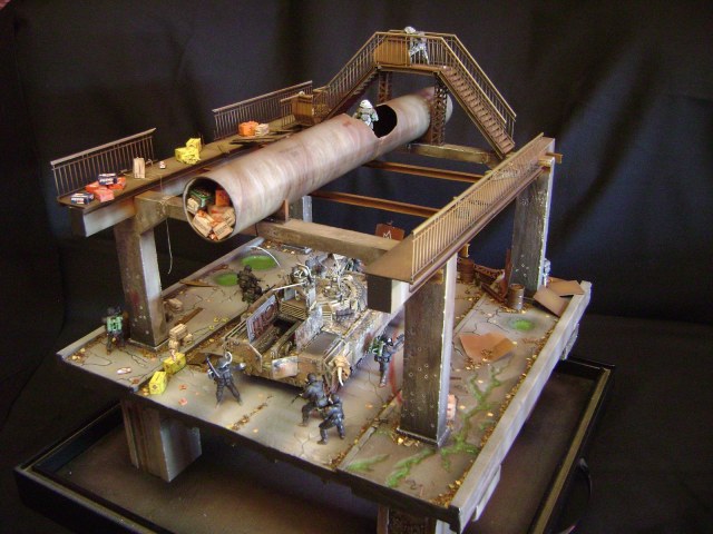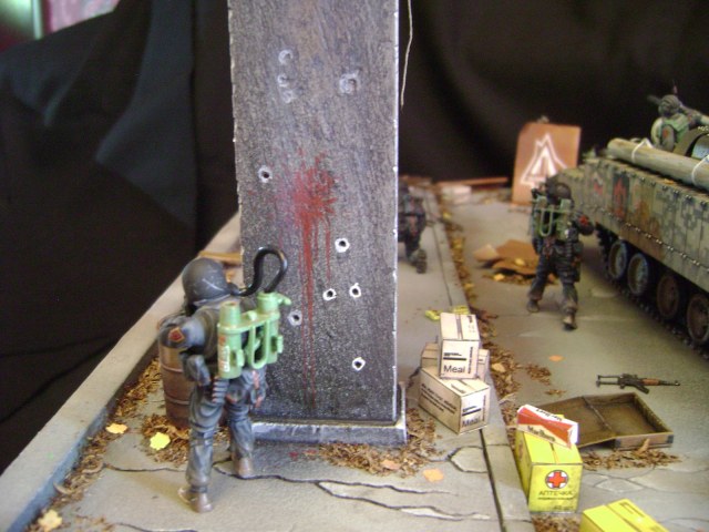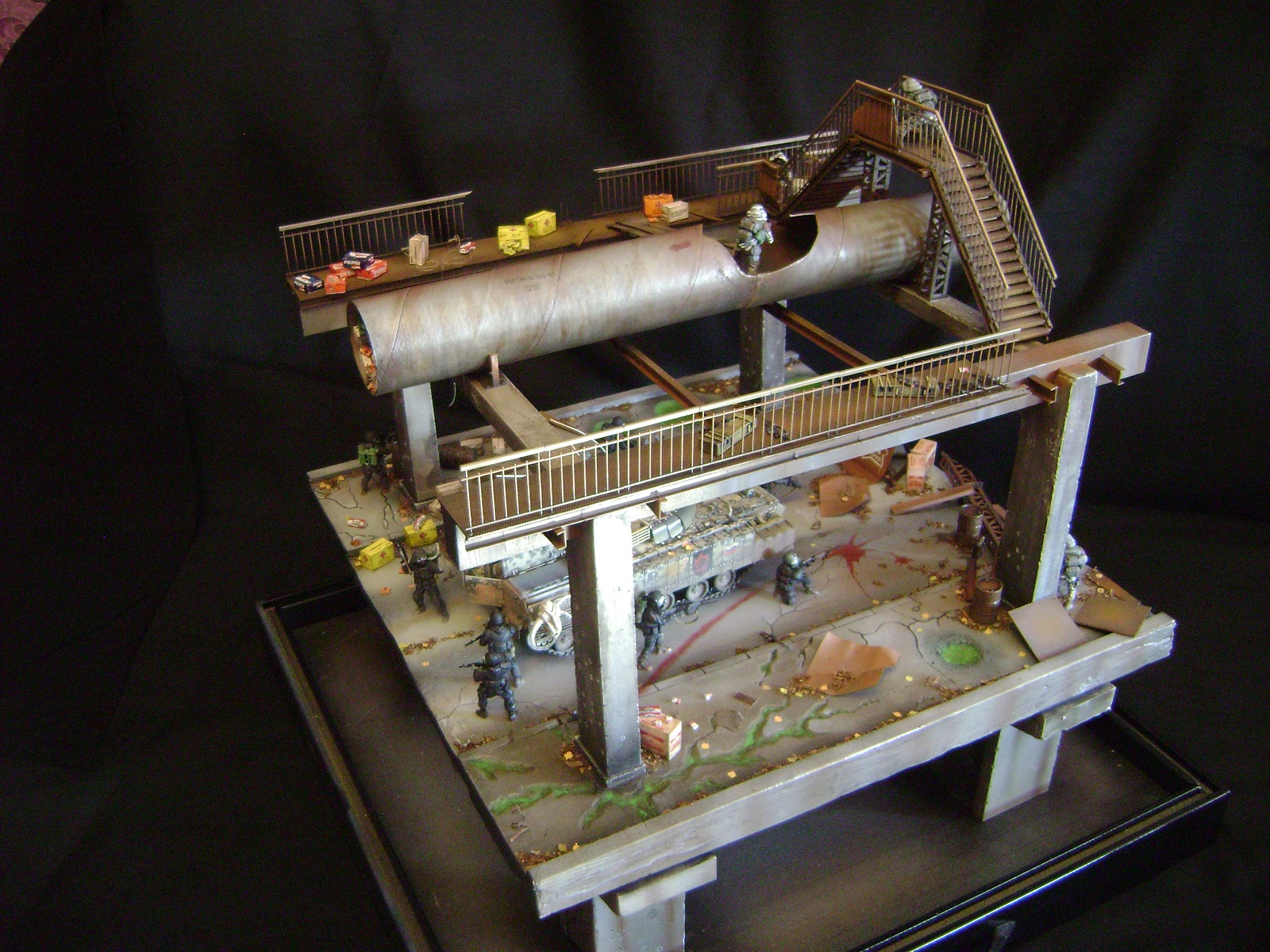 Спасибо огромное за отзывы))) По поводу аптечек - это паки... на мосту есть перевернутый пак, из которого выпали аптечки "нормального" размера))) Сделал как сделал, потому что на мосту мной изображен перевалочный пункт, место разгрузки и промежуточный склад (в трубе) логично заключил, что индивидуальные аптечки не перевозят по отдельности, а пакуют в картонные паки... По фигуркам - перепил фигур ф.Звезда и МастерБокс.