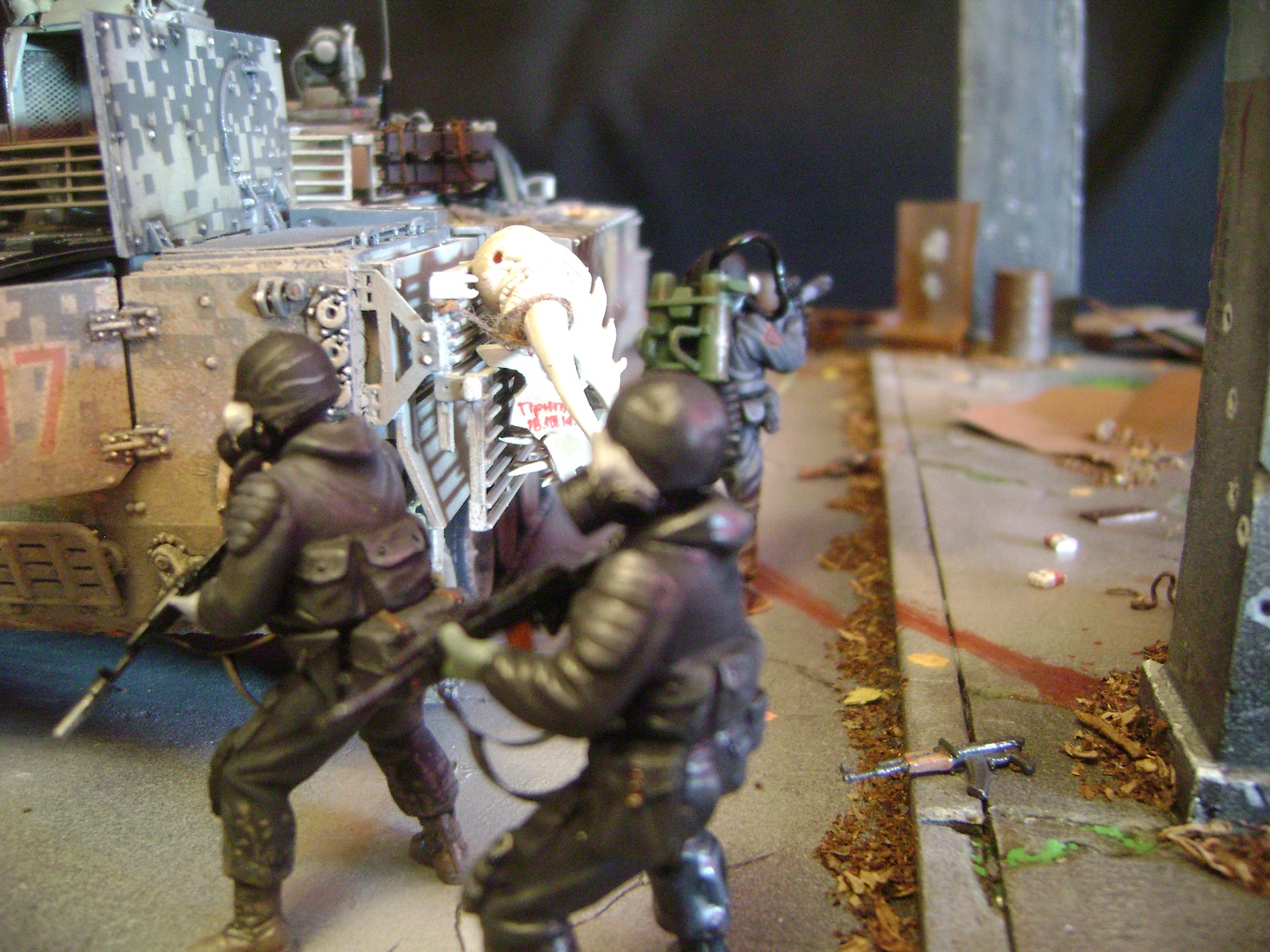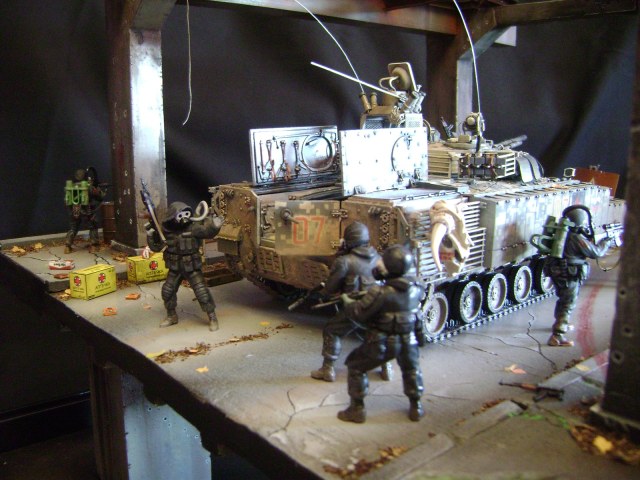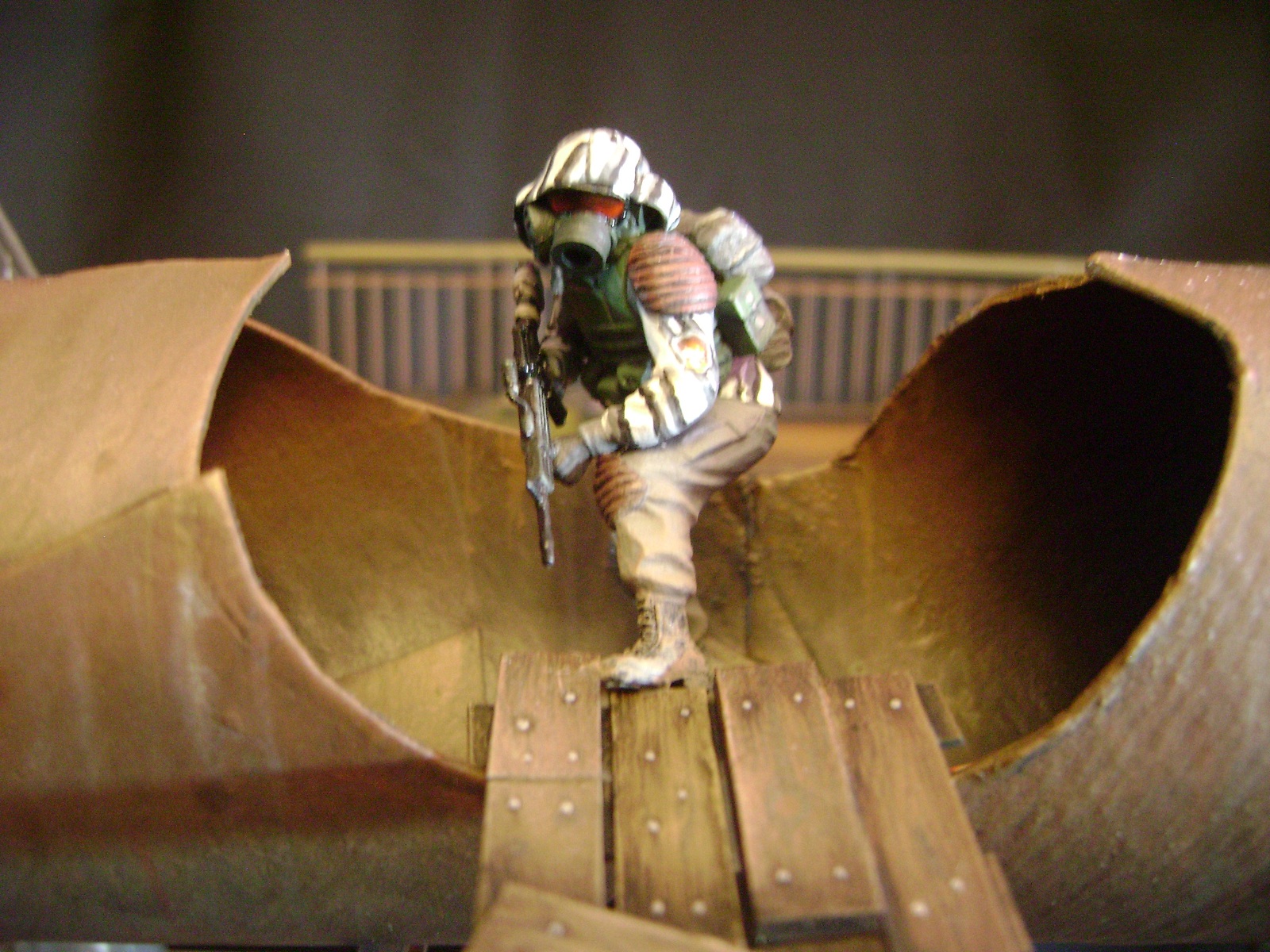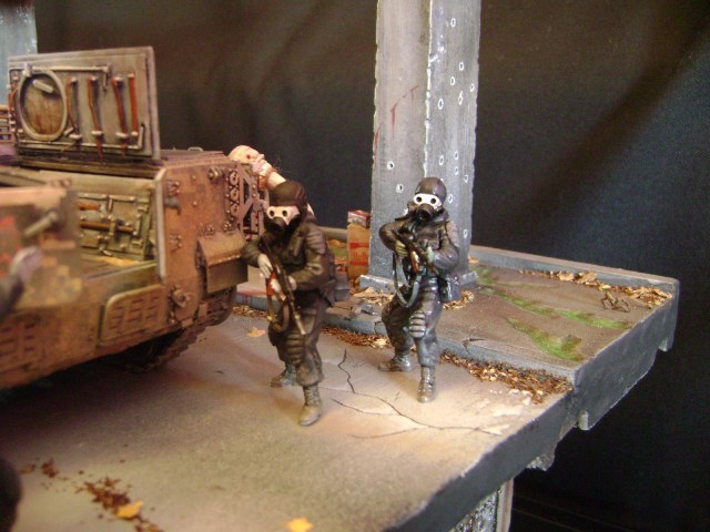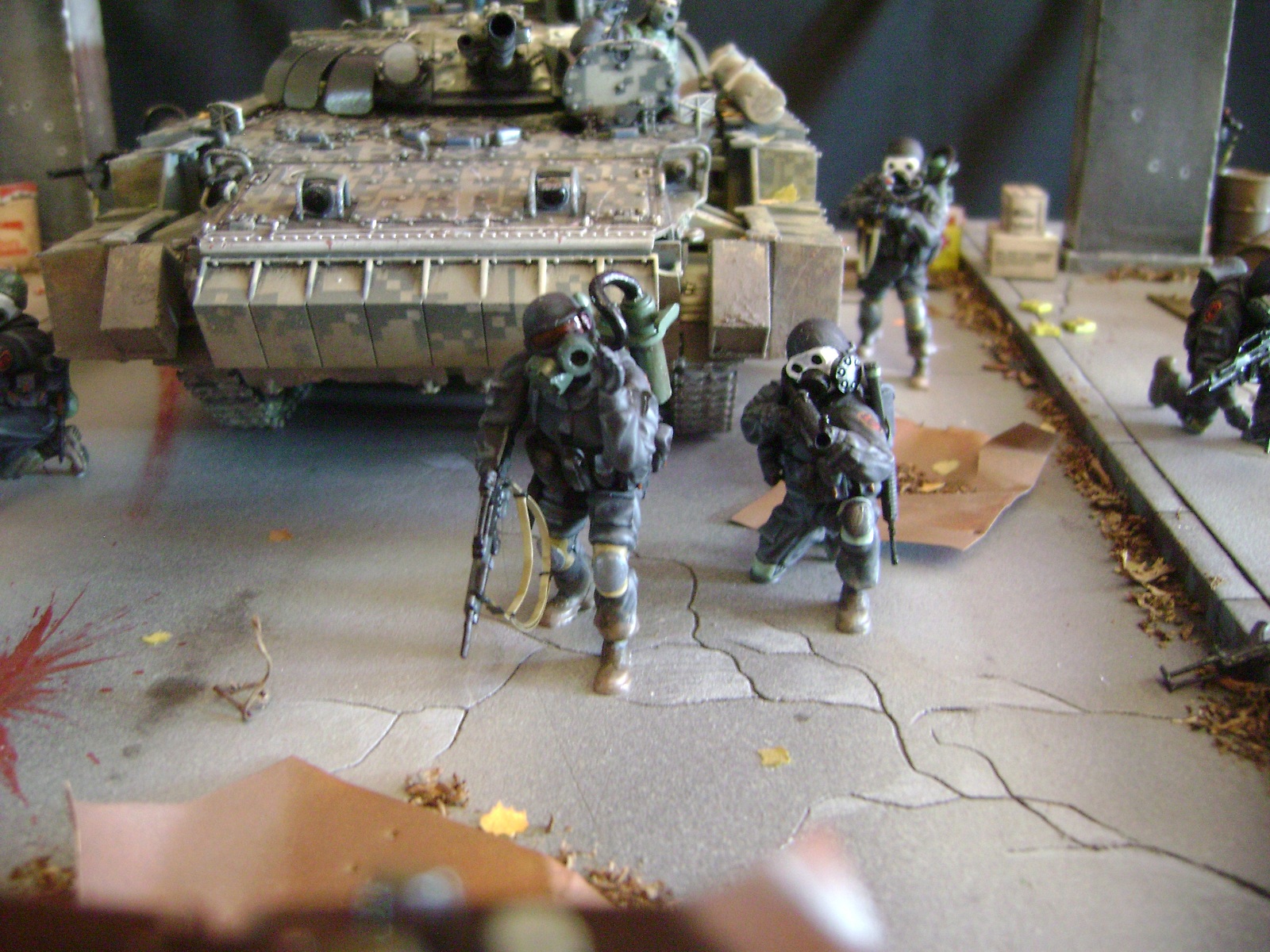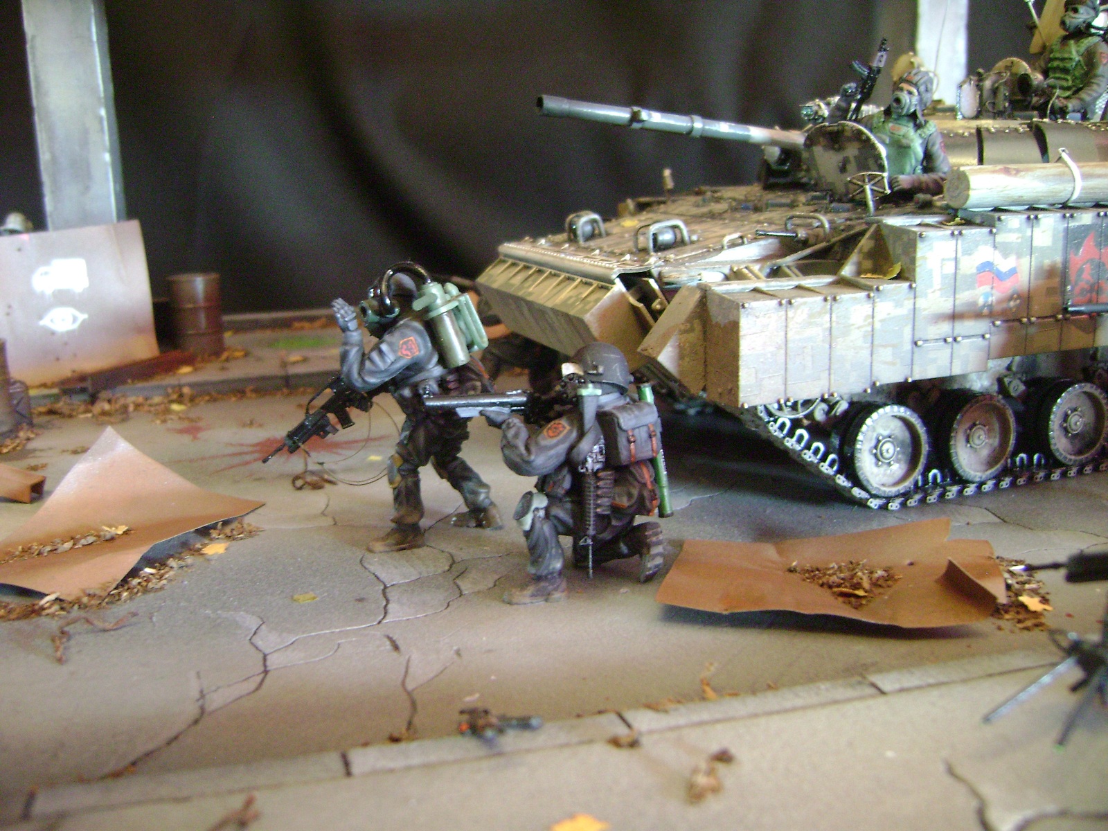 Спасибо огромное за отзывы))) По поводу аптечек - это паки... на мосту есть перевернутый пак, из которого выпали аптечки "нормального" размера))) Сделал как сделал, потому что на мосту мной изображен перевалочный пункт, место разгрузки и промежуточный склад (в трубе) логично заключил, что индивидуальные аптечки не перевозят по отдельности, а пакуют в картонные паки... По фигуркам - перепил фигур ф.Звезда и МастерБокс.