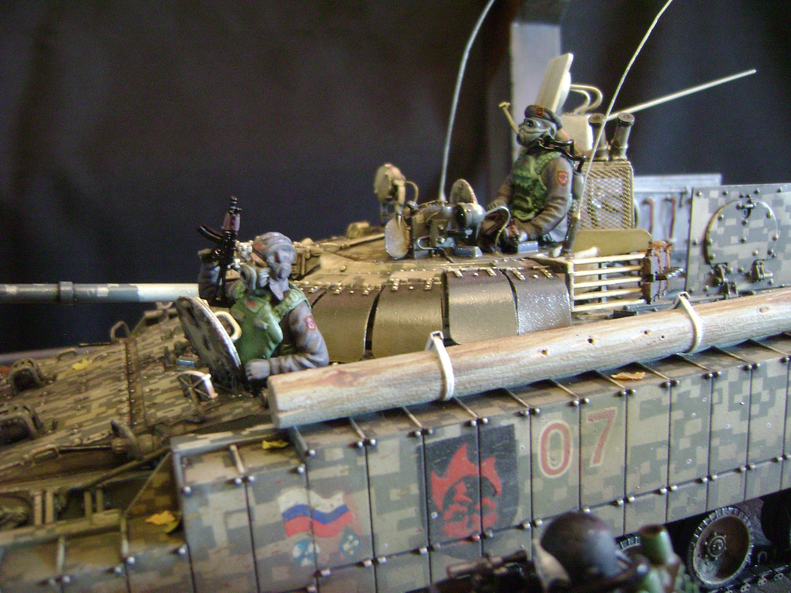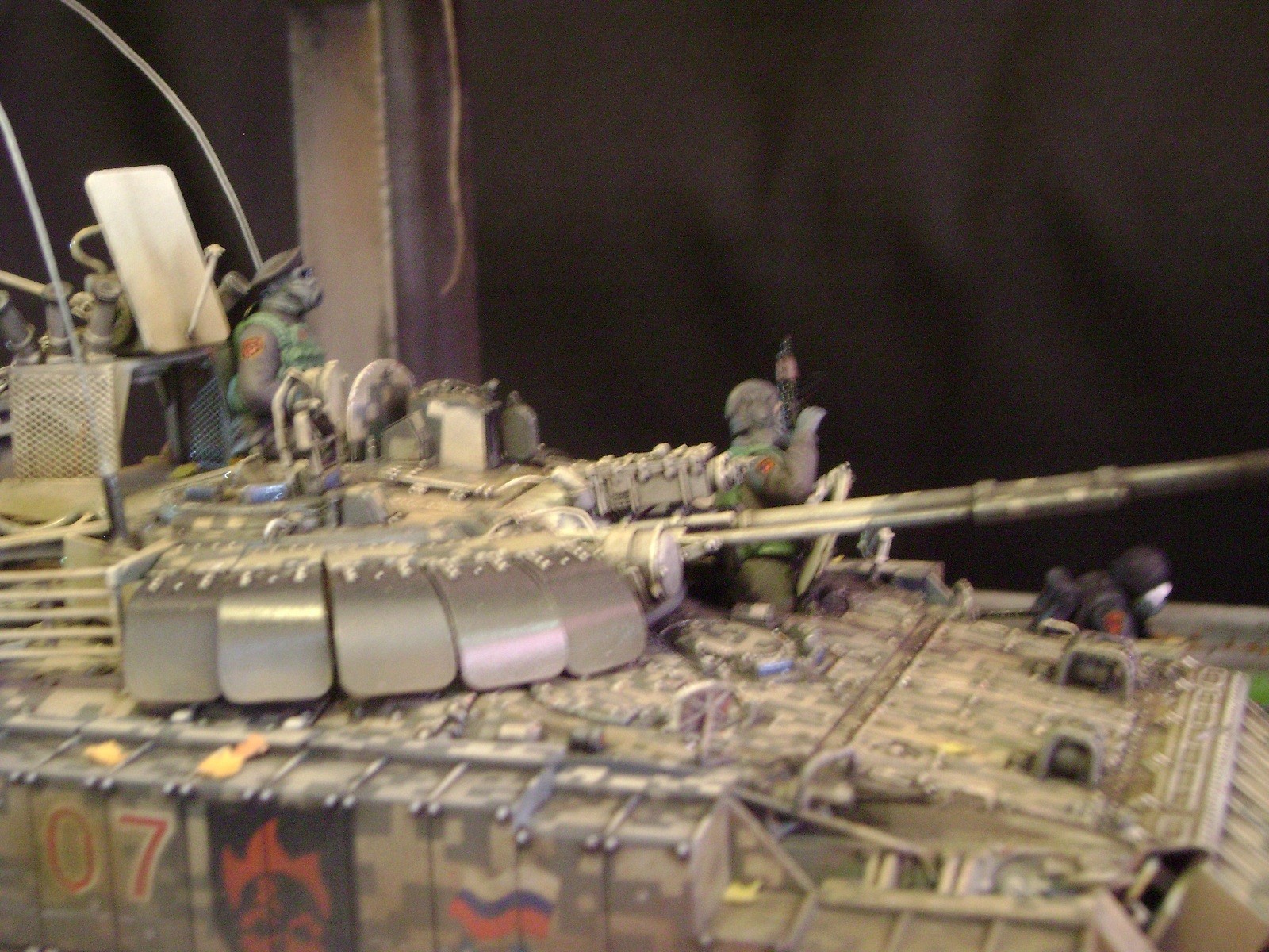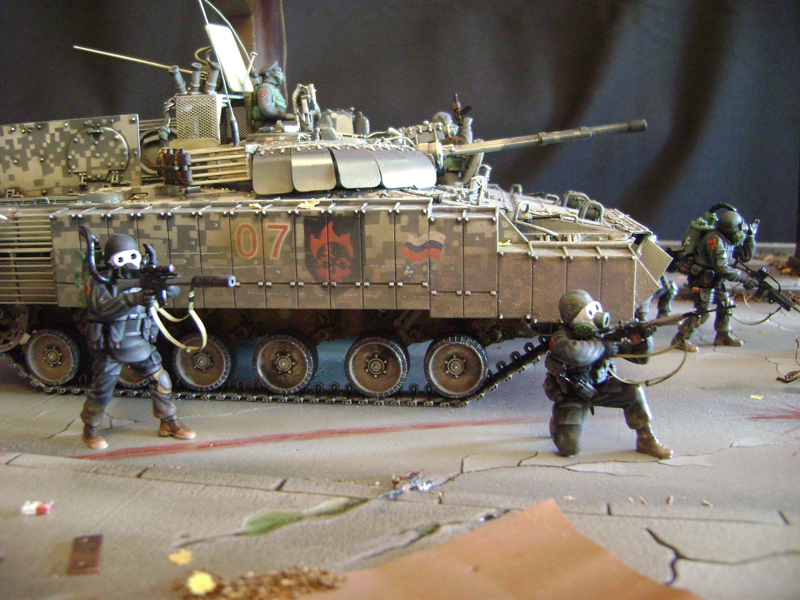 Спасибо))) это ведь фэнтези - БМП 3 с комплексами динамической защиты и внешними детекторами аномалий "Луч-М2" стали поступать на вооружение российских миротворческих сил в Предзонье в начале 2010г. Они отлично зарекомендовали себя как легкие и мобильные машины с отличным комплексом вооружения. В Зоне им не было конкуренции: вес всего в 19...20т и способность преодолевать водные преграды сделали их предпочтительнее танков, 3 пулемета, 30мм автоматическая пушка и 100мм орудие были более чем достаточны для подавления практически любого противника, отсутствие в Зоне тяжелого противотанкового вооружения в достаточных количествах у группировок сделало их серьезными противниками не только для мутантов. Машина принадлежит 7ой штурмовой группе, камуфляж цифровой городской, для ведения боевых действий в условиях промышленных объектов и, главным образом, г.Припять. На башне установлен универсальный детектор аномалий "Луч-М2", по бокам расположены 6 гранатометов. Полка, на которой установлен детектор, не препятствует удалению из башни стреляных гильз от 100мм орудия. На правом борту укреплен трофей - череп припятского мутанта, добытый членами экипажа и ставший своеобразным талисманом машины.