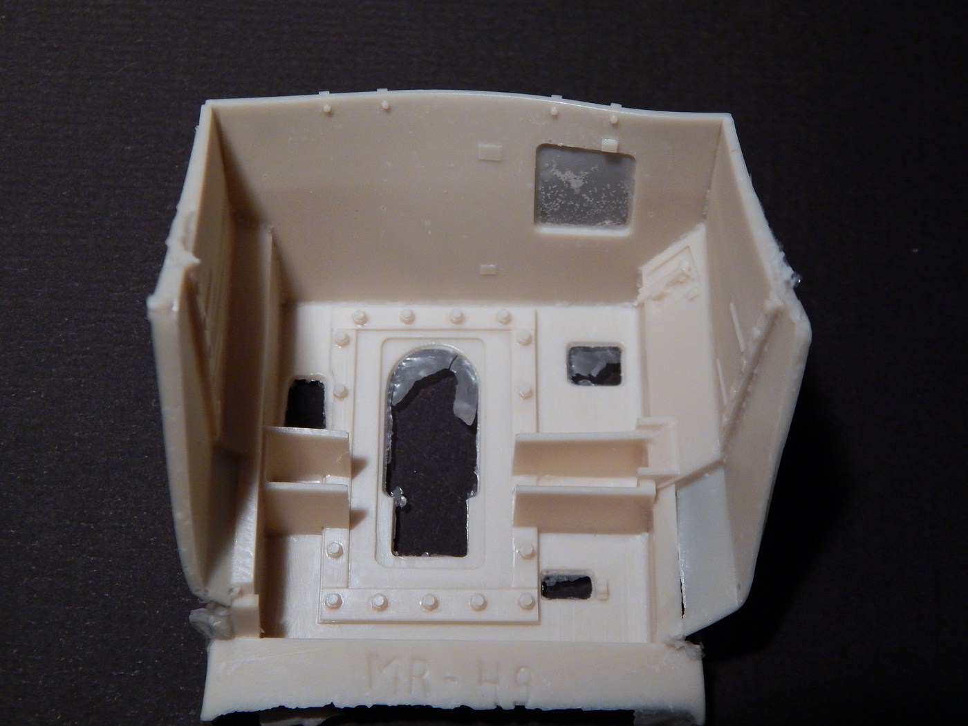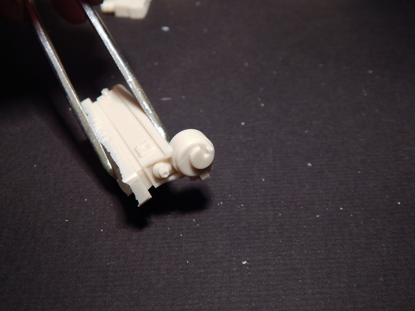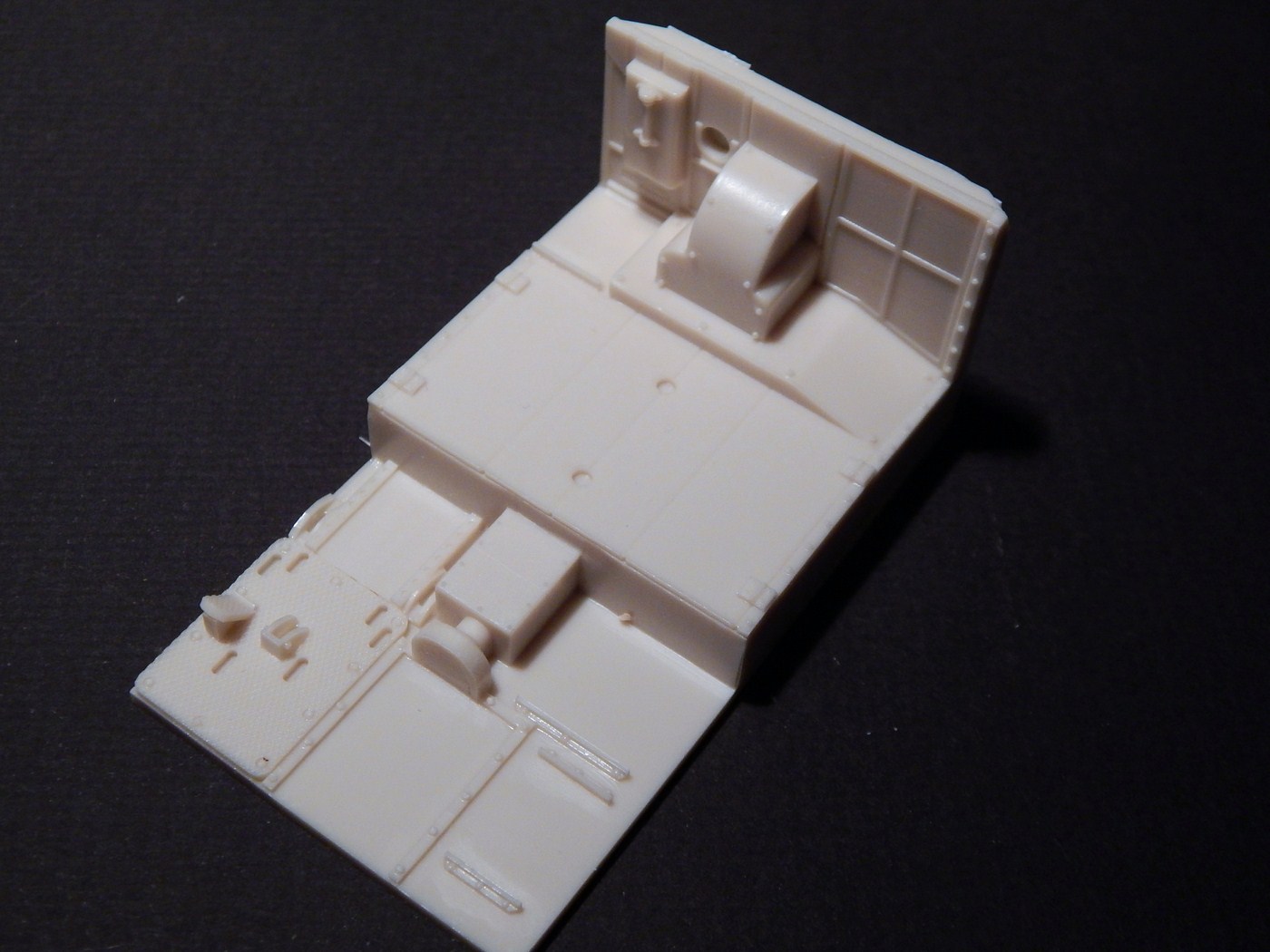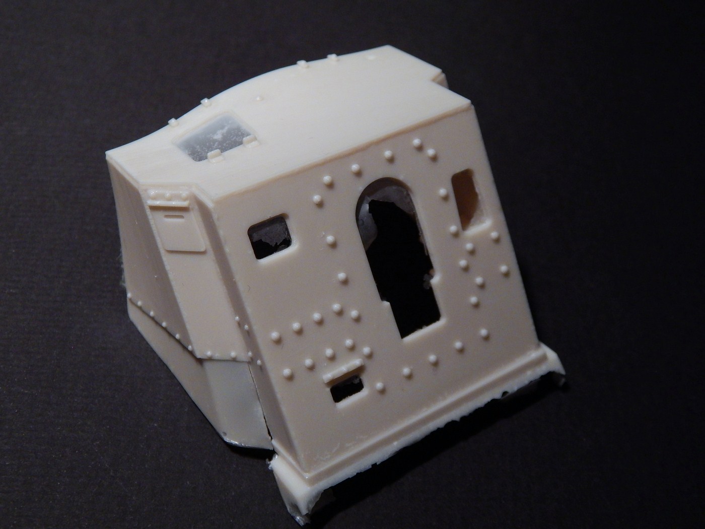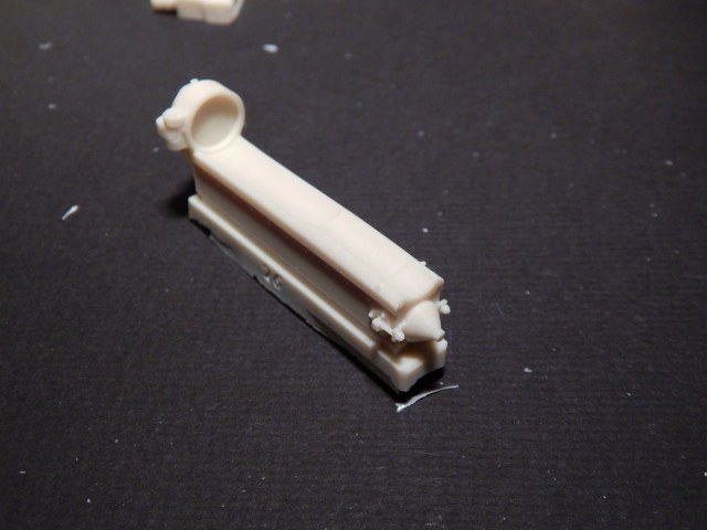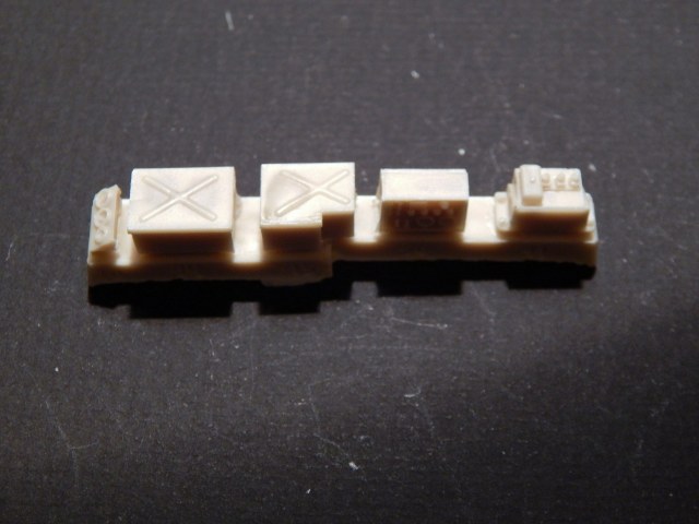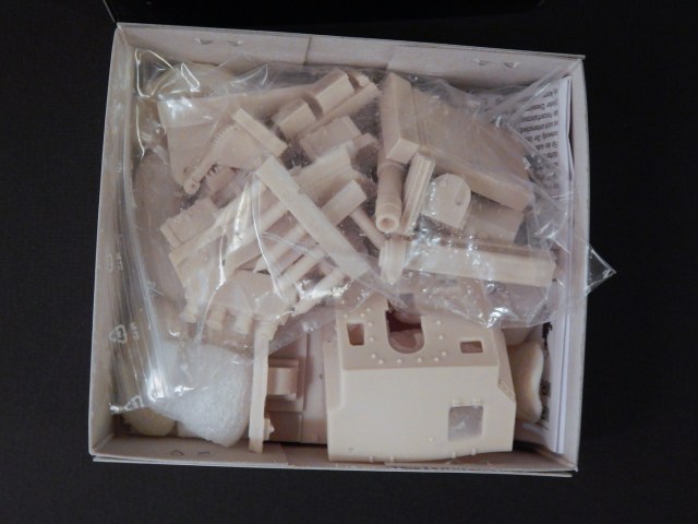 Сразу скажу, что я никогда всерьез не сталкивался со смолой. Не лил, не собирал смоляные наборы и т.д. Читал, что смола капризна, плохо собирается, надо много шпаклевать... В общем, после того, как я заглянул в коробку с набором, я понял, что это первый и последний набор из смолы, который я буду делать. Выглядит все очень непросто. Самая страшная часть - рубка. Крыша поведена волной, боковина пытается оломаться по шву. Остальное выглядит более-менее неплохо, всякие ящики вообще отлиты чисто и четко. На мелочевке есть облой. Ствол разумеется без нарезов, отверстие очень неглубокое. Вроде бы даже прямой. Вообще от всего этого становится грустно, появилась мысль просто обмерить детали и сделать по ним из пластика, к которому я более привычен.