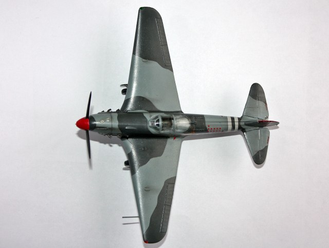 Борис, а третий то лучше был наверно. Портят впечатление стойки, винт с коком болтаются. Опять контрастные цвета с резкой границей, также чересчур яркий винт, притушить бы лучше. В общем окраска далека от реальности. С пятнами камуфляжа явная путаница. На фото №22 с настоящим самолетом, хорошо видно что орден КЗ нарисован на темном пятне, на модели совсем наоборот, на светлом. Кстати, расположение пятен на наших истребителях было четко определено: