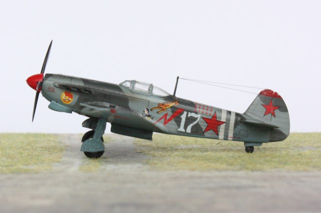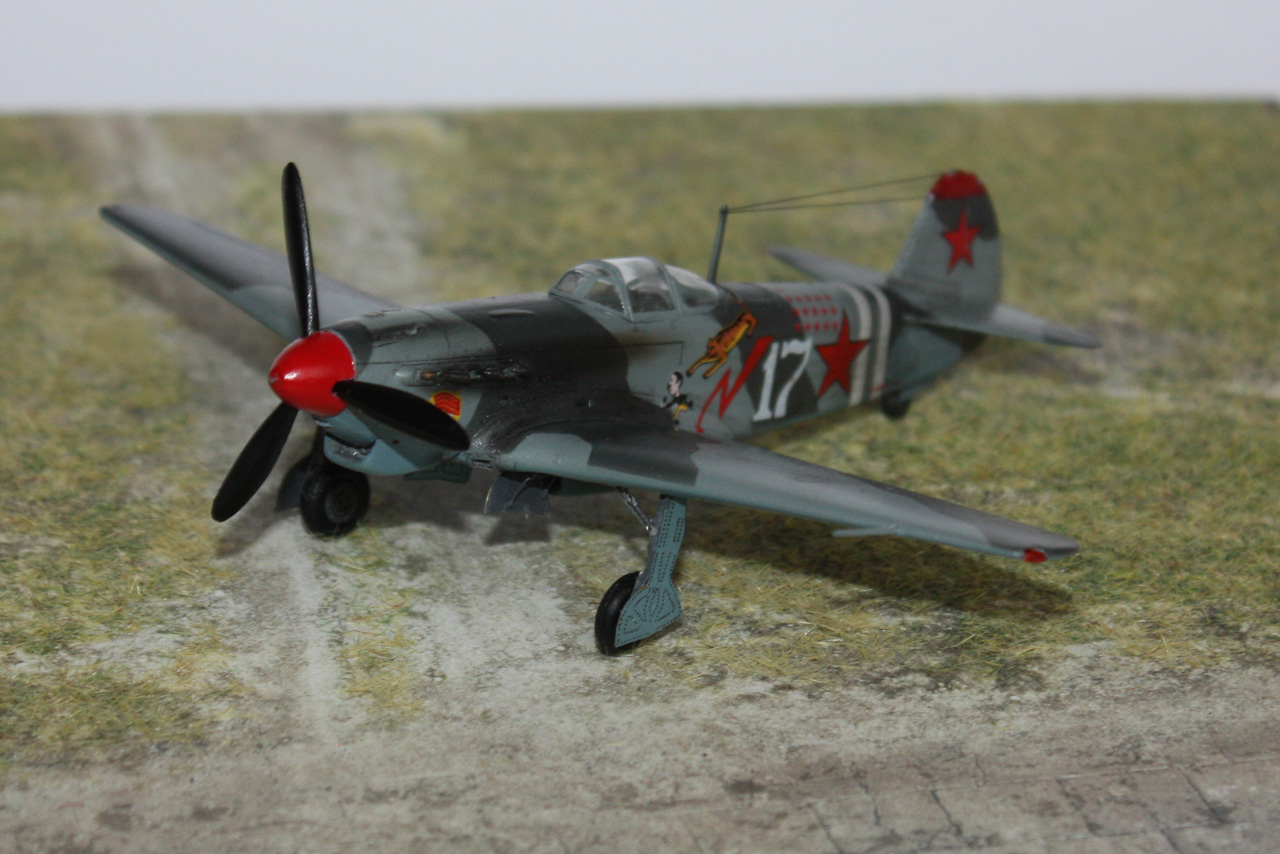 В отличие от предыдущей модели Як-3 эту модель собрал с небольшими доработками, использовав травло от АСЕ, жестяные патрубки «Москит» из старых запасов и резиновые колёса со смоляными дисками от Андрея Абоимова (Фирма «Экипаж»). Кожух пушки и ПВД – игла от шприца; механизм складывания створок - проволока. Доработанную кабину, к сожалению, не видно, фонарь толстый и мутноватый. Привязные ремни из тамиевского скотча, пряжки - проволока.