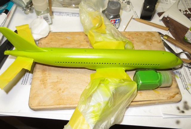 Это точно!, к тому-же еще надо замаскировать кучу эллюминаторов,если не заливать их спец-жидкостью, проще окрасить половинки фюзеляжа, а потом стекла вклеить, собрать, и доработать швы.