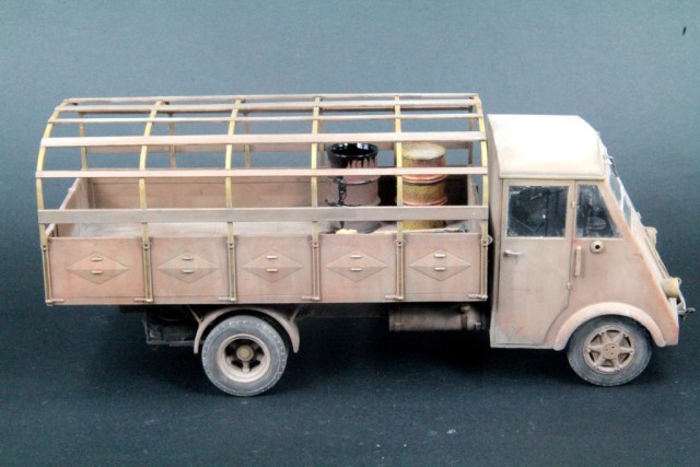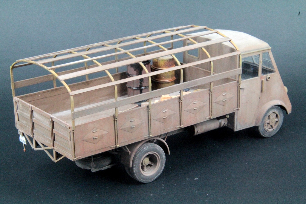 По поводу цвета - машина полувоенной организации, стандартные армейские цвета окраса не использовал, а взял светло коричневый. Через основную базу начала выходить ржавчина, на которую легла пыль от стройки. В принципе эффекта однотонности и блеклости (тлен и безисходность) авто я добился, т.к. я сделал одну из более чем 4000 таких рабочих лошадок использовавшихся в то время.