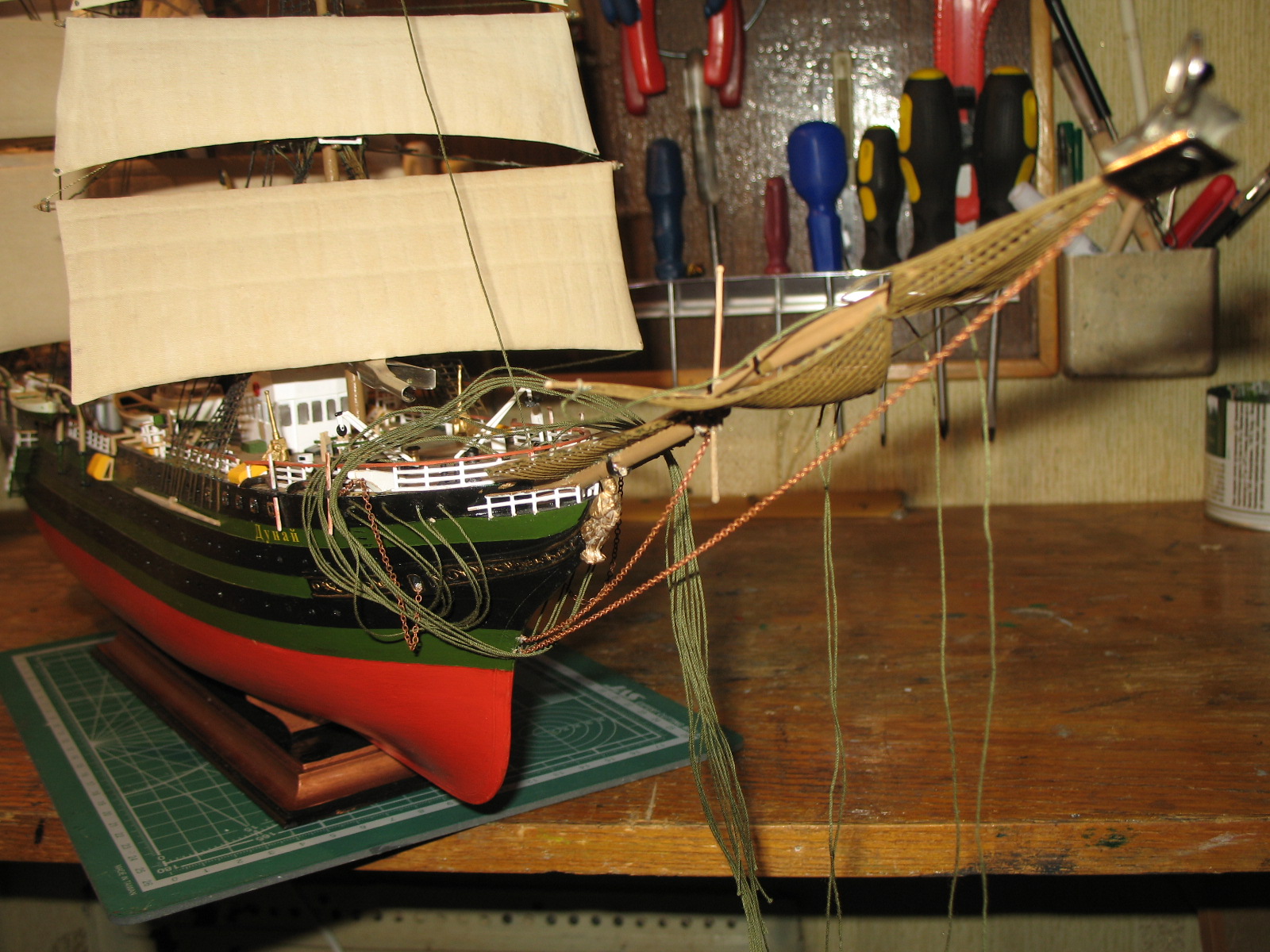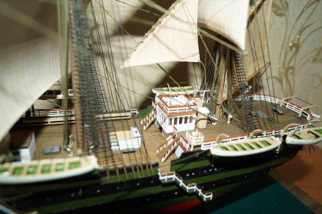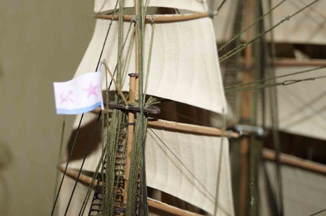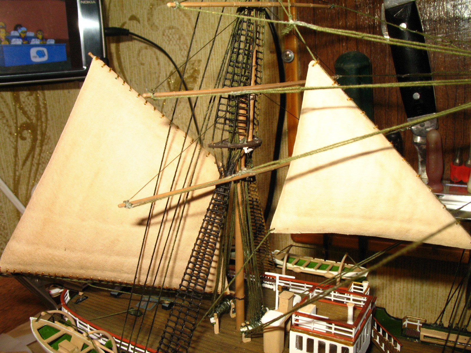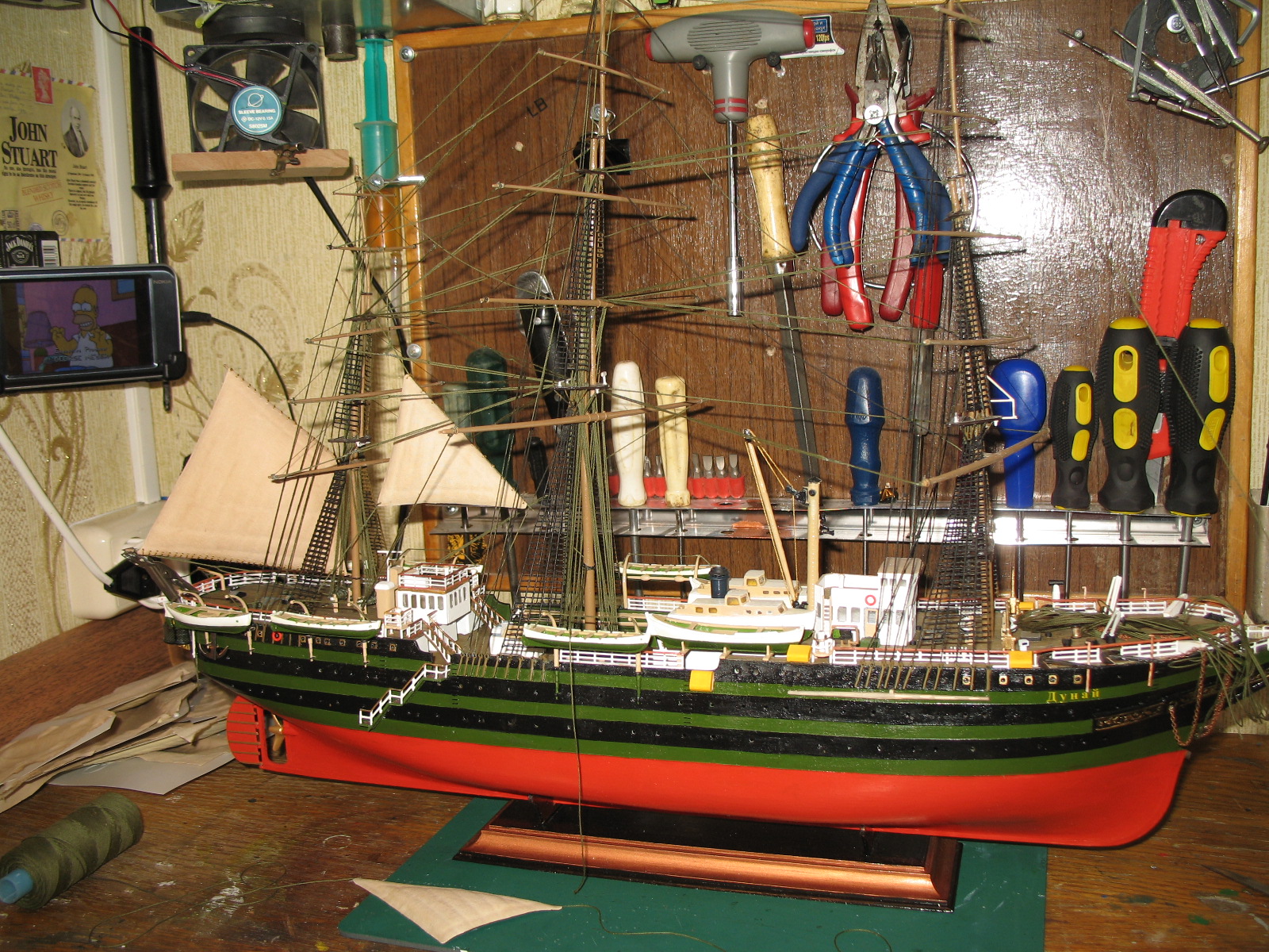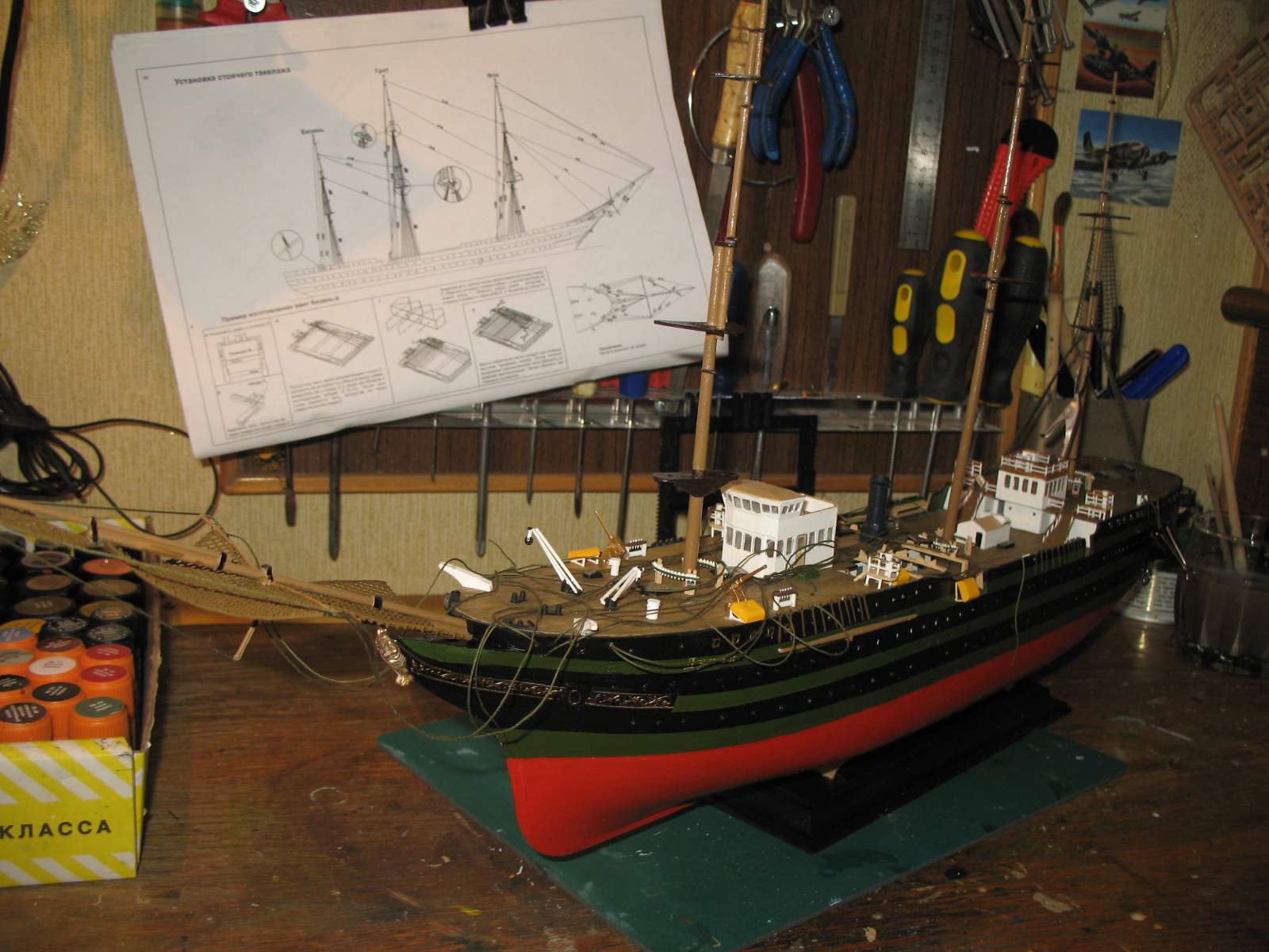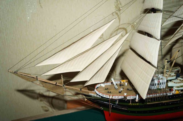 Модель понравилась. Удачно получилась палуба, а вот сам корпус надо было красить в серый цвет. По поводу нитей и блоков уже сказали.