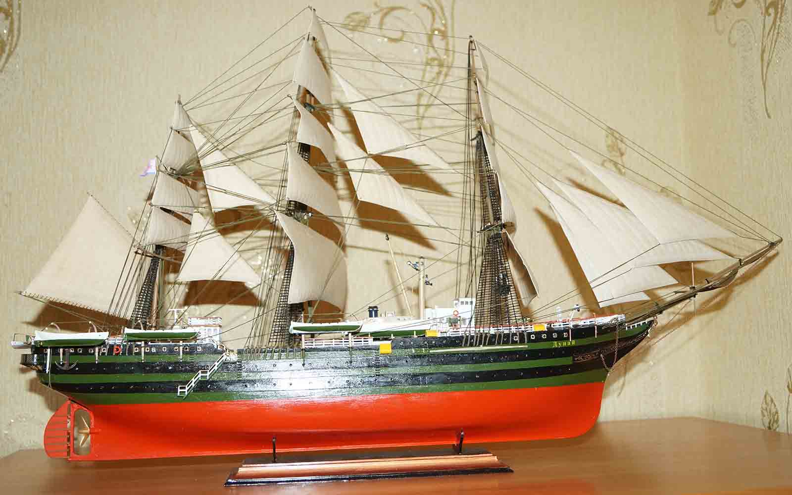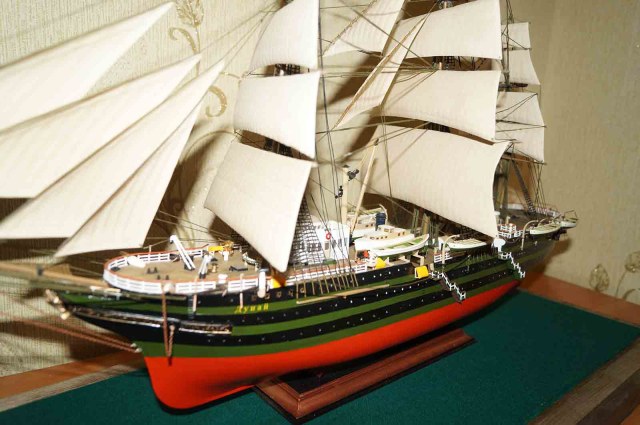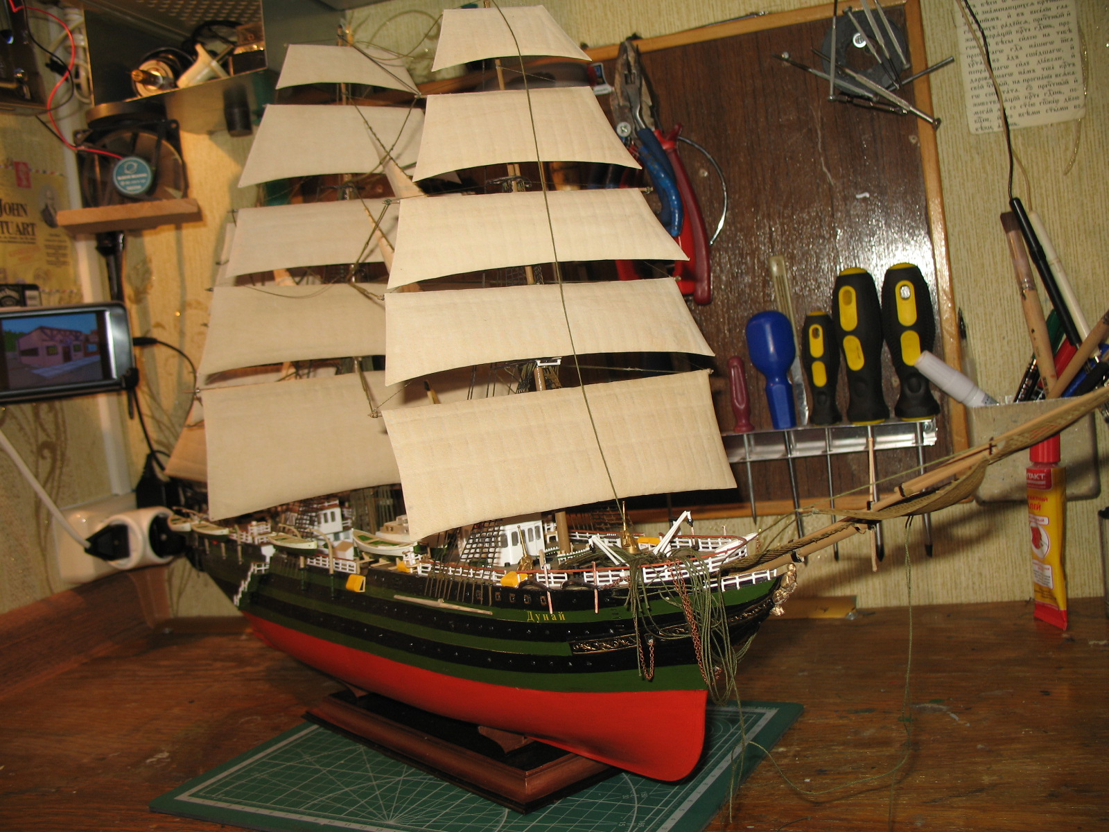 На суд уважаемых форумчан выставляю очередное моё гениальное творение в виде парусника Дунай от фирмы моделист. Строился корабль ни мало, ни много год почти . Постройка парусника всецело зависела от моего желания , времени и, естественно , вдохновения. А вот последнего как раз было мало . Но, это все лирика . А теперь собственно о моих потугах в деле постройки... Открыв коробку я обнаружил точную копию ,,Америго Веспучи,, . Имя сего храброго мореплавателя было высечено на литниках парусника, из чего ваш покорный слуга все таки додумался , что набор ( как и сам настоящий парусник ) является перепаком от Heller. Единственно, что делало ,,Америго Веспуччи,, парусником под именем ,,Дунай,, , это декаль с последним его названием. В процессе сборки было желание превратить его в Америго... Но пред глазами упорно маячила только одна пара декалей с именем ,,Дунай,, что существенно ограничивало желание дать ему его первое имя. Не буду утомлять вас историей сего славного итальянца. В интернете и так полно информации о его жизни и, практически бесславной кончине. В процессе строительства сложностей особых не возникало. Литники, в принципе нареканий не вызывали. Стыки подходили прекрасно. Ничего плохого о производителе сказать не могу ( хорошо снятая копия Heller ).Краска акриловая от Звезды. Корпус покрыт акриловым глянцевым лаком . Паруса оклеены белой тканью, предварительно окрашенными в чае. С самого начала было желание поместить модель в стеклянную витрину. Сам решил не делать, ибо со стеклом работать не умею. Поручил профессионалам в специализированной мастерской . Вышло немного тяжеловато. Сама витрина весит 8 кг. а подставка из сантиметрового стекла вышла на 13 кг . Итого 21 кило. От стеклянной подставки пришлось отказаться . Поменял на деревянную. Вышло еще лучше. Подставку же дополнительно оклеил сукном ( старая, настоящая, спасибо родителям, в загашнике завалялся добрый отрез качественного материала). На данный момент готово все, за исключением деревянных уголков на самой витрине . В процессе наклею. Собственно и все. Готов к летящим в меня кирпичам и табуреткам .