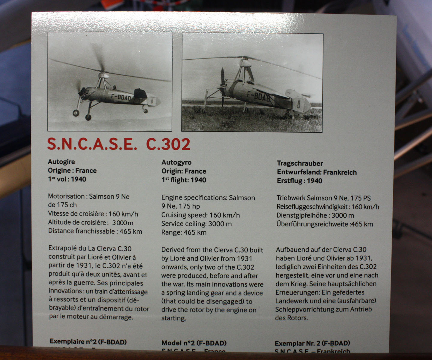 Очередной экспонат из французского музея Le Bourget, автожир S.N.C.A.S.E. C.302, лицензионный вариант Cierva С.30А, изготовлявшийся заводом "Лиор эт Оливье" с двигателем Сальмсон 9Ne в 175 л.с.Про музей можно посмотерть общий обзор здесь