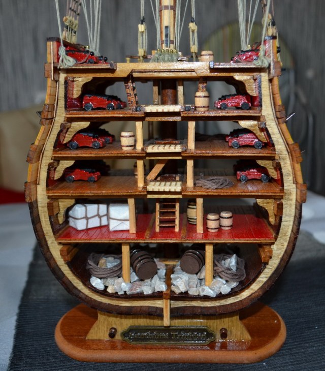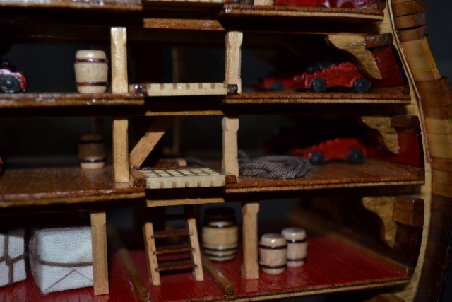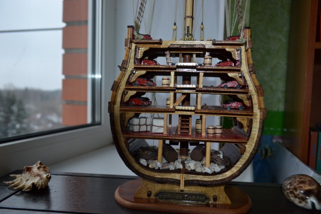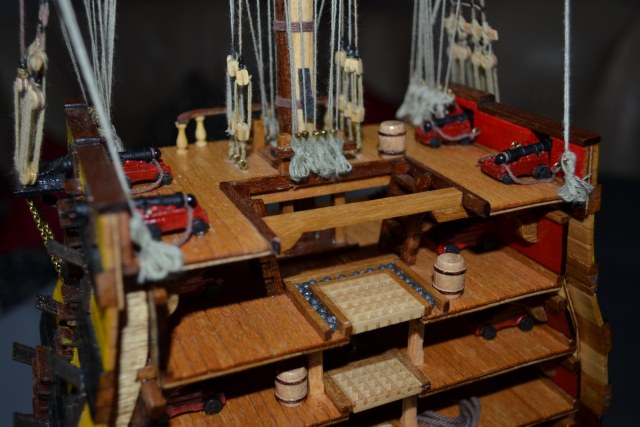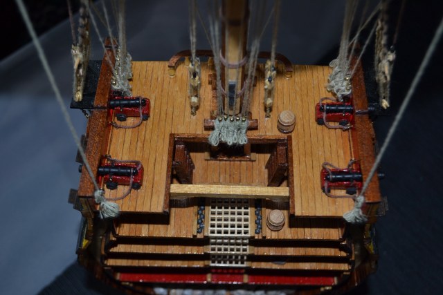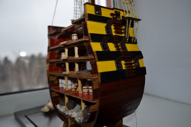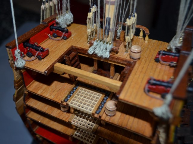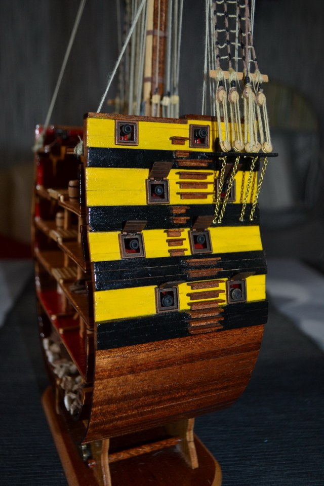 Как изкоробочная версия смотрится красиво. Однако много латуни, пушки нижних палуб не обвязаны. Также не соглашусь с бардаком в трюме. Там все должно быть аккуратно уложено и камни и бочки. Это же балласт, с ним не шутят.