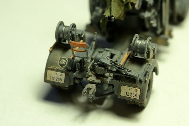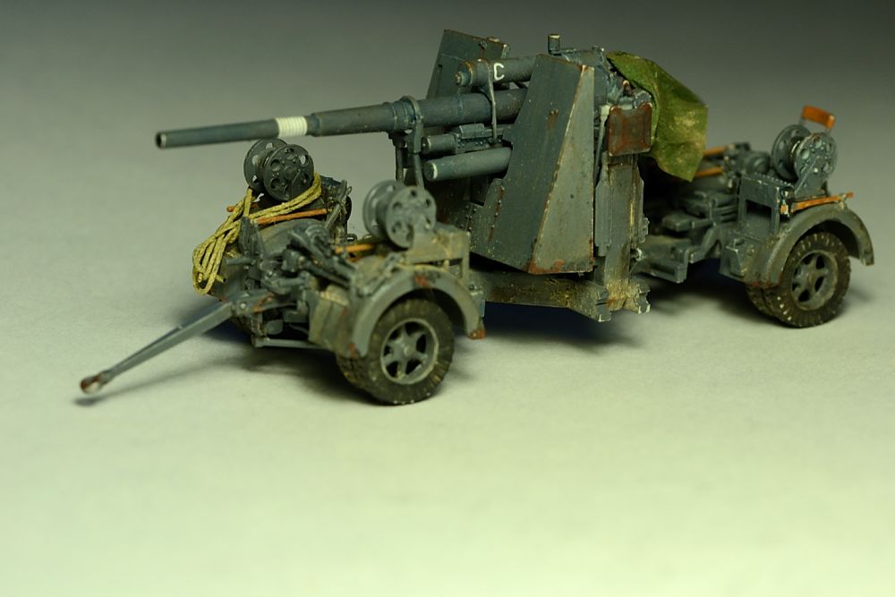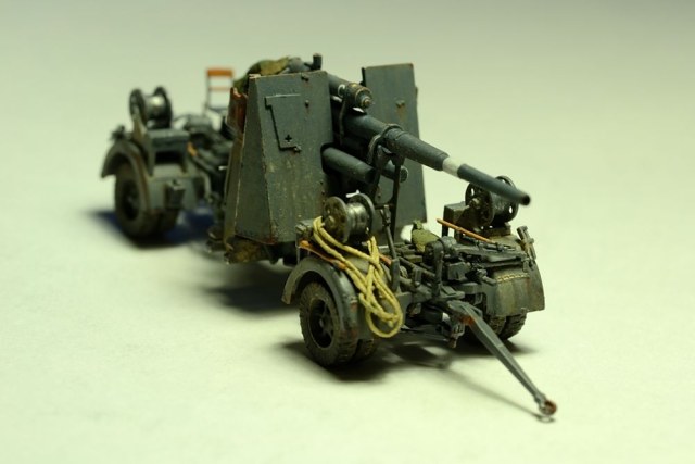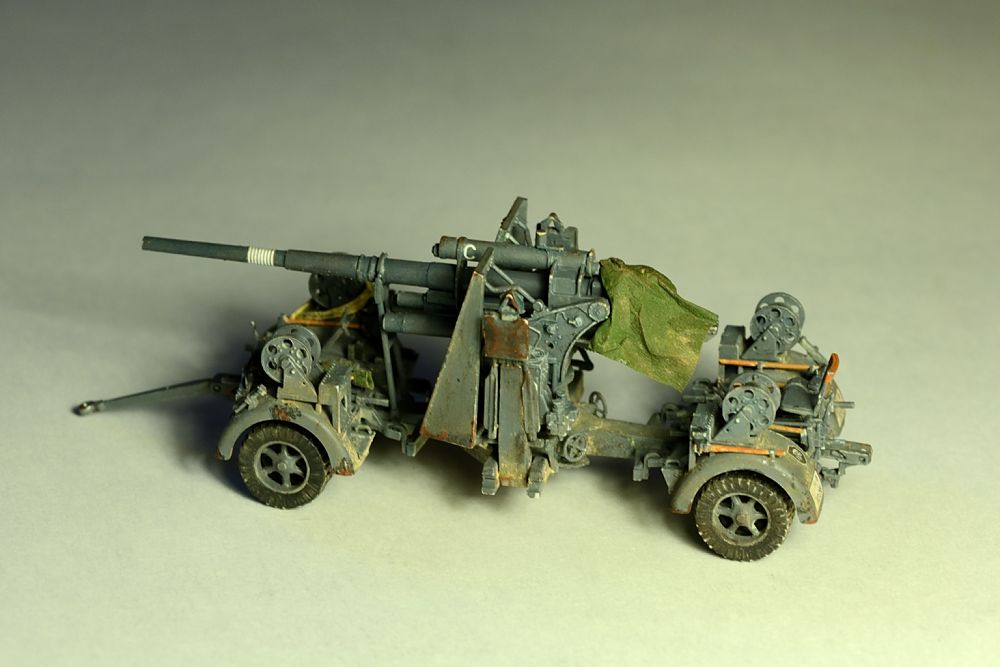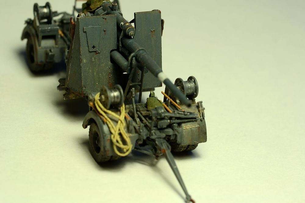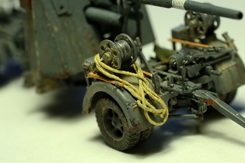 Окраска - эмали Ревелл, обгадинг - пигменты МИГ. Пара мелких дополнений: поскольку орудие находится в транспортном положении, на казенную часть кинул брезент. Из такого же "брезента" сделал мешочек с барахлом и подбросил на тележку.