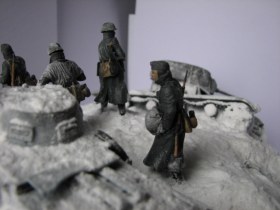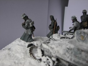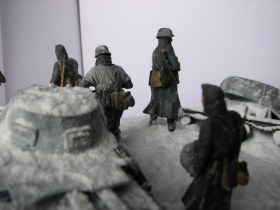 Долго разглядывал диораму и пытался понять что же рушит всю картину. И понял. Нет целинного снега. У Вас весь снег комковый, такой бывает если по нему потоптаться или если его откидывать лопатой. И если на дорожке, по которой топают фрицы это очень уместно, то вокруг брошенных танков и даже на них (см. лобовуха Т-26 и верх башни PZ-1) выглядит странно.