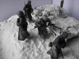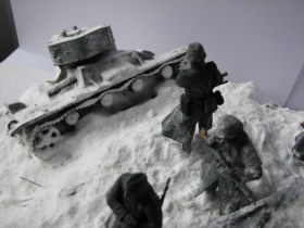 В работе использованы «набор замерзающих немцев» от МВ и звездовские танки (т-26 и Pz-l) с минимальными дополнениями. Всё красил звездовским акрилом. Ландшафт делал из пенопласта и мятой газеты смоченной в ПВА. Снег – сода.