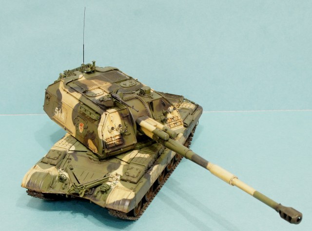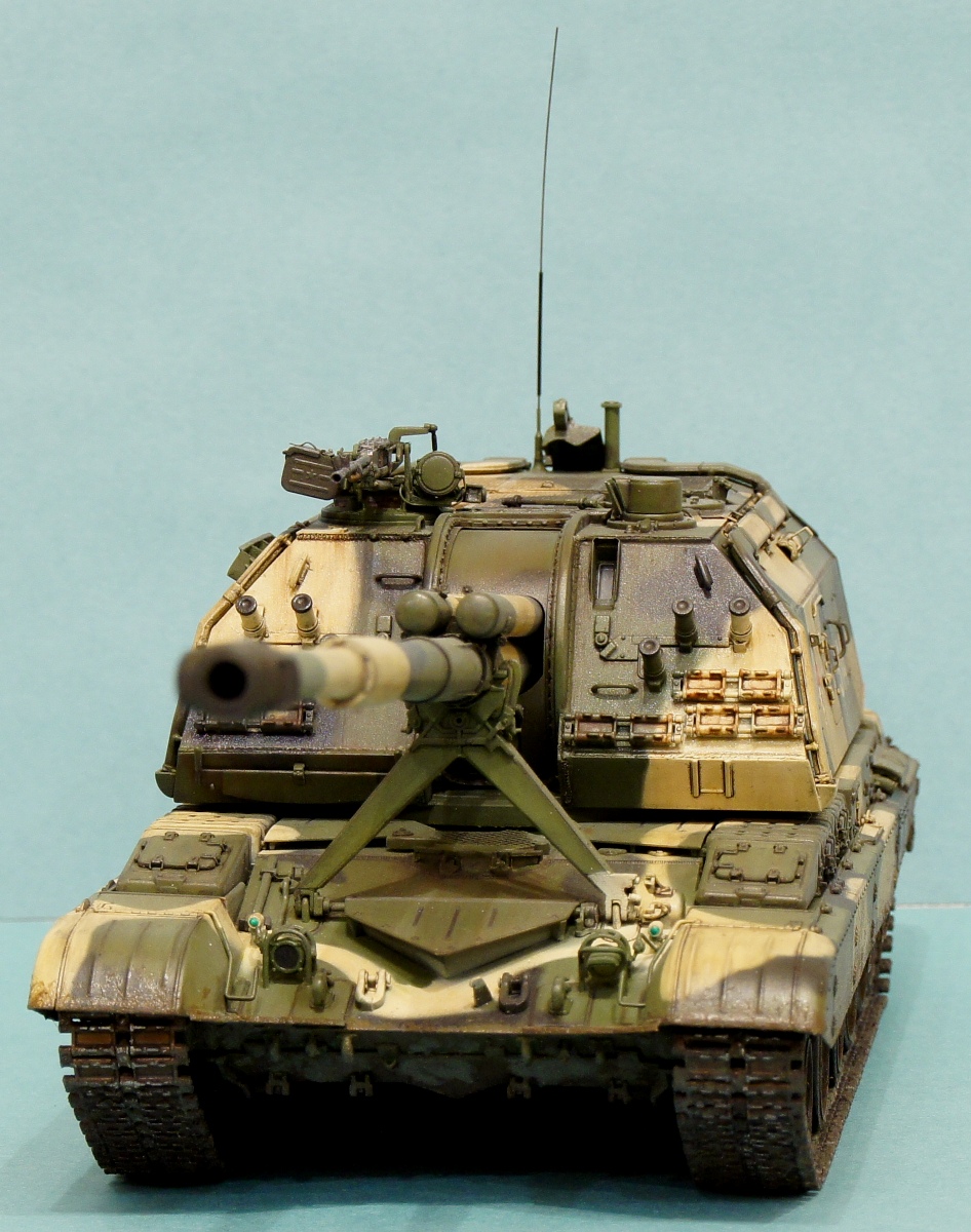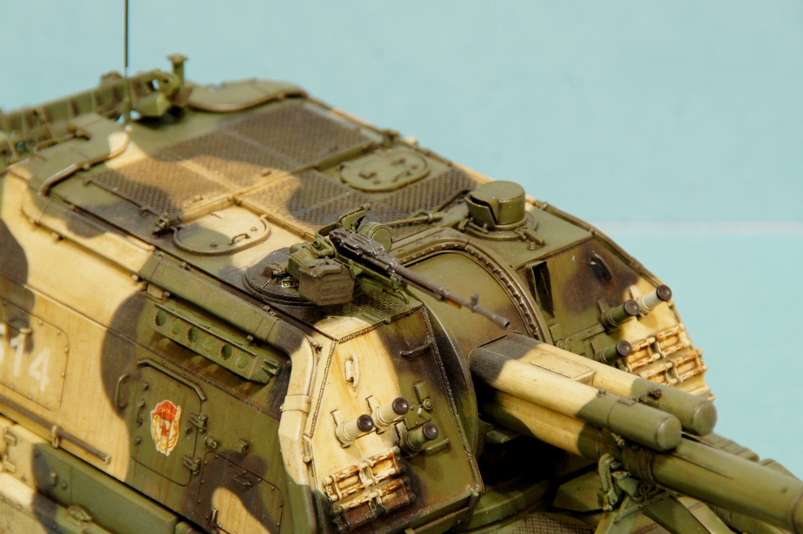 По окраски. Первый раз попробовал грунт и краску "Vallejo". Мне понравилось. Самое главное она разводится водой, но я использовал водку. Единственное под аэрограф она была слишком жидкая и получались кляксы. Но в процессе приноровился. Основным цветом (зеленый) модель покрыта полностью. Песочные пятна сделана по маскам. Черные пятна без масок. Далее фильтры, масляные точки красками "MIG". Матовый и глянцевый лаки "TAMIYA".